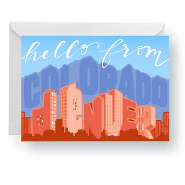 This Colorado card uses the Denver skyline and the Rocky Mountains to spell out the hand-lettered greeting - a must-have for gift shops, tourist hot spots, and anyone visiting the Mile High City. A2 card printed with rich, vibrant inks on thick, matte stock with a velvety soft-touch finish. Blank inside, comes with coordinating colored euro-flap envelope. About my greeting cards: - All my designs are hand-lettered and illustrated by me (no fonts or stock graphics, ever) - A2 cards measure 4.25x5.5 inches - Packaged in crystal clear protective sleeves that are commercially compostable - Designed and printed in Denver, CO - Blank inside