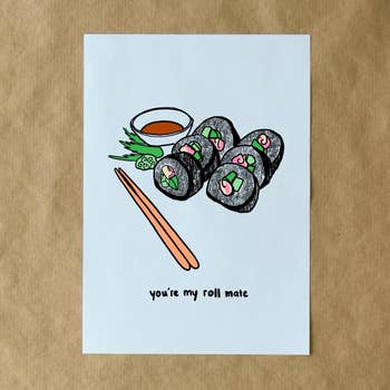 Cette illustration de sushi fait une douce carte d'amitié ou une note d'amour, avec le repas parfait pour deux. Carte A2 imprimée avec des encres riches et vibrantes sur un papier épais et mat avec une finition veloutée au toucher doux. Intérieur vierge, livrée avec une enveloppe euro à rabat coloré assorti. À propos de mes cartes de vœux : - Tous mes designs sont lettrés à la main et illustrés par moi (jamais de polices ou de graphiques de stock) - Les cartes A2 mesurent 4,25x5,5 pouces - Emballées dans des pochettes de protection en cristal clair qui sont compostables commercialement - Conçues et imprimées à Denver, CO - Intérieur vierge