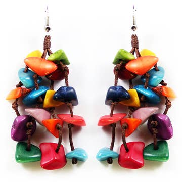 Brincos divertidos, divertidos e cheios de cor, estes brincos pendurados de borla tagua são feitos à mão com pequenos pedaços de noz tagua pendurados em quatro cordões de algodão. Achados de aço cirúrgico. Um acessório divertido e incomum que combina bem com qualquer roupa. Todas as contas de tagua usadas são sustentáveis, orgânicas, veganas e biodegradáveis: marfim 100% vegetal (sementes de Tagua). Esses brincos tagua são de comércio justo e eticamente feitos à mão na Colômbia. A Muichic Natural Jewelry é um membro orgulhoso da Fair Trade Federation. Quando maduras, as sementes de tagua são colhidas e secas por 6 a 9 meses. Depois de perder toda a umidade, eles se tornam sólidos como uma rocha, lembrando marfim em cor, textura e dureza, daí o apelido: “Marfim vegetal”. Neste ponto, as sementes duras podem ser polidas, tingidas, cortadas e moldadas em lindas contas que se tornam as jóias naturais de Muichic.