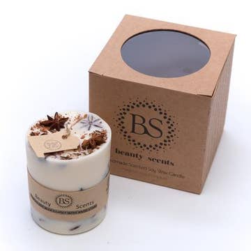 Handgjorda ljus var gjord av sojavax, doftolja och stjärnanis. Det vegetabiliska oljebaserade vaxet är starkt doftande och dekorerat. Brinntid upp till 40 timmar. Storlek 7,5 cm diameter, 8,5 cm höjd. Detta är handel erbjudande för fall av 6 ljus. Angivet pris är exklusive moms och fraktkostnader. Dessa kostnader läggs till i kassan.