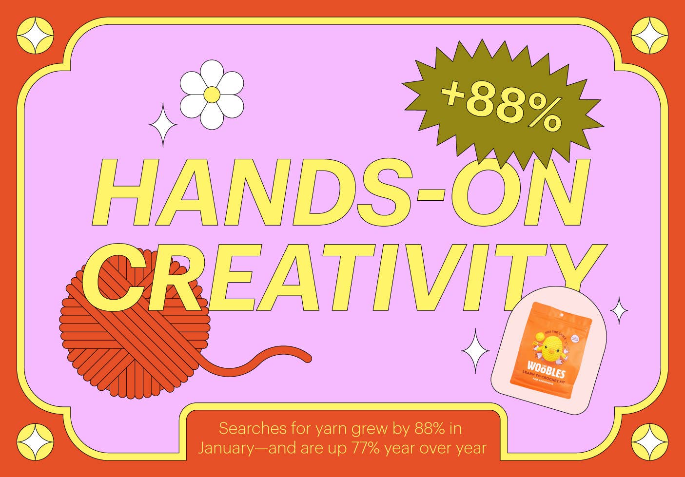 On Faire, searches for “yarn” and “embroidery” are at an all-time high, up 109% and 74% month over month, respectively. Of all products in the Crafts & Hobbies category in Q4, crochet sets topped the list, and searches for “crochet” skyrocketed 117% month over month in January.