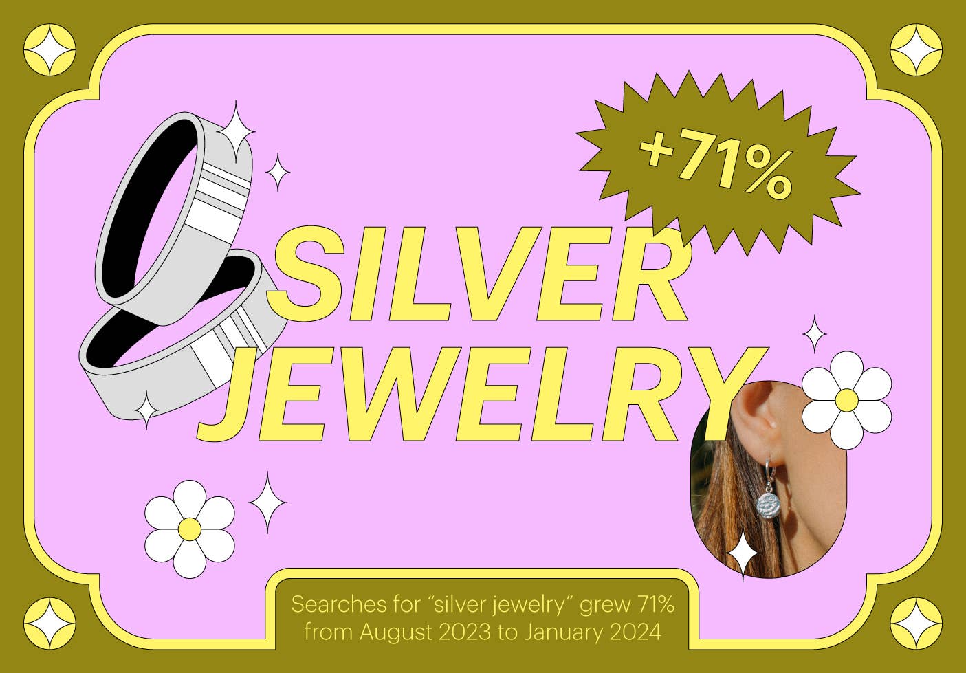 After steadily rising through the latter half of 2023, searches for “silver jewelry” on Faire spiked 64% month over month in January and were up 44% year over year. Pinterest is seeing a similar trend: Searches for “silver layered necklaces” are up 50%.