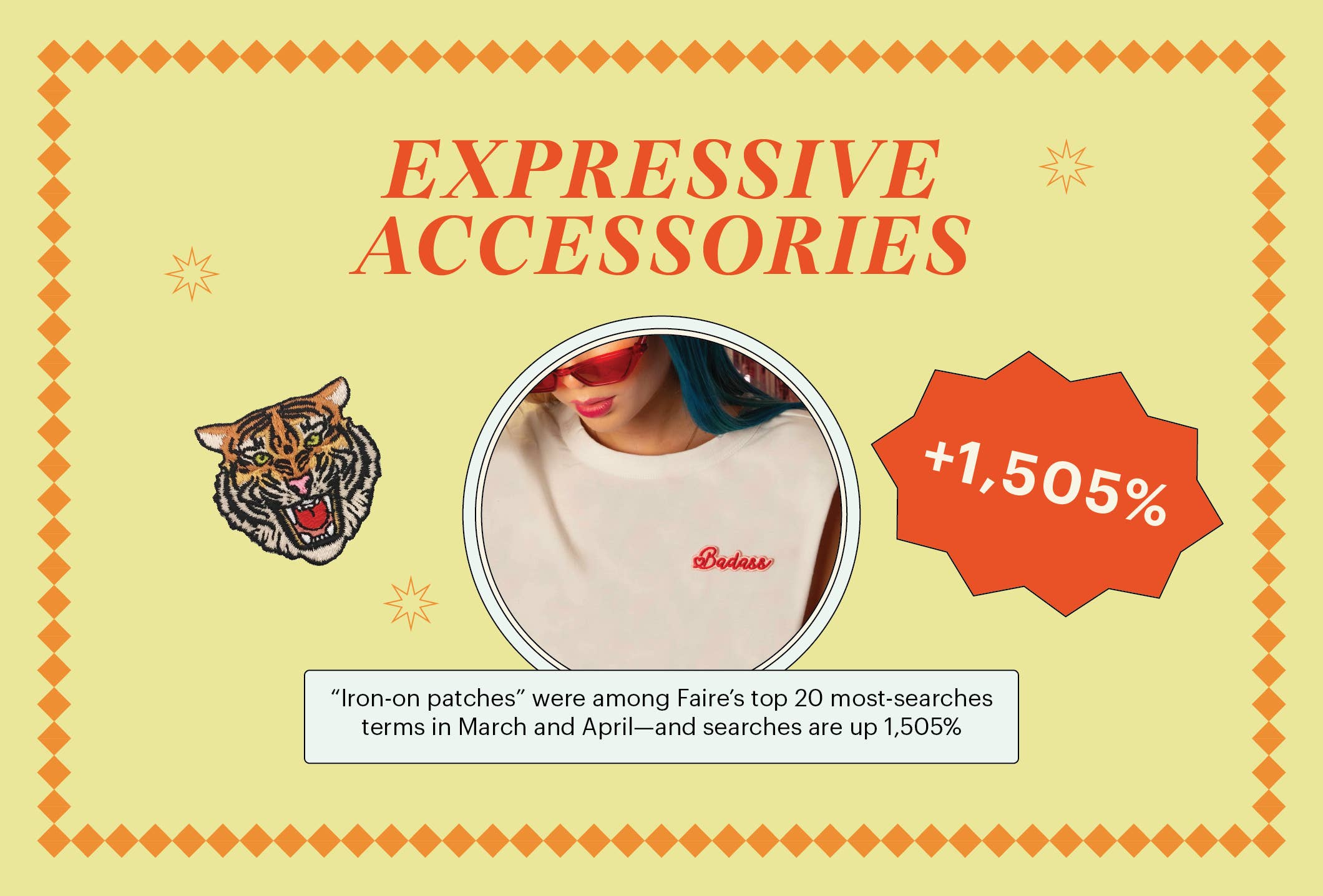 Another way shoppers are expressing themselves: iron-on patches, which were the 10th most searched term on Faire in March, up 1,505% year over year. Searches for hat patches also increased by 3,002%. “Patches have been around for a long time, and people are remembering how cool and easy they are to incorporate into your style without a high cost,” says Joanna Hullinger, creator of vintage patch purveyor Lucky Sardine. She notes that ocean-, desert-, mushroom-, and retro-themed looks are among her top sellers today.