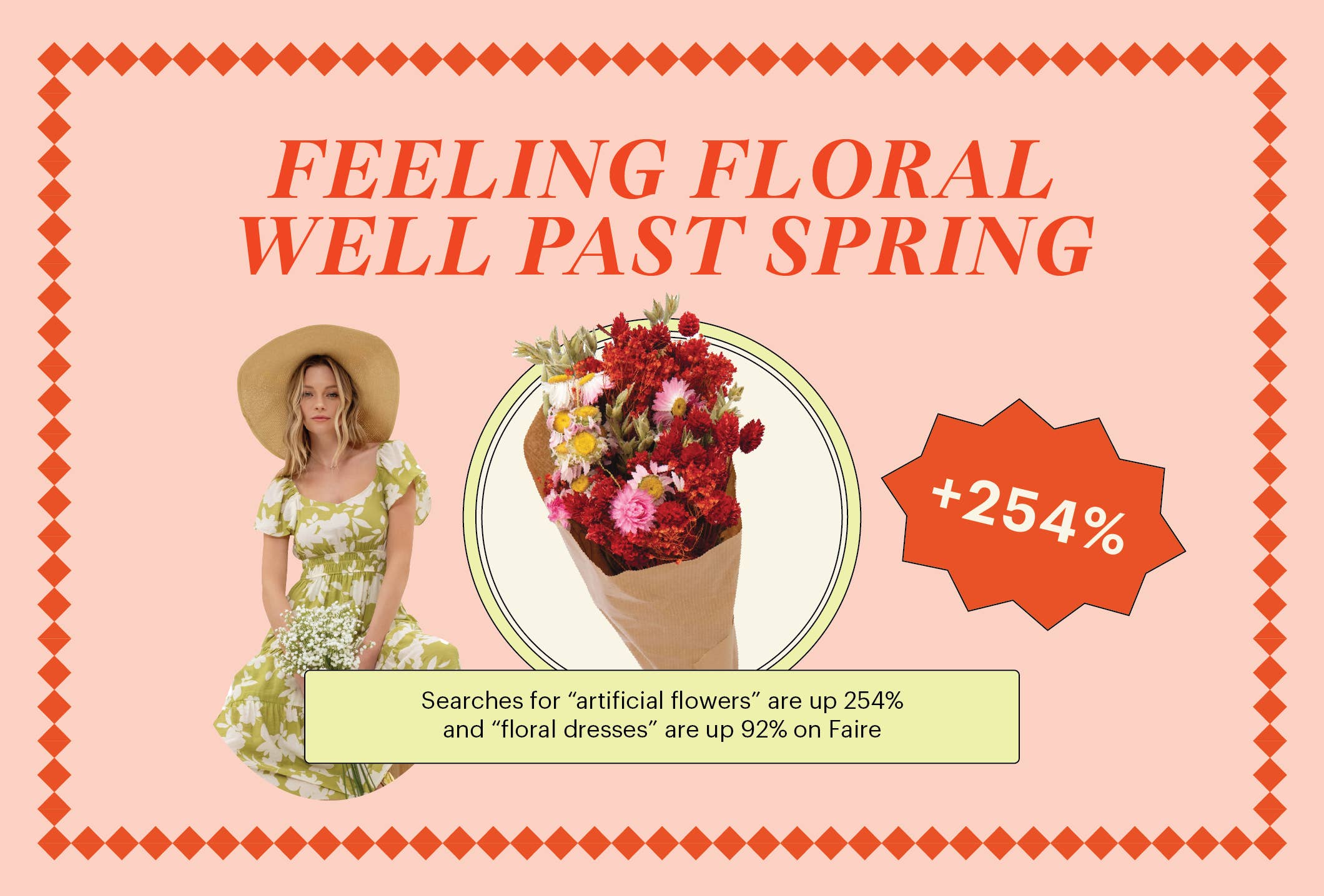 On Faire, floral dresses made it to the top five of all apparel items in March and April, and searches are up 92% (floral skirts and pants are up 105% and 95%, respectively).