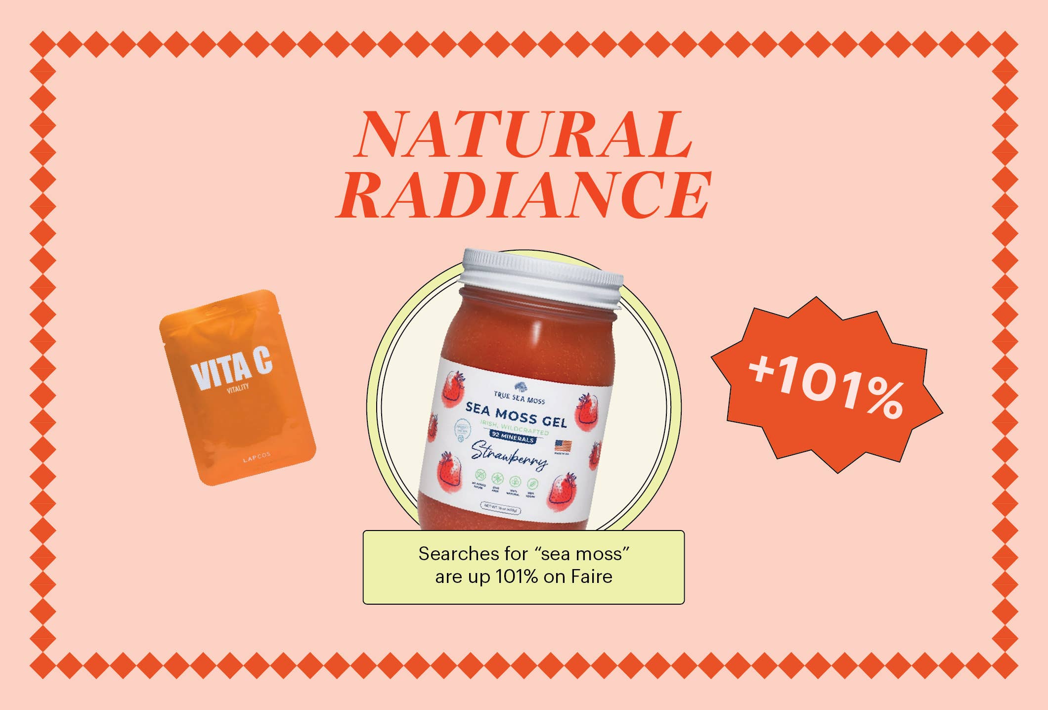 To maintain skin health inside and out, consumers are looking to the sea, as searches for sea moss have jumped on Faire, up 101%. On TikTok, the hashtag has 1.3 billion views and Vogue did a deep dive into the wellness trend to see just how impactful it can be. And it’s not just sea moss getting all the attention: Searches for other sea-derived ingredients like spirulina and algae reached all-time highs on Faire. (Especially as algae is being rebranded as the hottest new way to cook food at Eleven Madison Park.)