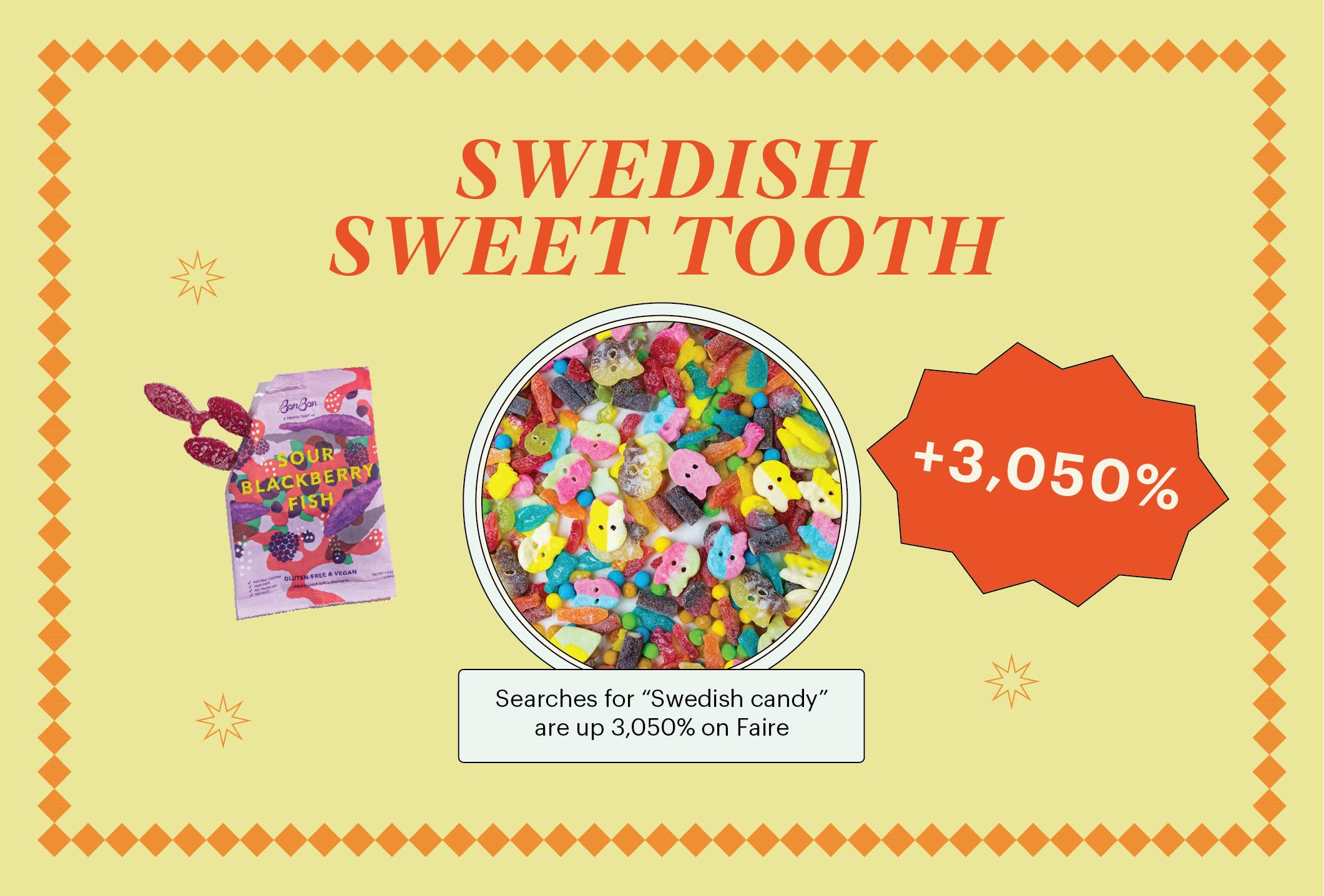 On Faire, searches for Swedish candy are up 3,050%, as shops are looking to stock sweet treats from Scandi makers. And unlike most American producers, many of these Swedish candy makers offer vegan, gelatin-free, and even organic options.