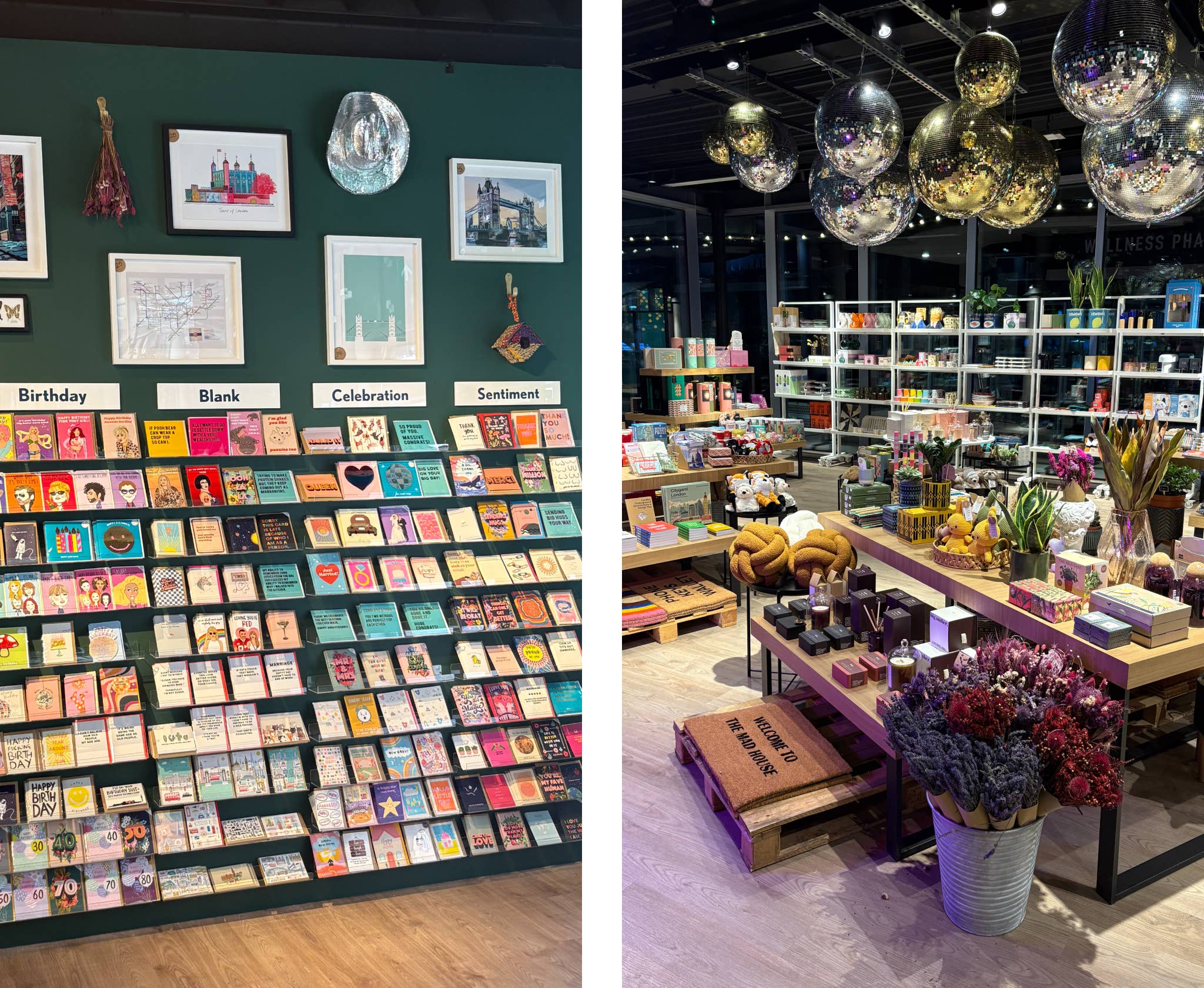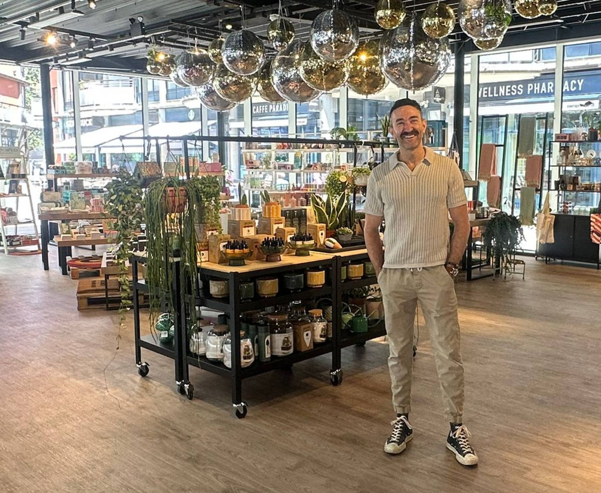 The 2,200-square-foot space had been empty since 2017, but Britt saw potential where others saw vacancy. Named after his partner’s grandmother Maxine and his own grandmother Betty, MAX + BETTY is now a vibrant gift boutique featuring 27 disco balls of various sizes across the ceiling, an extensive plant collection, and thoughtfully curated home accessories, greeting cards, and gifts for every occasion.