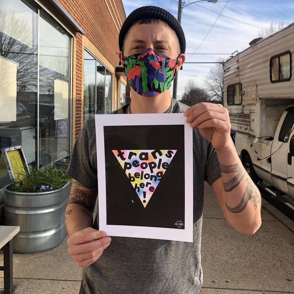 Since that first show, Ash and Chess have gone on to have their work sold in over 400 retailers throughout the U.S., Canada, Europe, and Asia. Their collection of work today ranges far beyond the few birthday cards they debuted in 2017, and they now often use their work to promote causes important to them. They create art prints with uplifting and self-empowering phrases, stickers that share statements like “ask me about my pronouns,” and “happy to be queer,” and t-shirts reading “trans people belong here,” and “every body is a good body.” All of these items are available to consumers on their website, along with products from some of their many successful collaborations. In the past years, they’ve created art for tote bags with The Belletrist, a book club run by actress Emma Roberts and Karah Preiss, t-shirt designs for The Style Club x Forever21, and apparel designs for San Francisco clothing company, Nooworks.