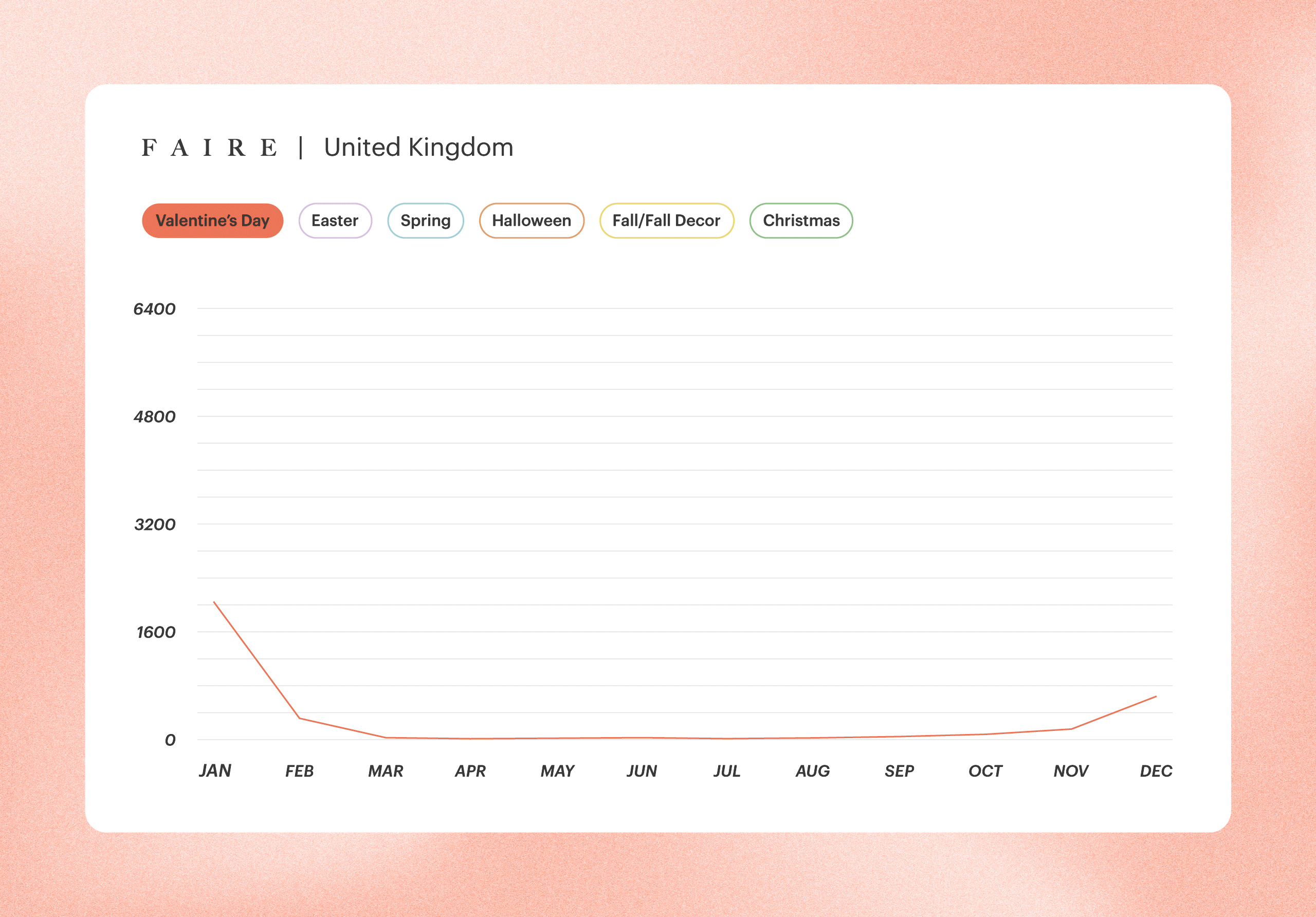 UK holiday searches begin building in early summer and intensify quickly heading into fall. Demand is already elevated by September and peaks in October, making September and October the most competitive wholesale buying months of the year.