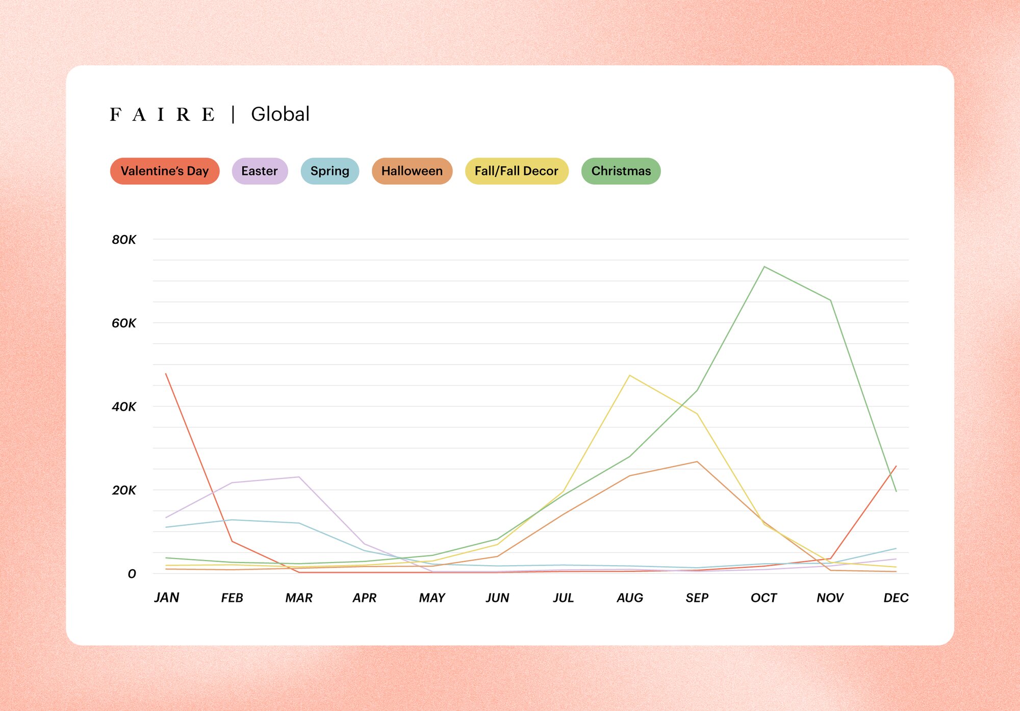 This calendar is informed by aggregated global search activity on Faire, which reflects when retailers are actively planning and sourcing inventory.