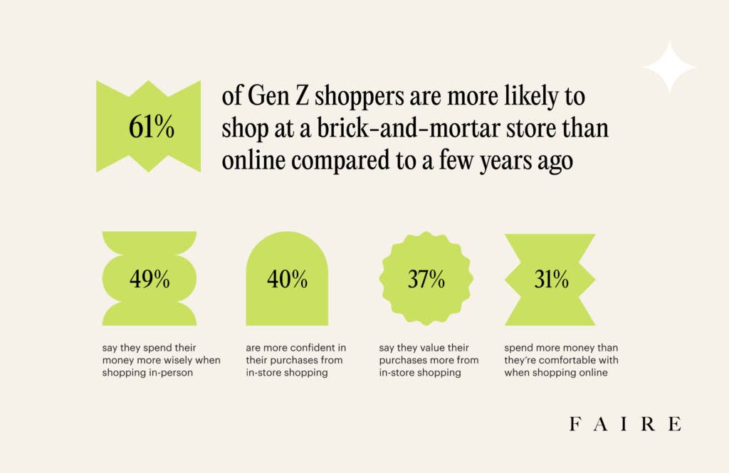 As this wider “value” landscape shifts, the retail landscape is adapting to these new considerations around money and how to spend it. The pandemic’s pendulum swing toward e-commerce is swinging back toward in-person shopping. Brick-and-mortar sales grew faster than e-commerce sales in 2021 for the first time ever—in part, a product of Gen Zers’ realization that they’re more discerning offline, with 49% saying they spend more wisely when shopping in person and 40% saying they’re more confident in purchases made in person.