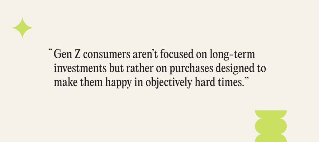 This tension around spending is leading to a reappraisal of what “value” means to Gen Z shoppers. Forty-five percent of Gen Z “don’t see a point in saving until things return to normal,” suggesting that “normal” approaches to spending, saving, and value have been suspended. With 91% of Gen Zers reporting that the cost-of-living crisis has affected the way they spend, this generation isn’t focused on long-term investments but rather on purchases designed to make them happy in objectively hard times.