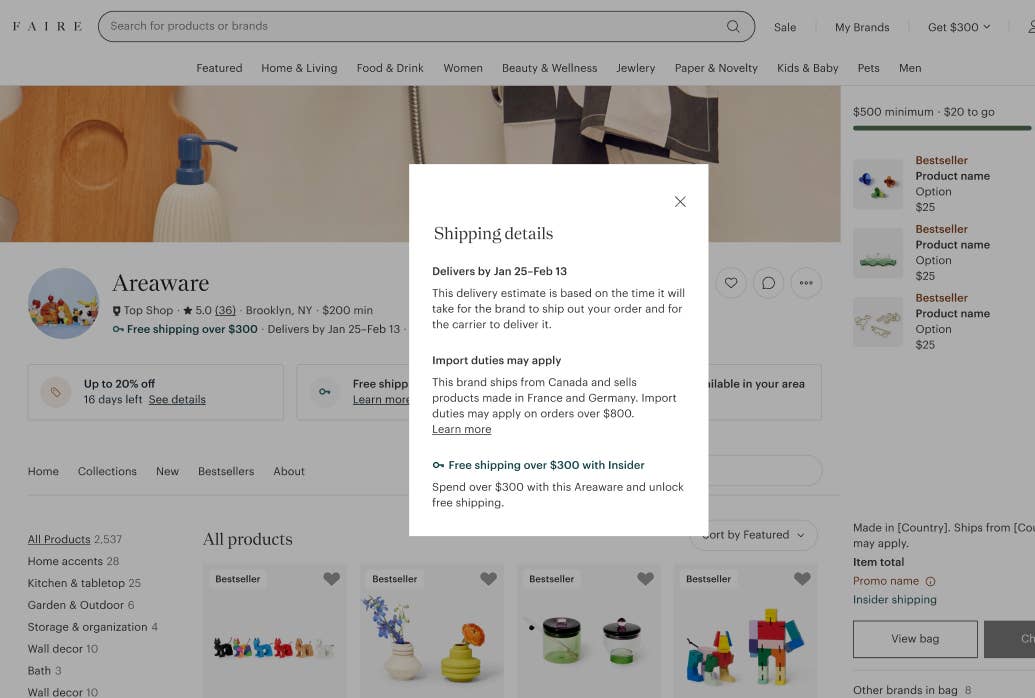 We’ve also made it easier to identify when duties apply upfront. U.S. retailers will now see duty information directly on product and brand pages—before adding items to the cart. These estimates are powered by the latest data from the International Trade Administration, helping retailers trust that they’re getting the most up-to-date rates when shopping on Faire.