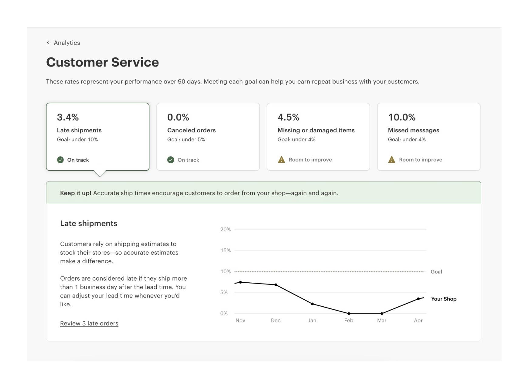 We’ve made it easy for brands to monitor where their shop is performing well on customer service and identify areas for improvement. You’ll see one of three colored indicators next to each service metric in your Analytics Page: