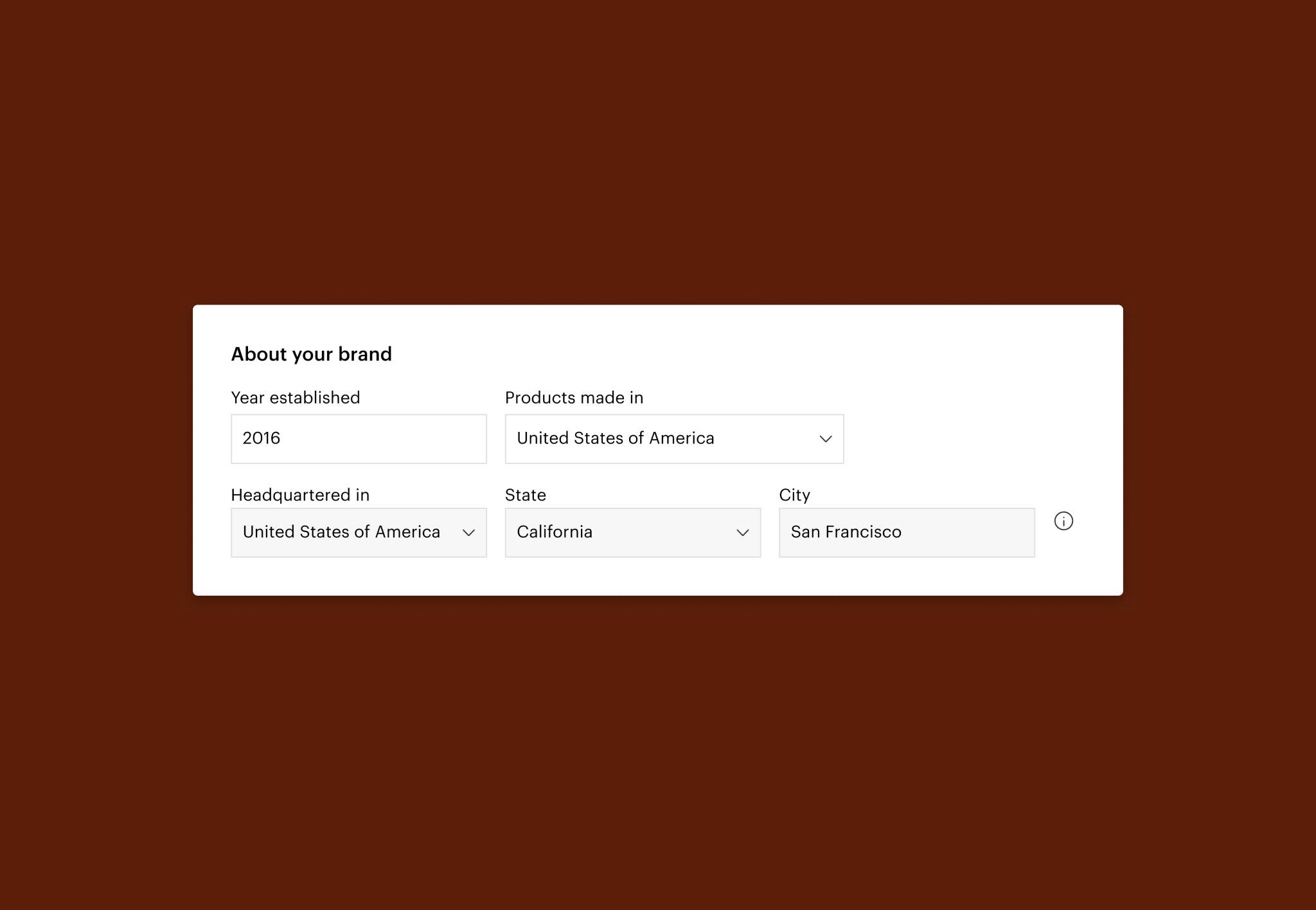 - Based In: Use this to represent the location of your brand’s headquarters or primary business operations. This supports buyers looking for local brands to feature in their shops. For example, if your HQ is based in Colorado but your products are made elsewhere, this helps buyers distinguish you as a local brand if they’re also based in Colorado.