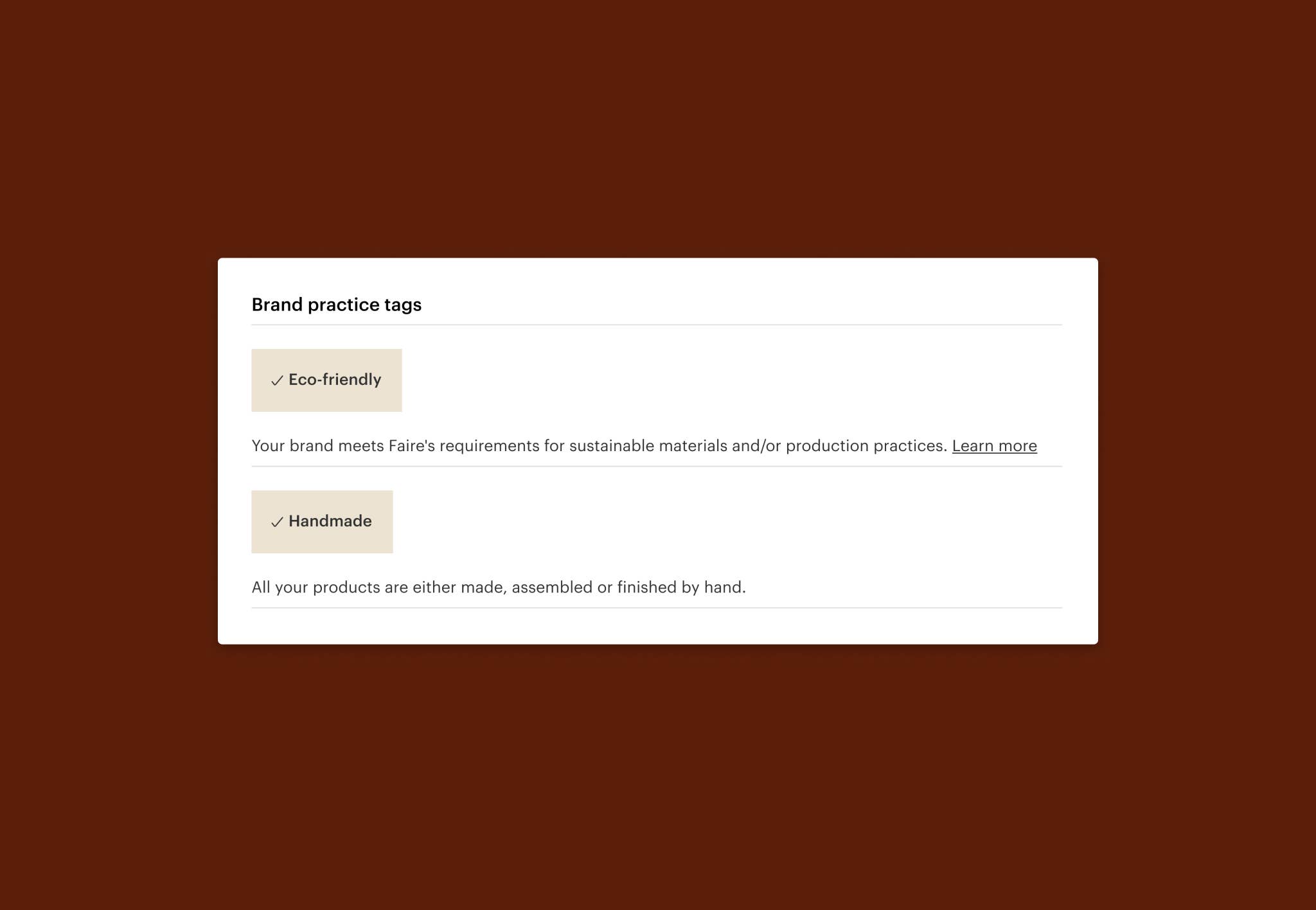 Brand value tags are a simple way to announce your values, so retailers who share those values or align from a brand perspective can find you. Meanwhile, inaccurate tags can cause retailers to lose trust—or miss you altogether.