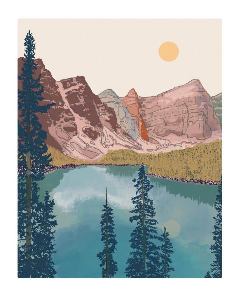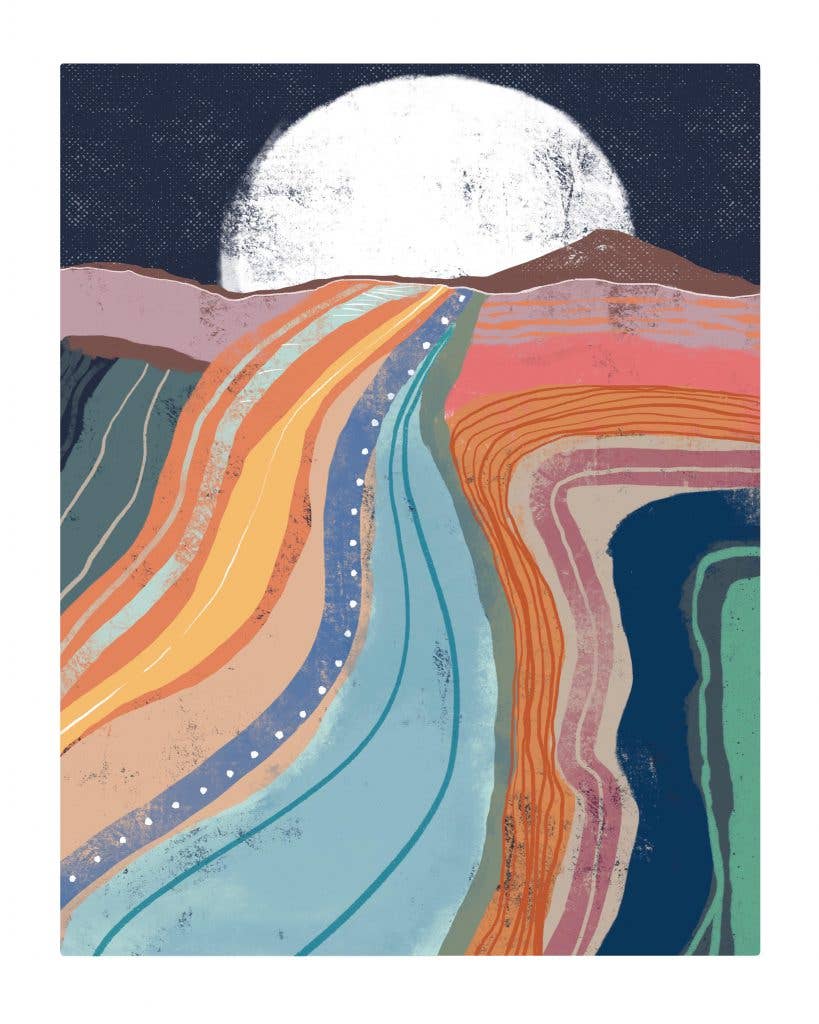 For Walker, the creative process involves first shooting photographs for inspiration. Then, he brings the scenes to life using pen and ink, acrylic paint, and digital editing. His color palette incorporates desert hues, pastels, and earth tones.