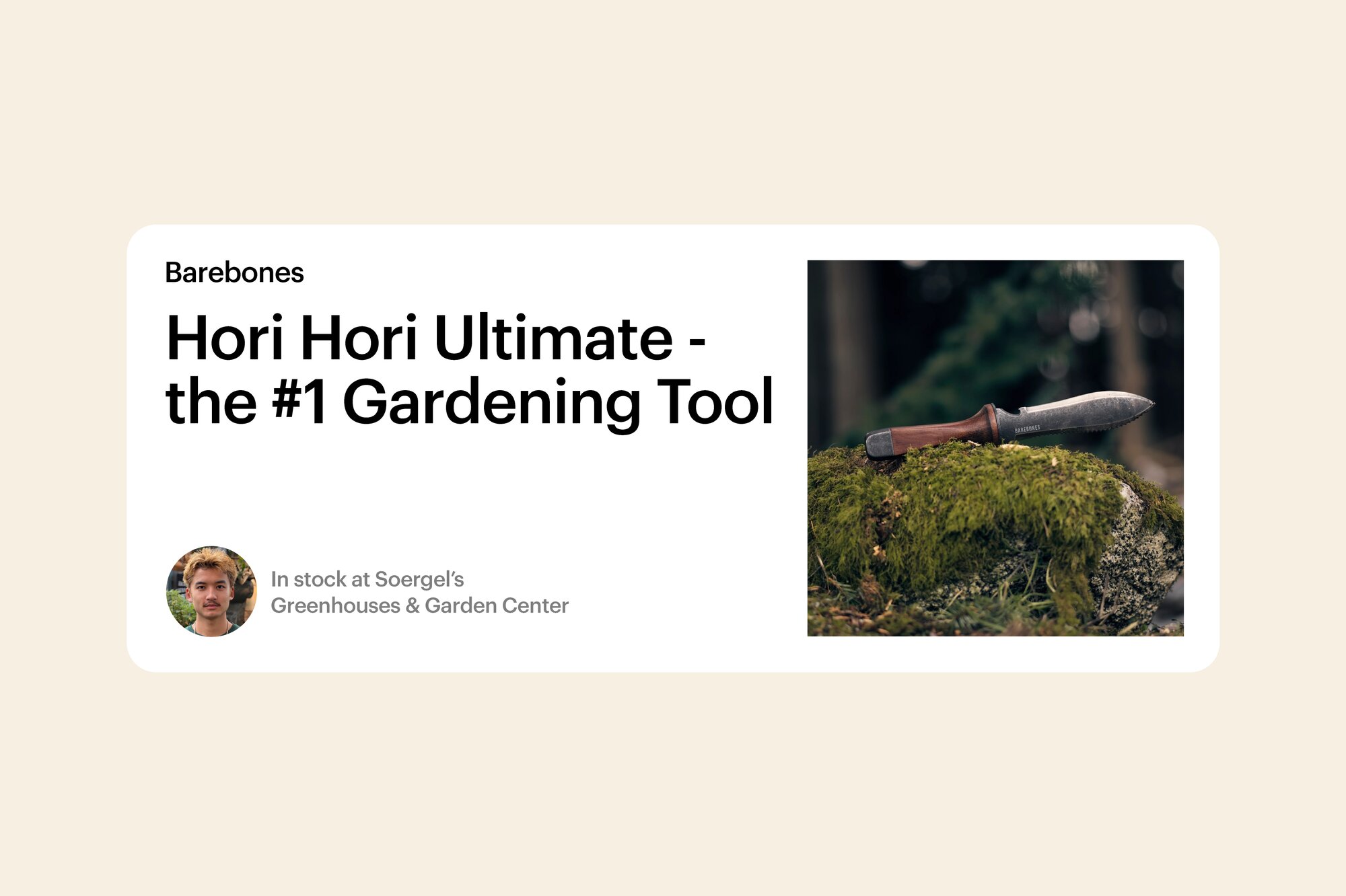 Kevin says he’s always excited to see what’s new in stock at Barebones and loves all its products. “They’ve got this really cool Hori Hori that’s basically my favorite tool,” he says. “It’s almost like a knife-shovel mix and is really good for gardening. It is just so phenomenal.” But Kevin makes shelf space for an even broader range of Barebones tools. “They’ve got weeders and different gardening tools, clippers and artisan shears, and they’ve even got this really cool lighter. I’m just so obsessed with their whole brand because it’s built to last, and everything about Barebones has the look. It’s just classic.”
