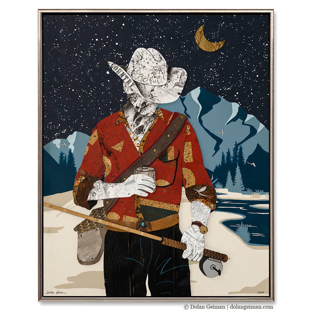 Weaving together a love for folktales, myths, & the natural world with a desire to translate found materials into works of art, Dolan Geiman speaks the language of paper, wood, & metal. Each work of art is handcrafted from an array of materials salvaged & collected from abandoned farms, warehouses, & forgotten fields. From paper collages to metal wall sculptures, the artwork weaves tales of bygone eras & untamed wilderness in an attempt to ignite our sense of wonder for the rugged American landscape & its icons. ★STOCKISTS★ REST ASSURED: WE OFFER EXCLUSIVITY For more wholesale terms and exclusivity details, see https://dolangeiman.com/pages/stockist-guide Unframed prints ship in 4-7 days | Canvas prints ship in 3 weeks | Made-to-order originals ship in 10-12 weeks Our opening order minimum is $550; there are no re-order minimums. Dolan Geiman only accepts orders from brick & mortar retailers with regular store hours at this time.