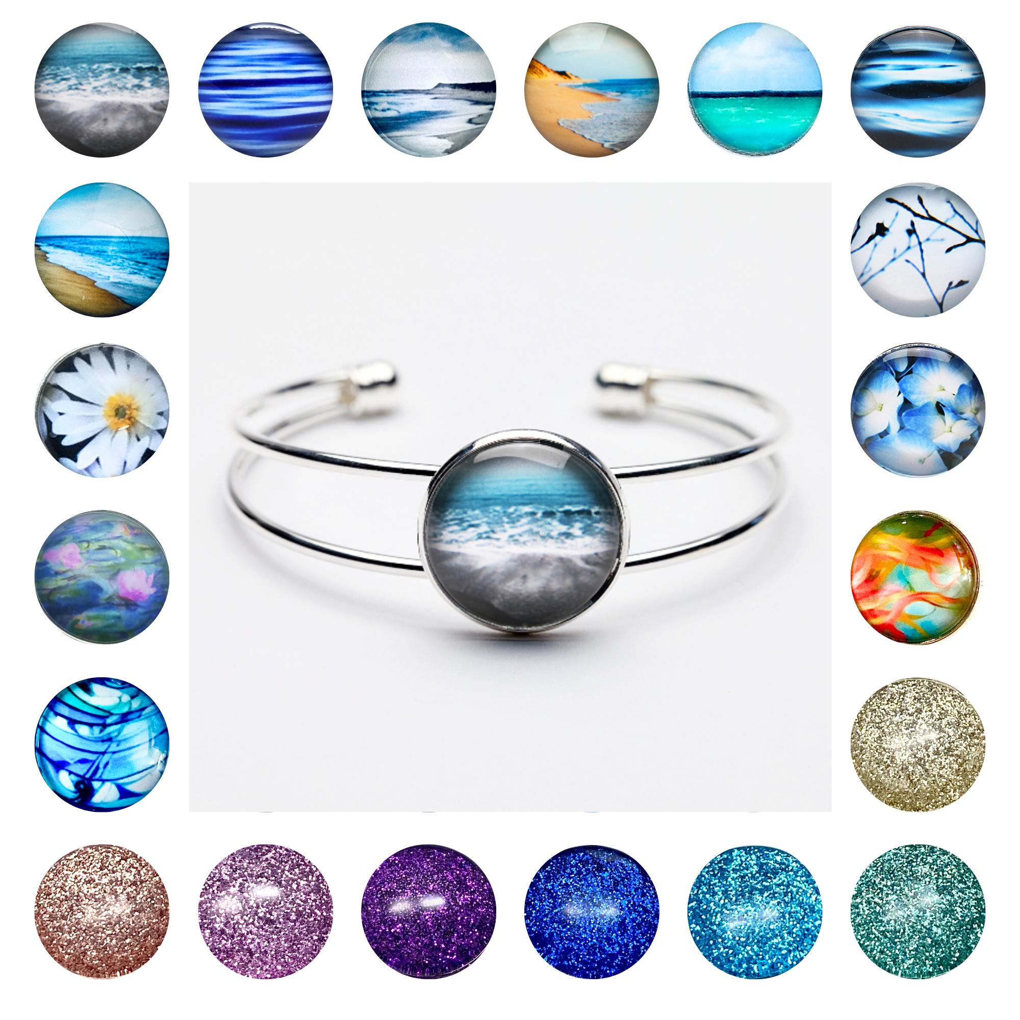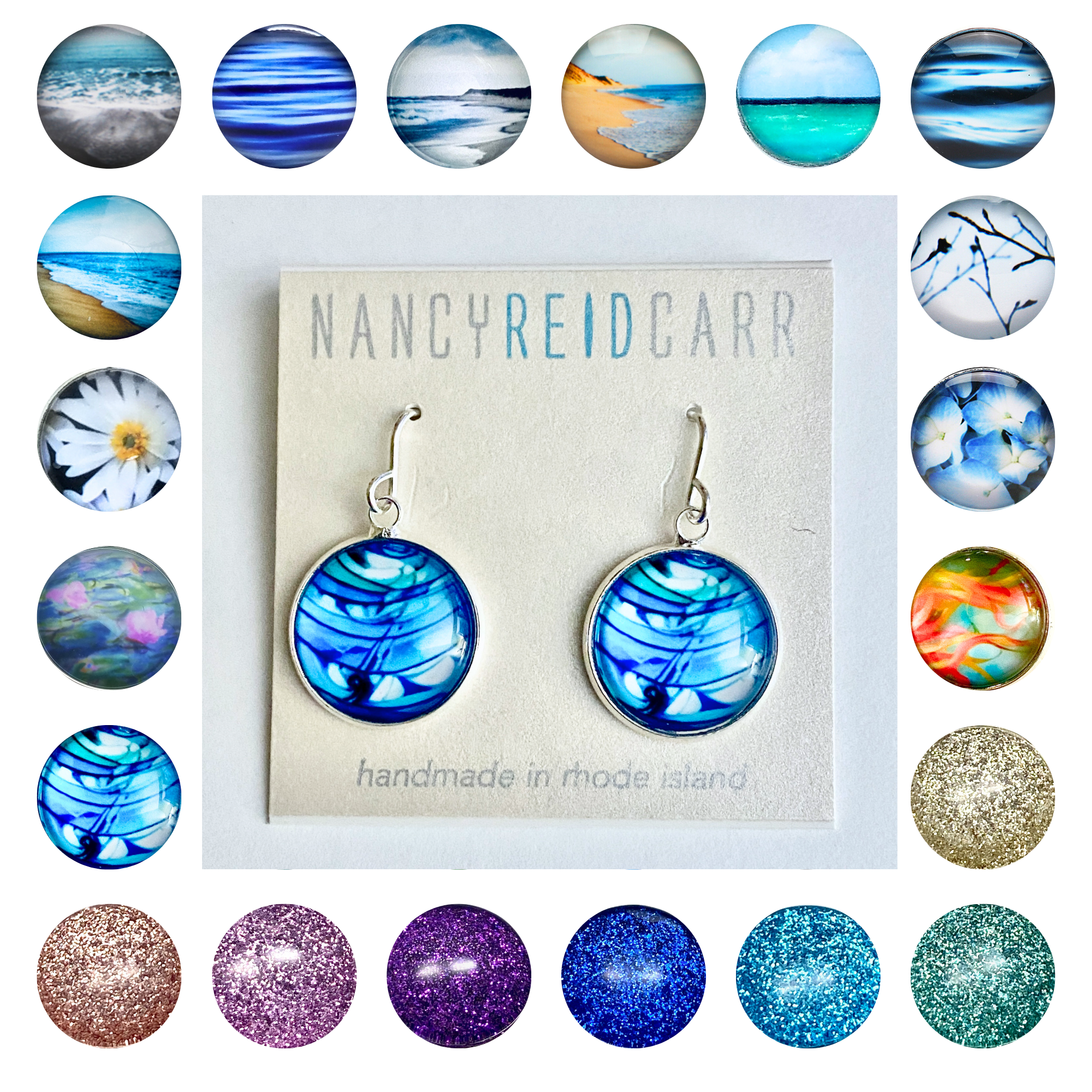 Nancy Reid Carr is a Rhode Island artist and mother of two daughters. She has been working as an artist for nearly 20 years. The imagery she creates is quiet and serene with a distinct focus on color, texture & composition. Simplicity in design combined with her chosen materials of metal, glass and metallic paper offer a fresh, modern aesthetic. The aluminum cuff bracelets have a natural metallic base that is coated with a scratch resistant emulsion which receives the ink through a heat transfer process, exhibiting vibrant color & detail. These cuffs are smooth, comfortable and highly flexible. The glass and silver jewelry line is made with imagery on metallic paper then displayed under a dreamy convex magnifying glass.
