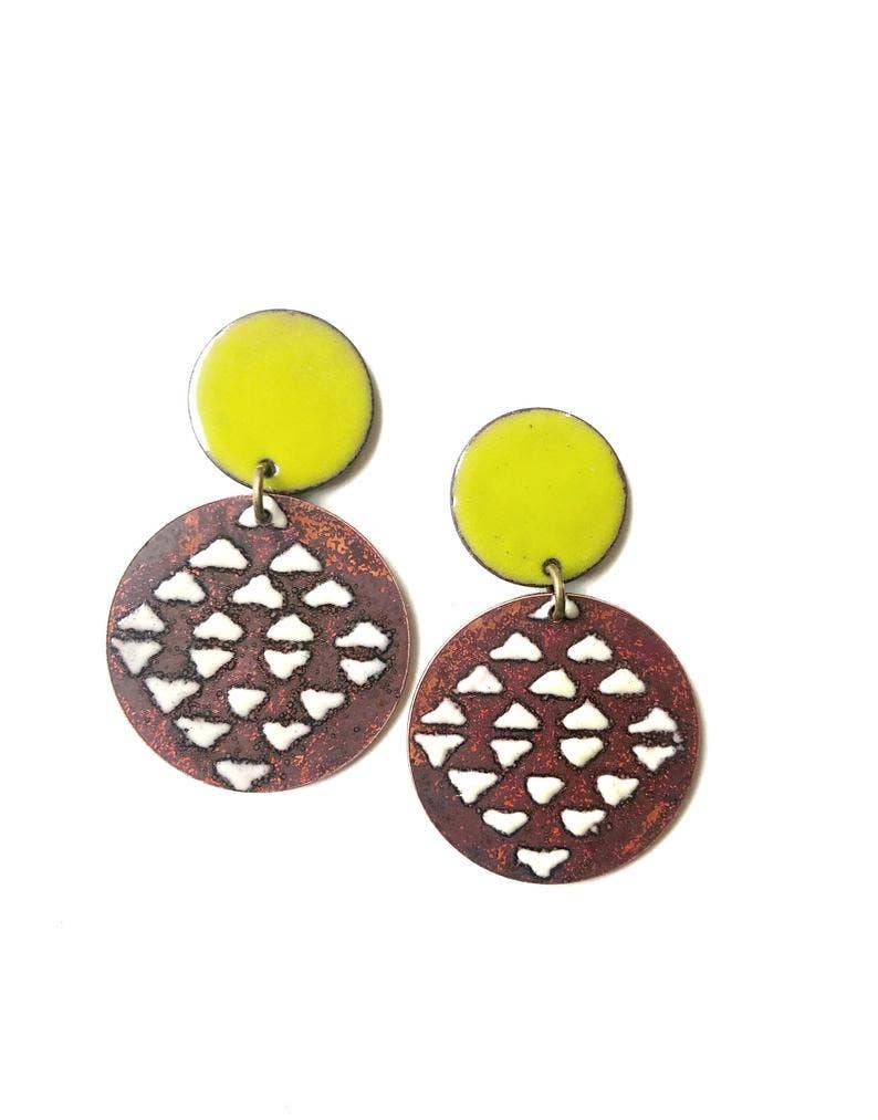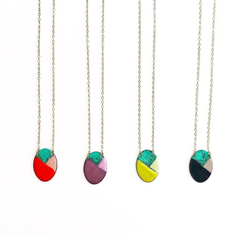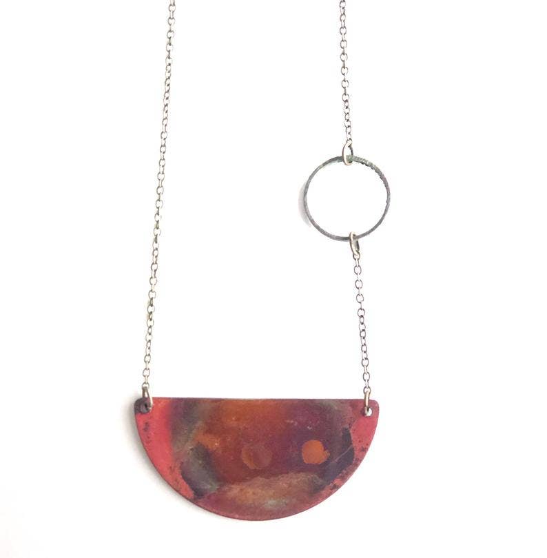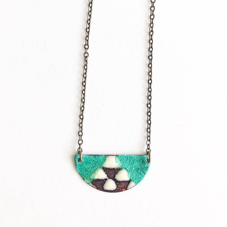 Hello and welcome! Courtney has been handcrafting jewelry for over two decades. Based in Michigan, she works from her home studio where she lives with her husband, their eleven year old daughter, and their two dogs. Courtney’s pieces are known for their unique blend of antiqued charm and modern design. Each item is thoughtfully hand-forged, reflecting her love of color and nature. Her reversible enamel necklaces are a signature element designed to be worn either way, offering versatility and beauty in one piece. Courtney creates small, wearable works of art meant to be cherished every day.
