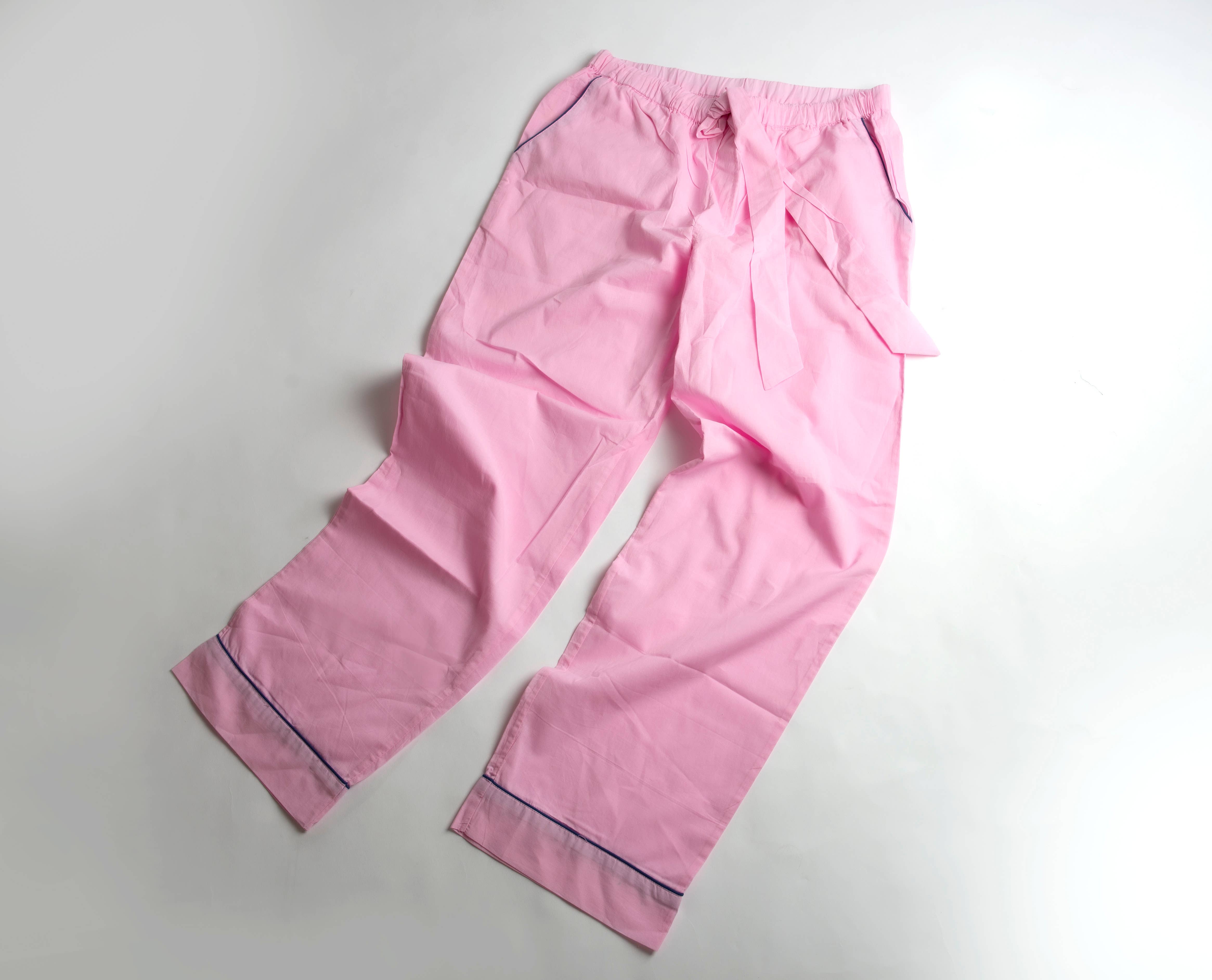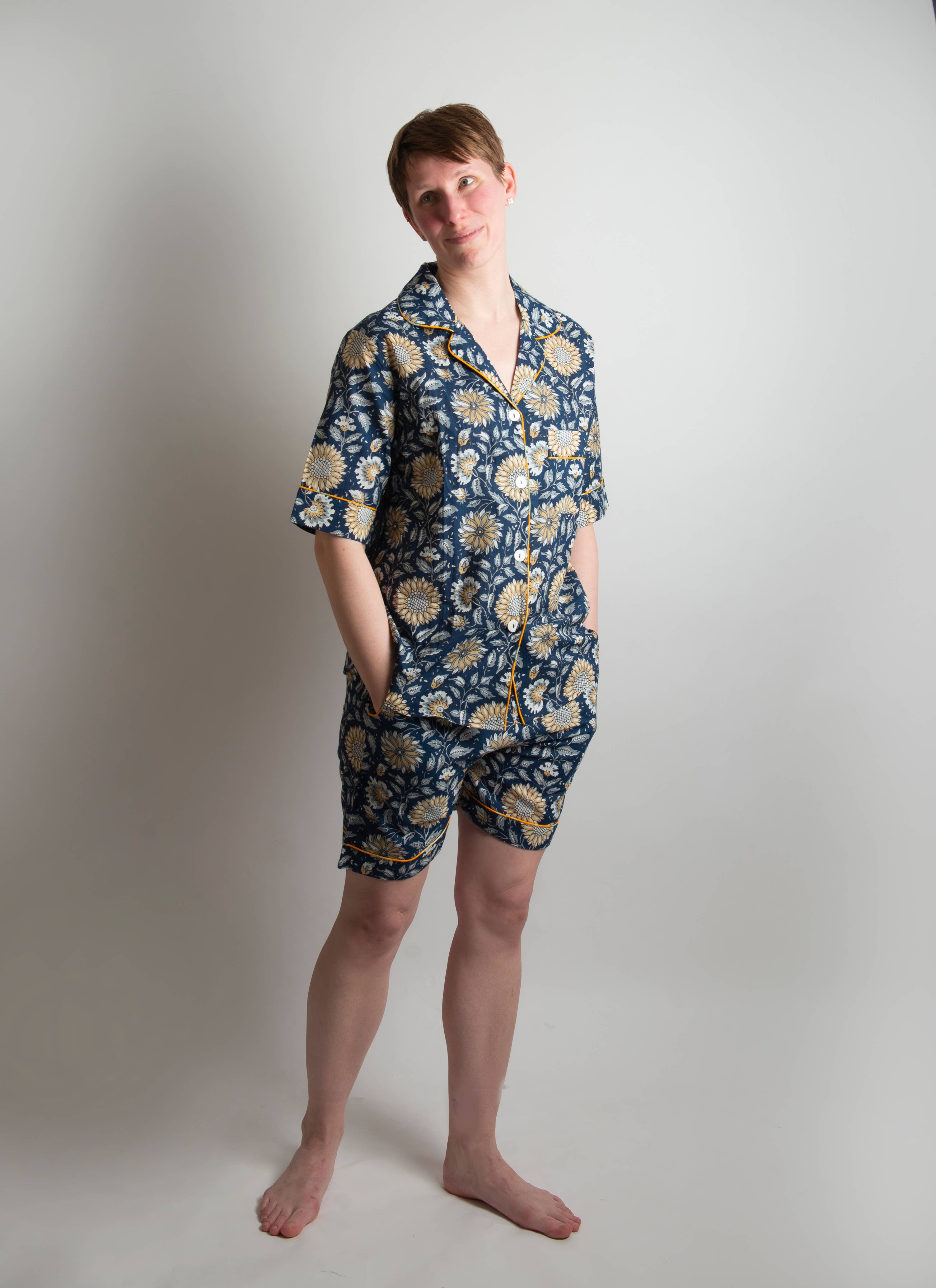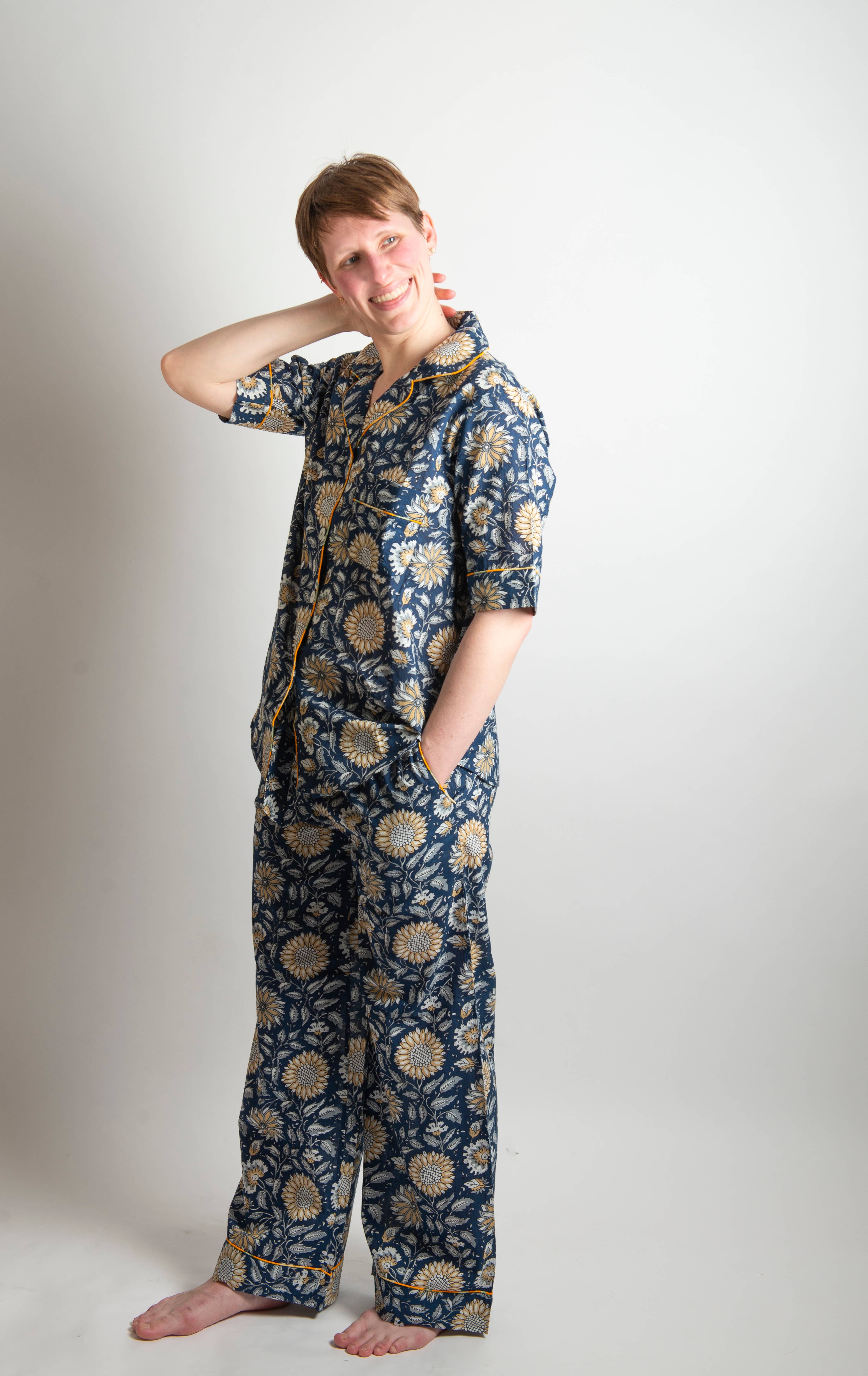 Our pajamas and loungewear are crafted in small batches from 100% breathable cotton, with beautiful details such as mother of pearl buttons and French seams. Our products are made exclusively from pre-existing materials to eliminate dye pollution, and produced in close partnership with small family-run factories in India. Every detail reflects our values: fair labor practices, sustainability, and zero plastic - right down to the hand-knotted cotton label threads. Lounge, sleep, stretch, live! Our loungewear is made to move with you and keep you comfortable. With 100 percent pure cotton fabrics and a commitment to sustainability, you can feel good while feeling good about what you wear.