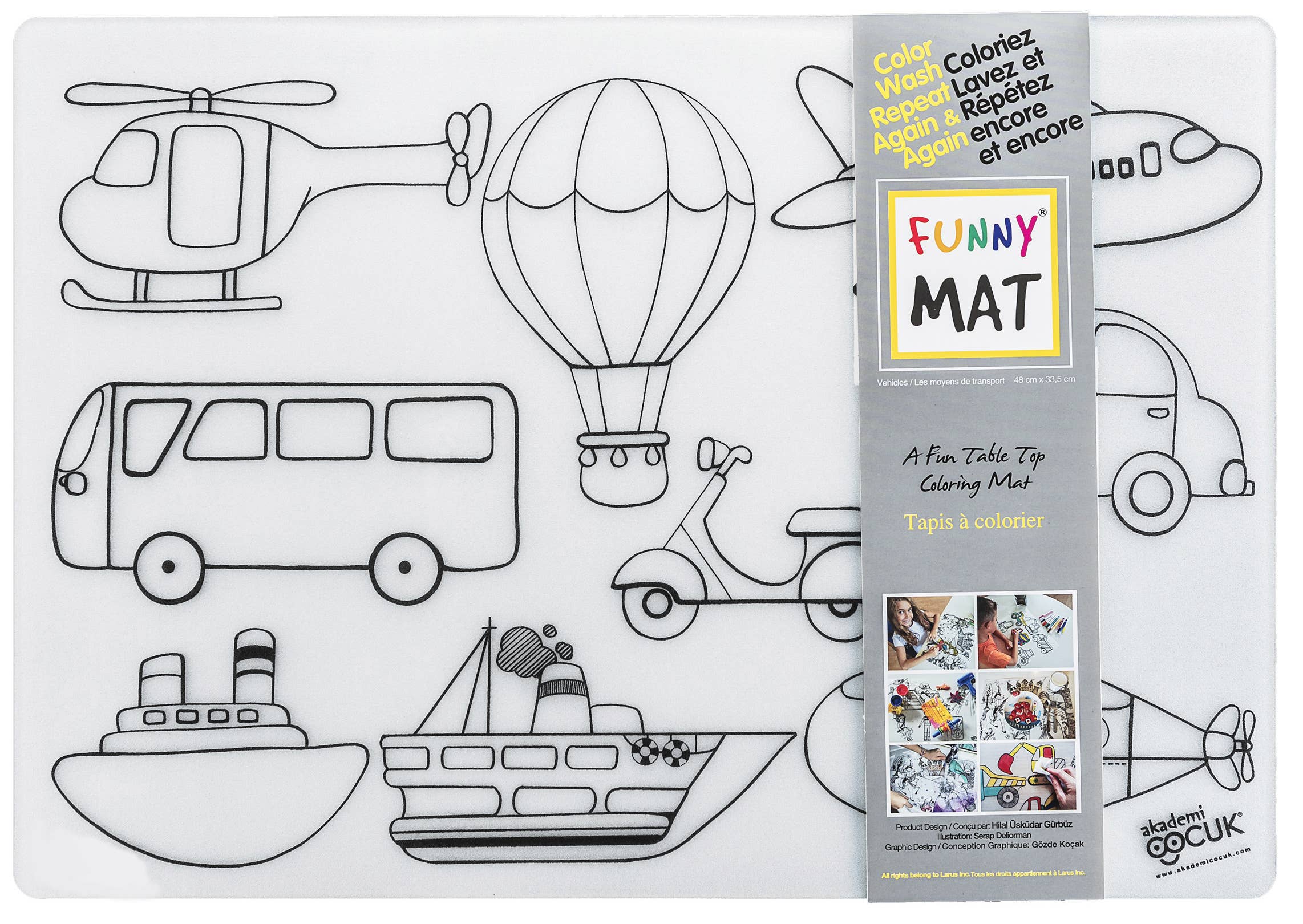 Funny Mat® distributed by Crestar Ltd. in North America, is a line of washable & reusable colouring products designed to help children's personal development, enhance their creativity & increase their cognitive & motor skills at the same time. The product line includes clear, white or black tabletop mats printed with original copyrighted black & white designs, washable colouring puzzles, mini spiral notebook sets, T-shirts, Never Ending Notebooks and Never Ending Art Books. Funny Mat® products are made of polypropylene and, therefore, recyclable.