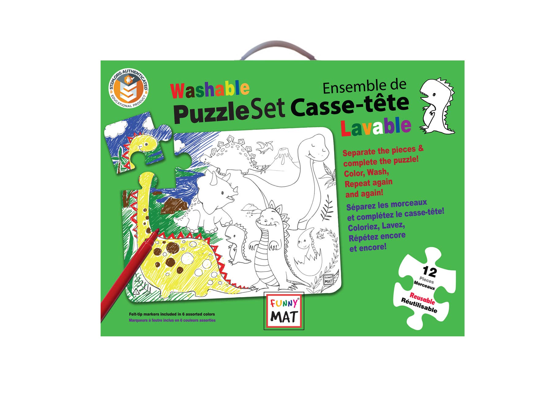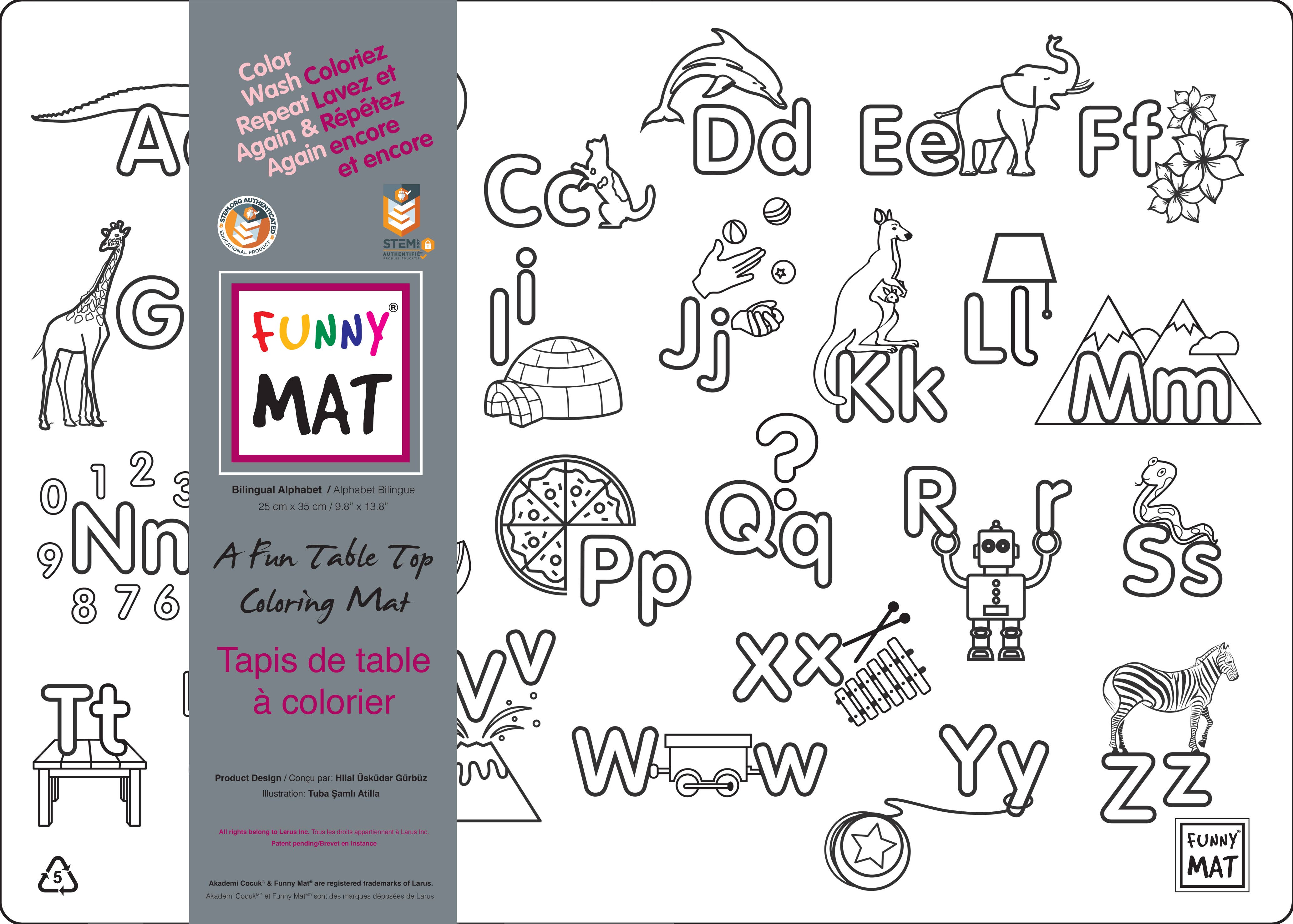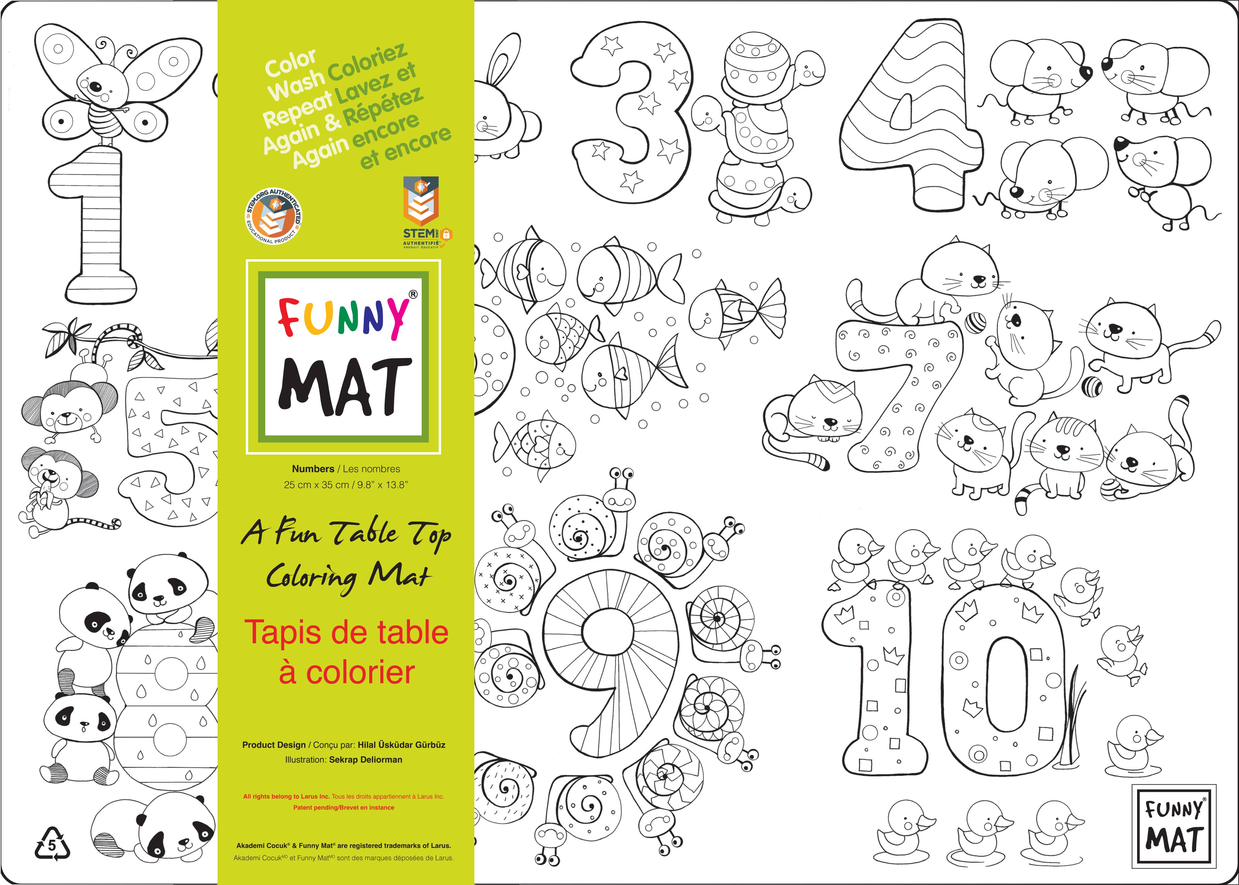 Funny Mat® distributed by Crestar Ltd. in North America, is a line of washable & reusable colouring products designed to help children's personal development, enhance their creativity & increase their cognitive & motor skills at the same time. The product line includes clear, white or black tabletop mats printed with original copyrighted black & white designs, washable colouring puzzles, mini spiral notebook sets, T-shirts, Never Ending Notebooks and Never Ending Art Books. Funny Mat® products are made of polypropylene and, therefore, recyclable.