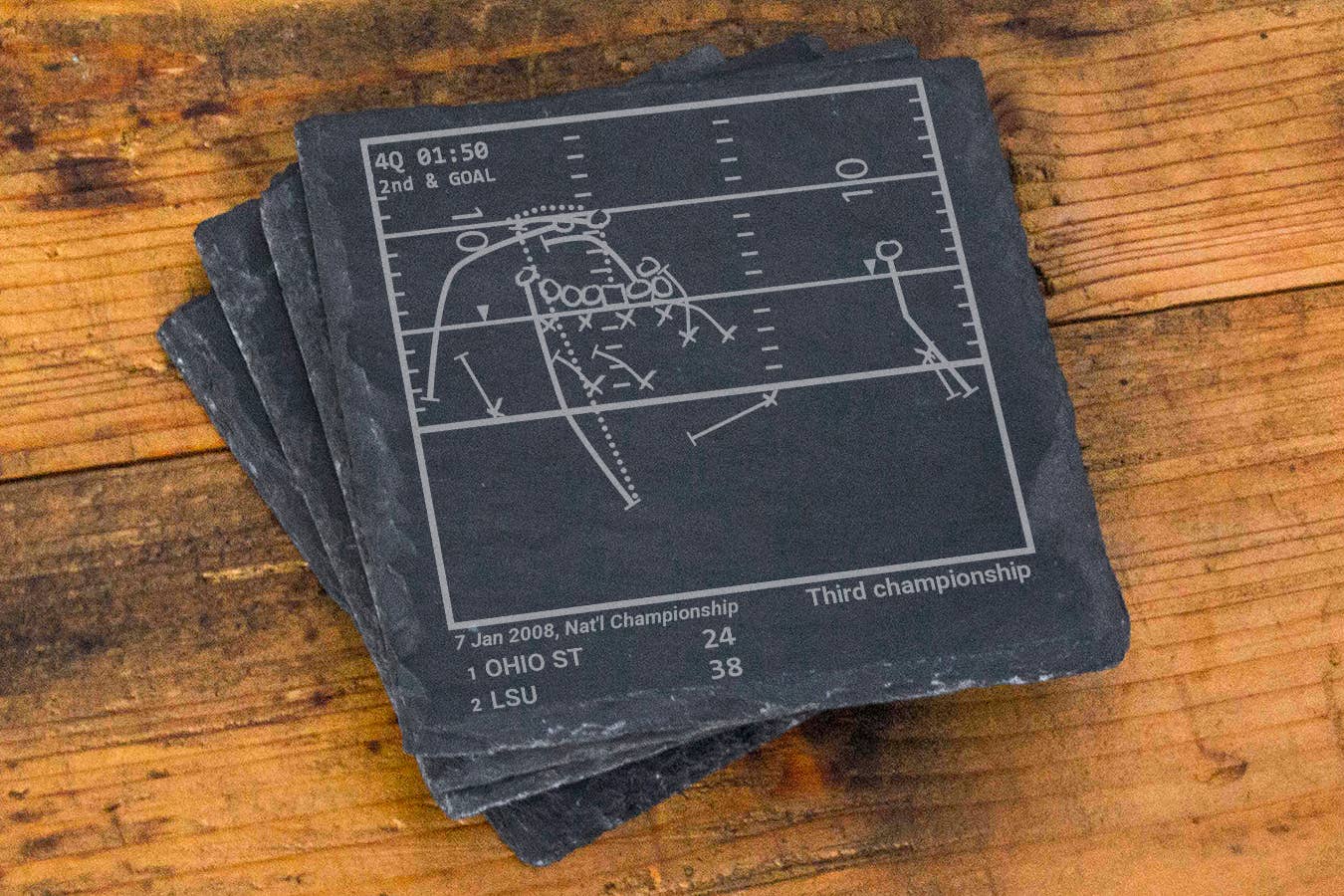 As sports fans, we all have our favorite plays. These plays are as much about us – the fans – as they are about the teams and players. We'll always remember what these moments mean to us. Each of our products tells a story, one that you can share with your guests or relive as you're waiting for a match to begin. This company began with a set of slate coasters that was a gift for my brother's 30th birthday. With him 3000 miles away, we don't often get the chance to watch games together, but sports have always been a strong bond between us. I researched the most important moments in his team's history and diagrammed out the plays so he could relive them every time he sat down at his coffee table. With more than 14,000 Five-Star Reviews... we've grown into a brand that customers love and trust. **NOTICE: No sports player, team, league, or playoff is affiliated with Playbook Products™ or is the source of, is responsible for, or has endorsed, sponsored, or authorized these products. **