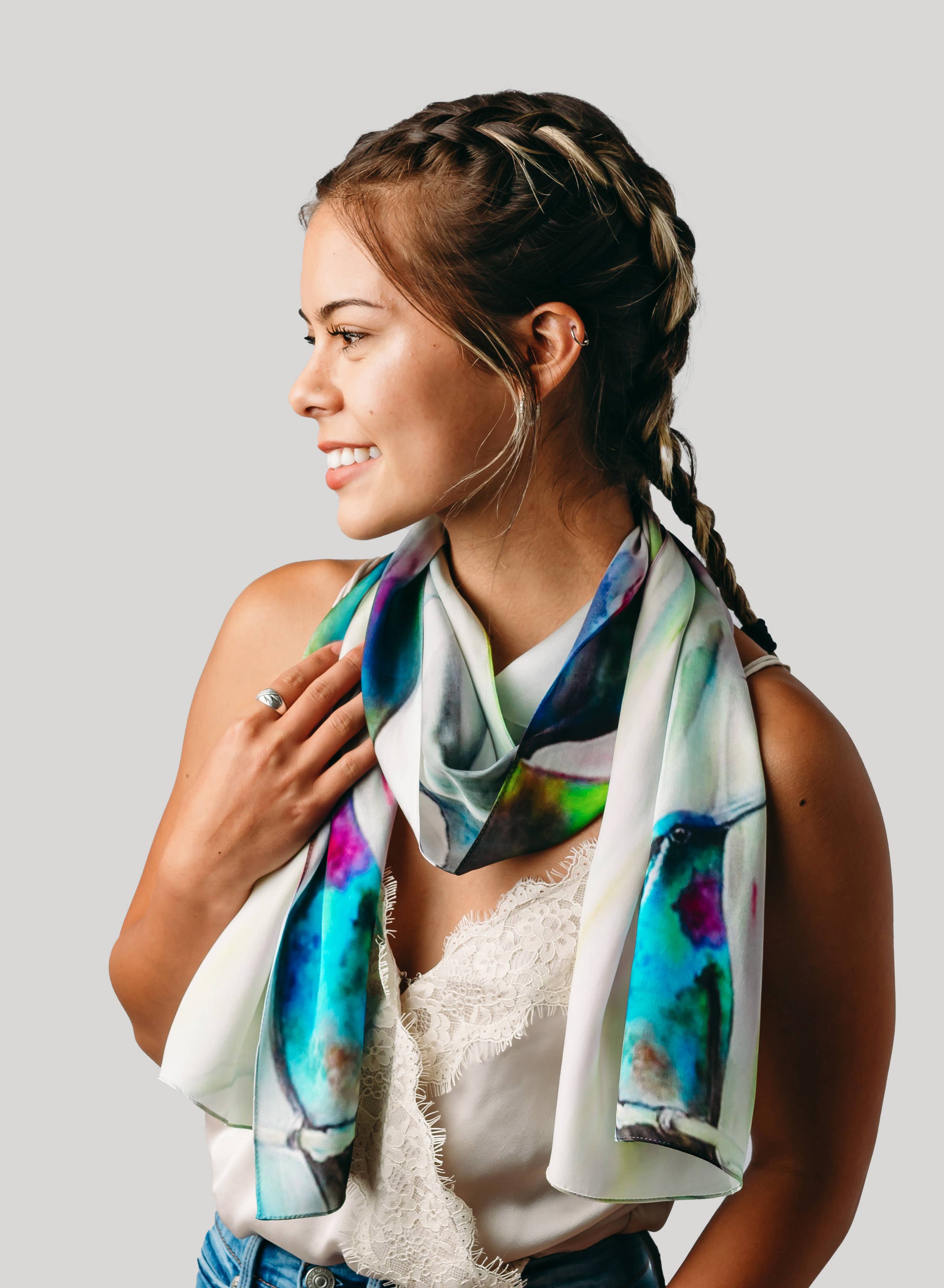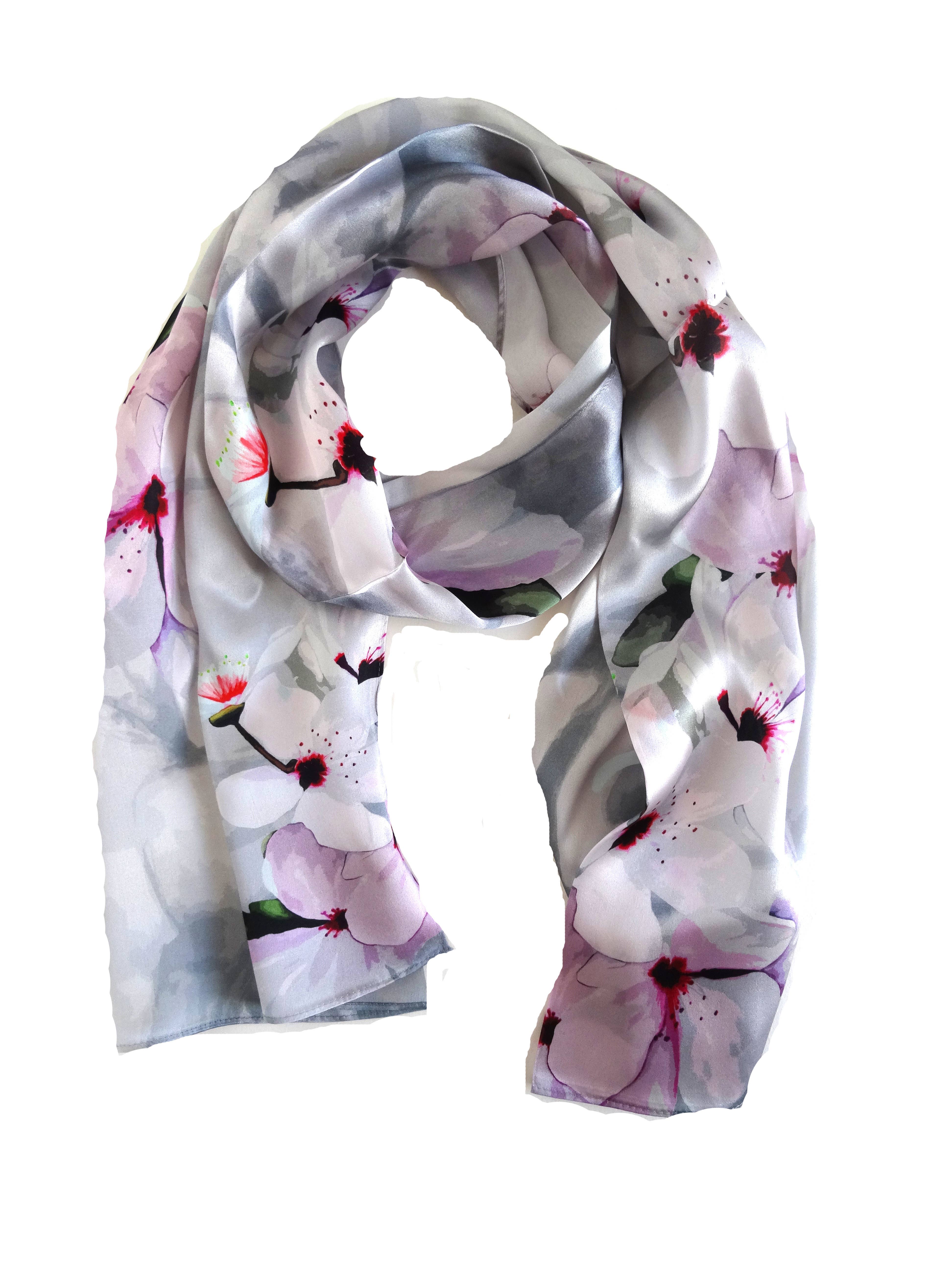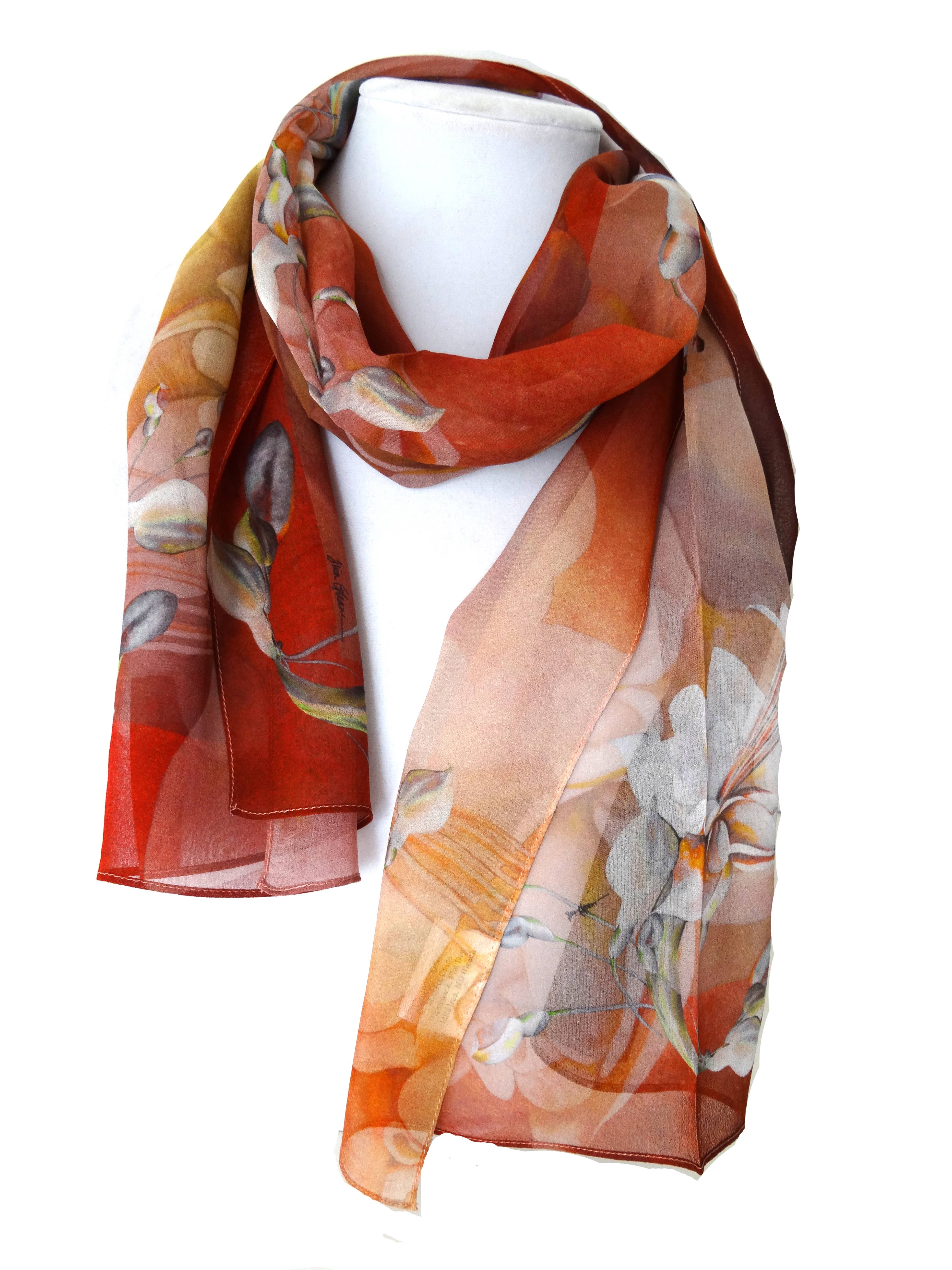 Tina Gleave is a Master Silk Painter who creates with you in mind. Her designs are inspired by her natural surroundings in Humboldt County, California, and are worn around the world. Starting with hand painting the design directly onto silk, Tina starts her process using silk dyes and squirrel-tail brushes. Once she has completed her design, it is steam-set for durability. Once she is happy with the outcome, it is photographed, then digitally printed directly onto 100% silk to become your favorite scarf or kimono or Tina uses silk georgette, silk satin, and silk twill for most of her designs. Every wearable is truly a work of art! Silk Squirrel receives yardage of the various designs, which are then cut and sewn here in the US using patterns developed by Tina. Tina is always keeping her eyes open in the fashion world to see how her paintings can complement your clothing accessories.