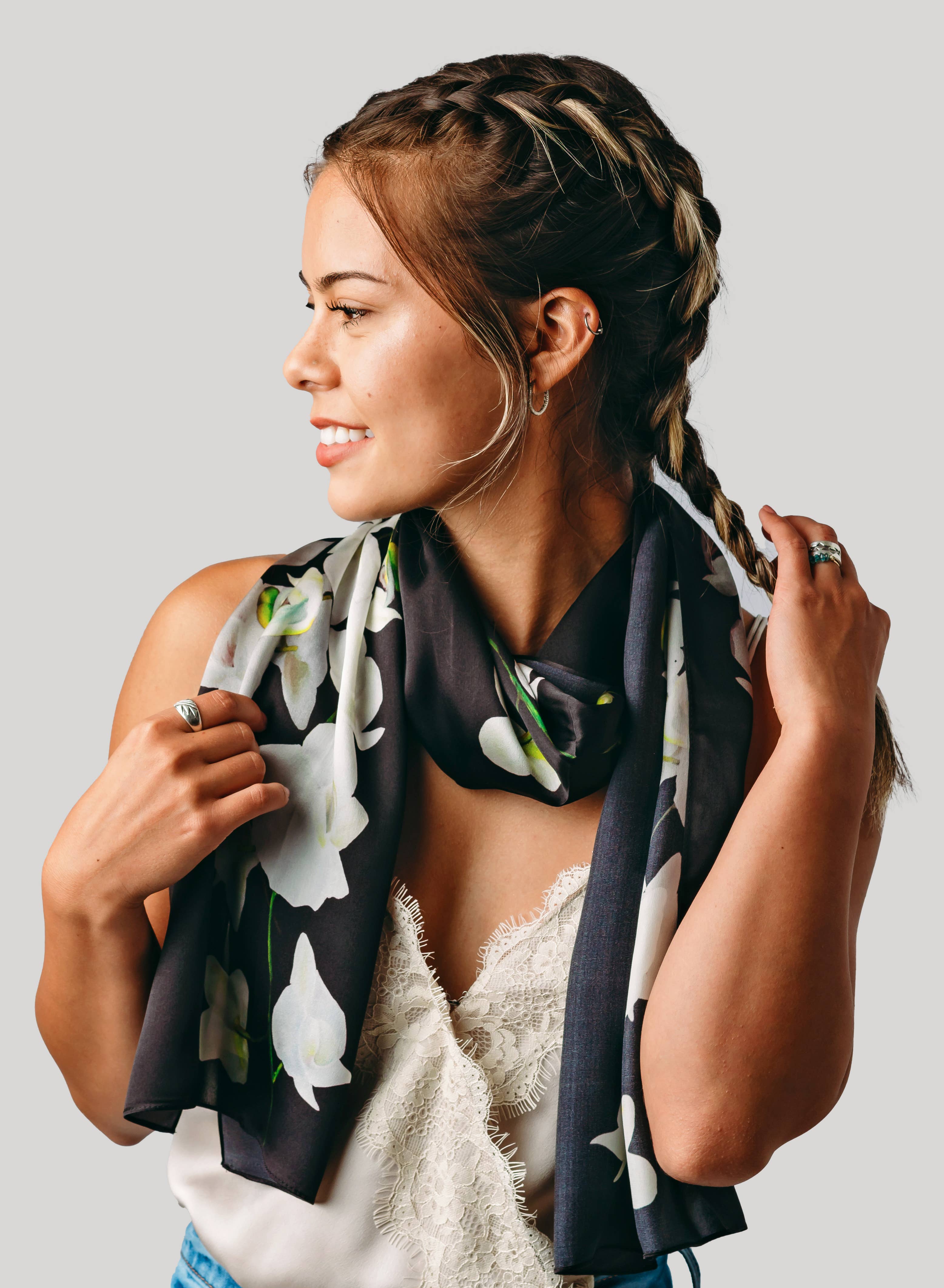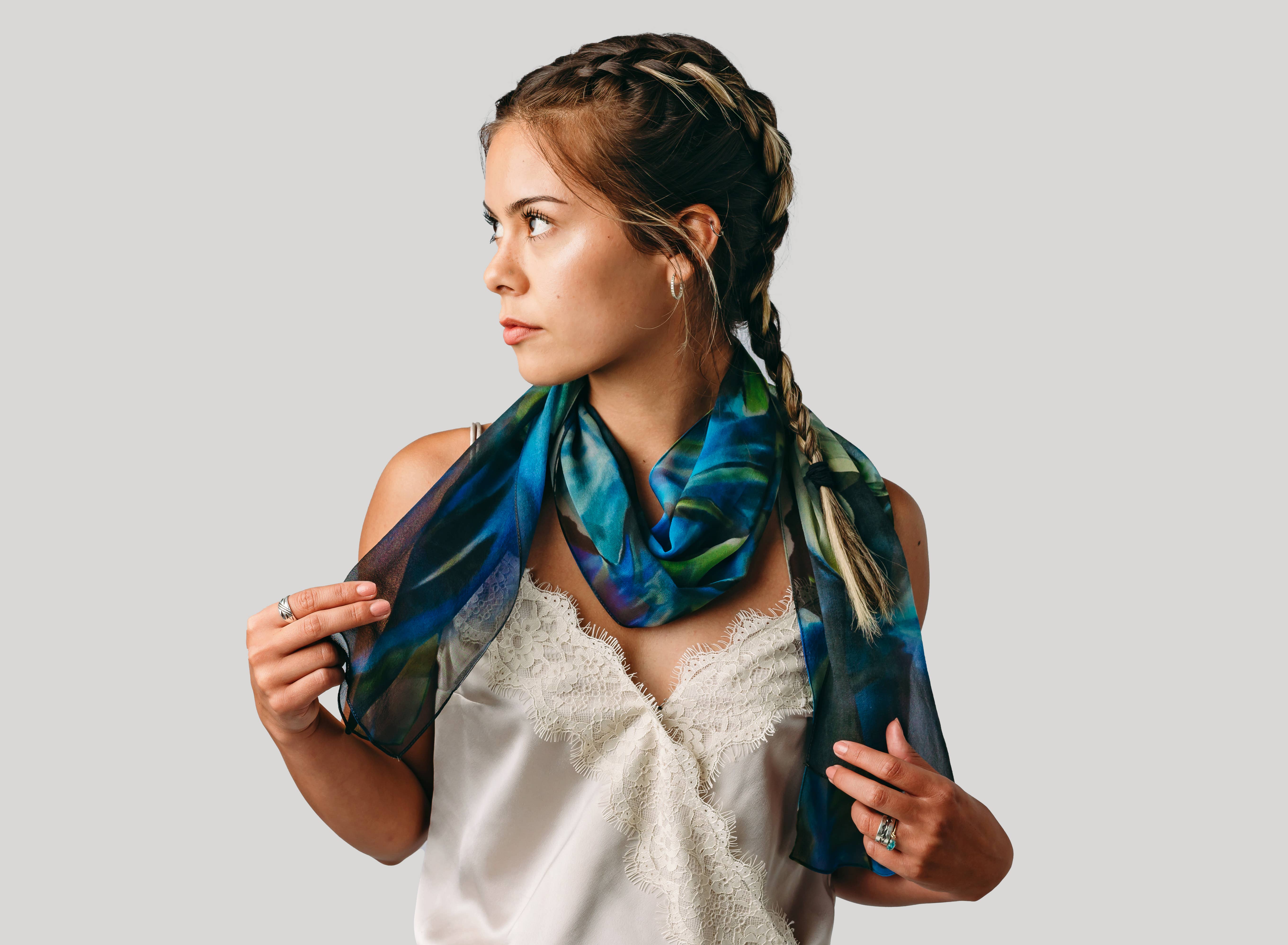 Tina Gleave is a Master Silk Painter who creates with you in mind. Her designs are inspired by her natural surroundings in Humboldt County, California, and are worn around the world. Starting with hand painting the design directly onto silk, Tina starts her process using silk dyes and squirrel-tail brushes. Once she has completed her design, it is steam-set for durability. Once she is happy with the outcome, it is photographed, then digitally printed directly onto 100% silk to become your favorite scarf or kimono or Tina uses silk georgette, silk satin, and silk twill for most of her designs. Every wearable is truly a work of art! Silk Squirrel receives yardage of the various designs, which are then cut and sewn here in the US using patterns developed by Tina. Tina is always keeping her eyes open in the fashion world to see how her paintings can complement your clothing accessories.