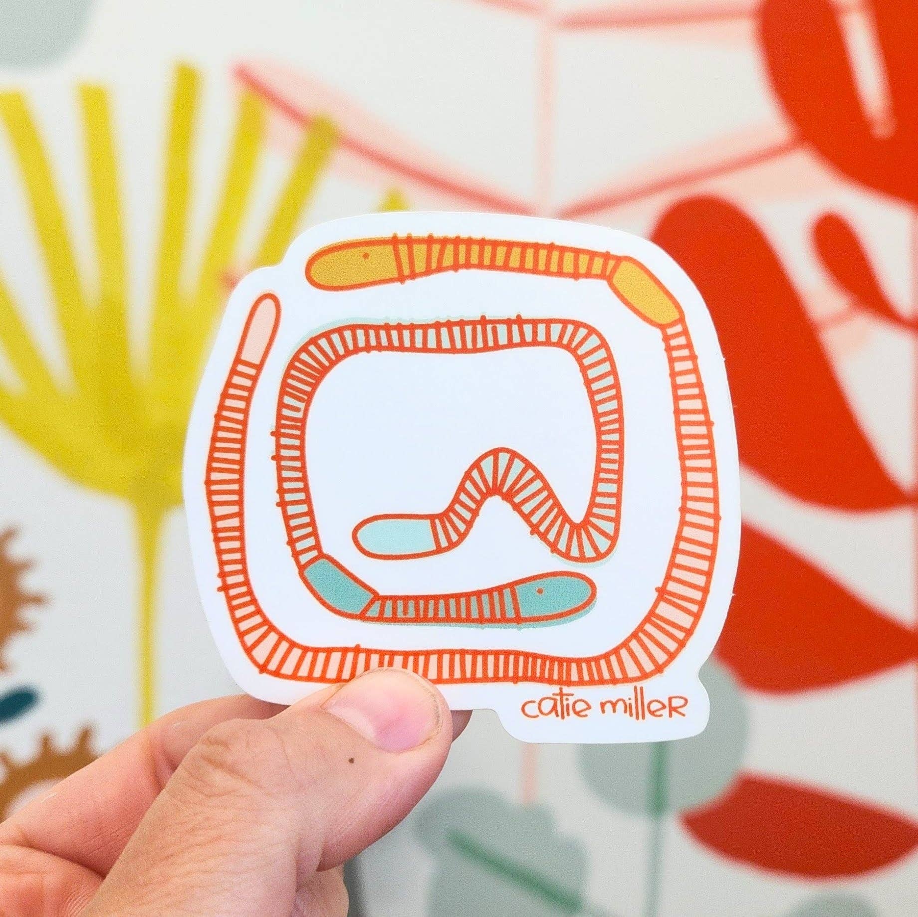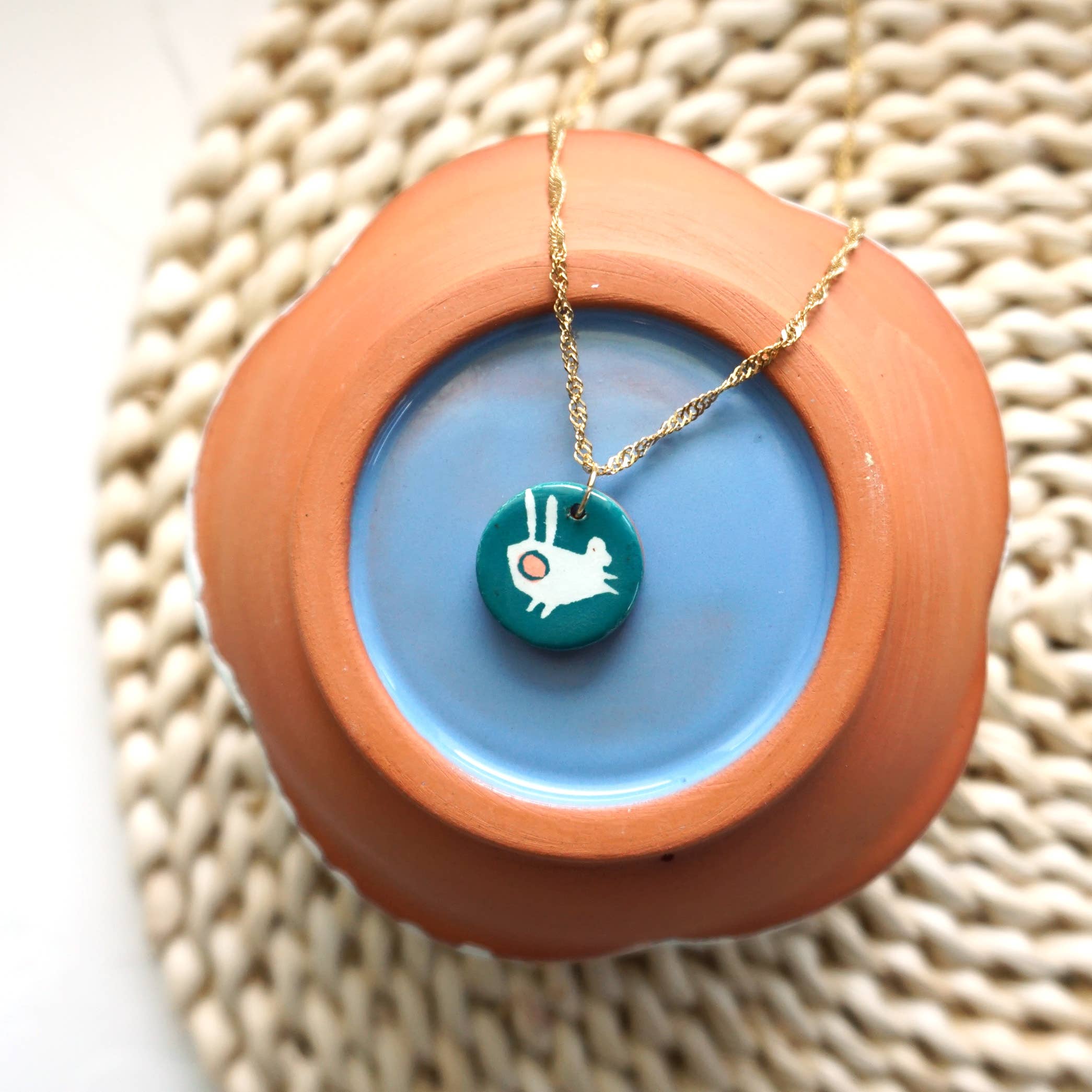 I’m Catie. I design, illustrate and make every piece from my home studio to send to stylish, eclectic shops around the world. My work is recognized by the bright colors and playful patterning. I use a method called slip transfers. What I love about the process of slip transfer is it combines my interests in drawing, printmaking, painting, and clay. By screen printing my own drawings on newsprint paper I can replicate complex designs while still keeping everything hand painted. I love the spontaneous transfer marks of the folds and wrinkles on the slip-covered paper as well as the misregistration of line and color, giving a glimpse into how it is made. Jewelry pieces are made from terracotta, which is fragile and takes a little extra care. It is recommended to wear earrings with stoppers on hooks to avoid them falling out of your ear as you move and shake throughout the day or night. Earring wires are 14k gold plated 925 sterling silver while the stud posts are surgical stainless steel. A shiny glaze covers the front of the earrings. The back of the earring is terracotta with a subtle pattern.