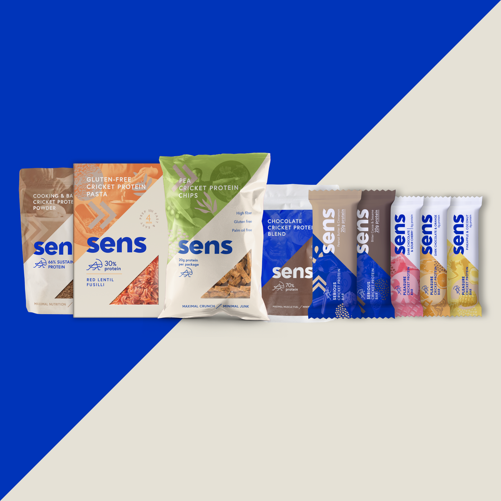 MAXIMAL NUTRITION, MINIMAL HARM. Bars, pasta, shake... with added cricket protein. Everything is healthier and more sustainable. Why cricket protein? The same quality protein as high-end beef. 2000x less water needed.