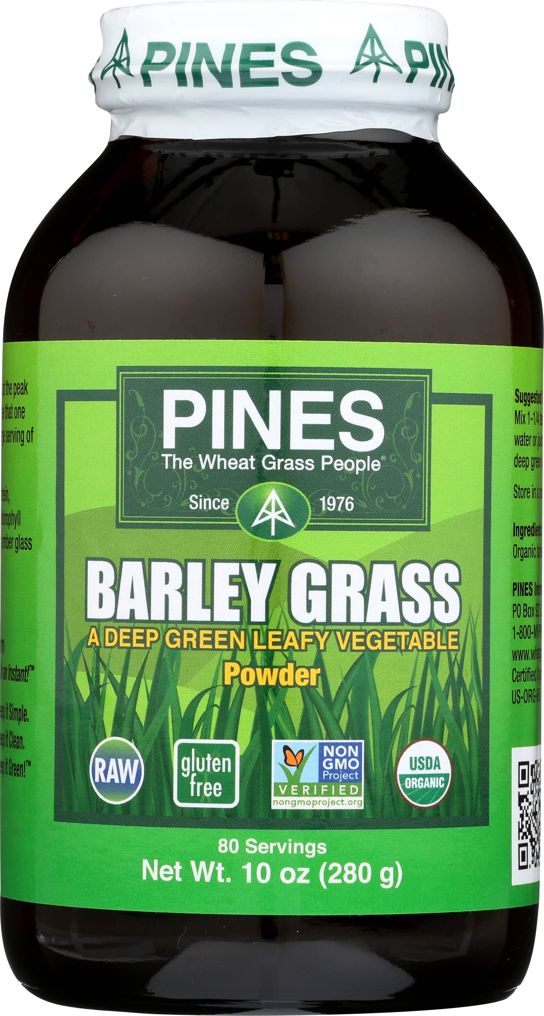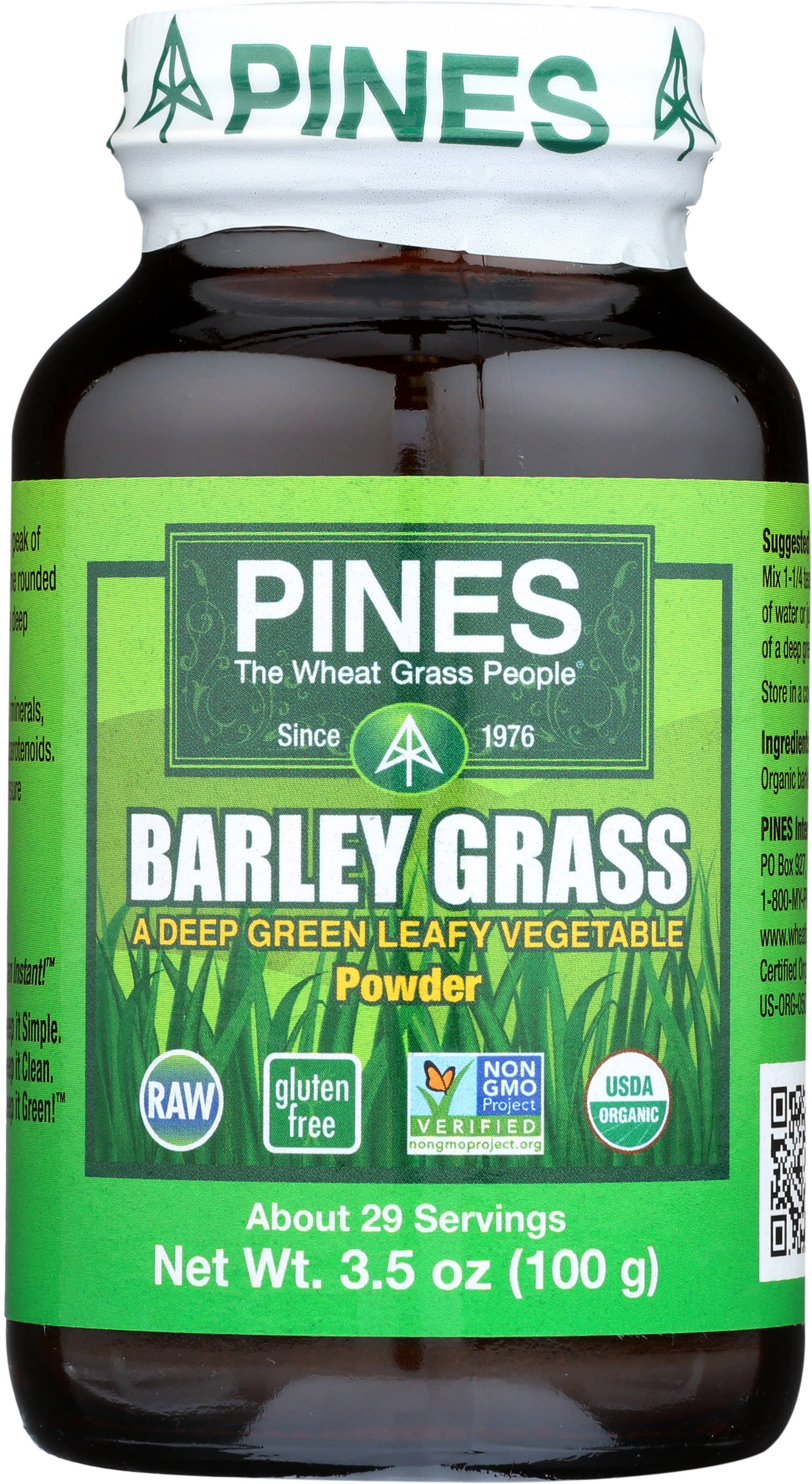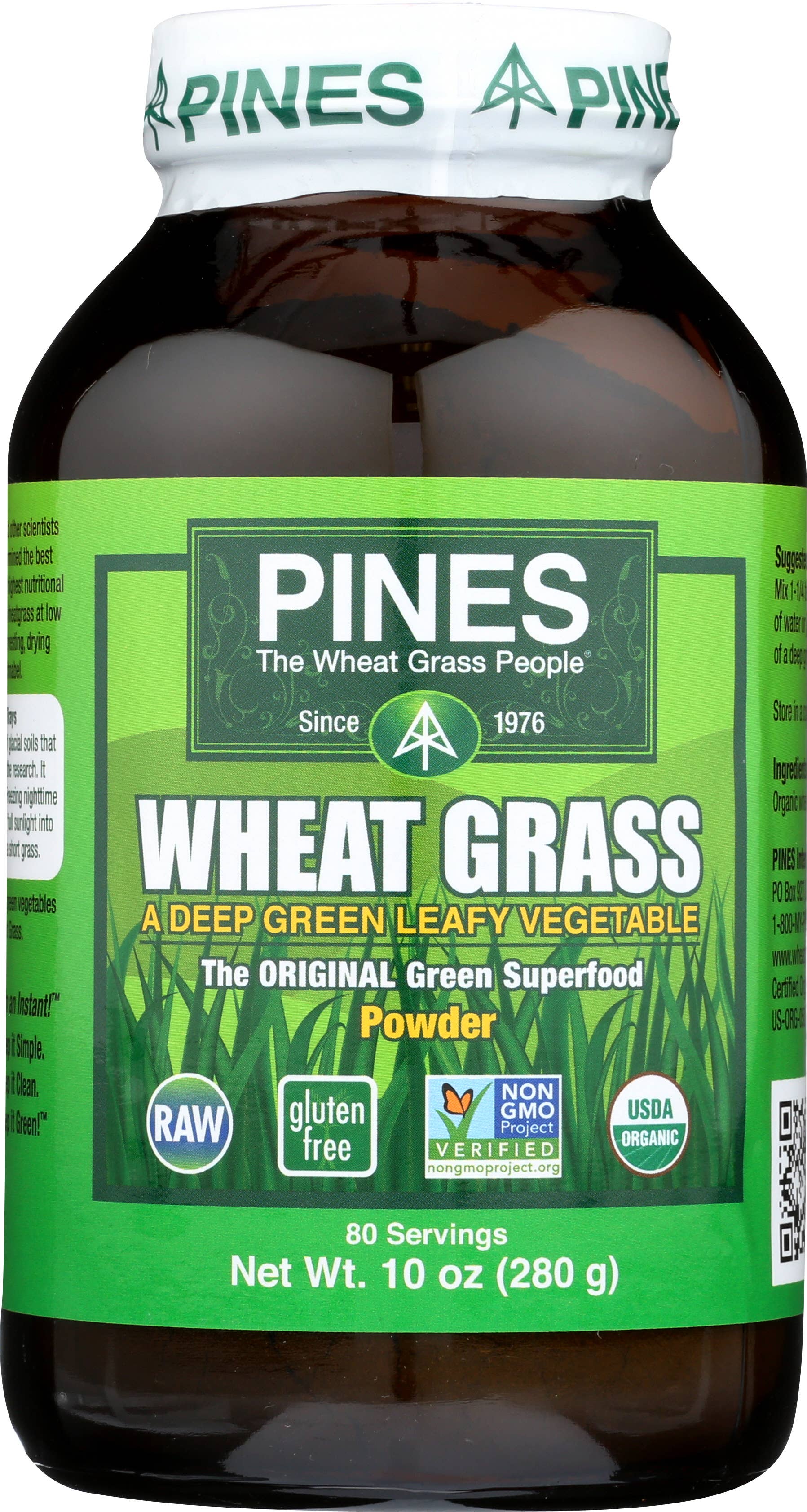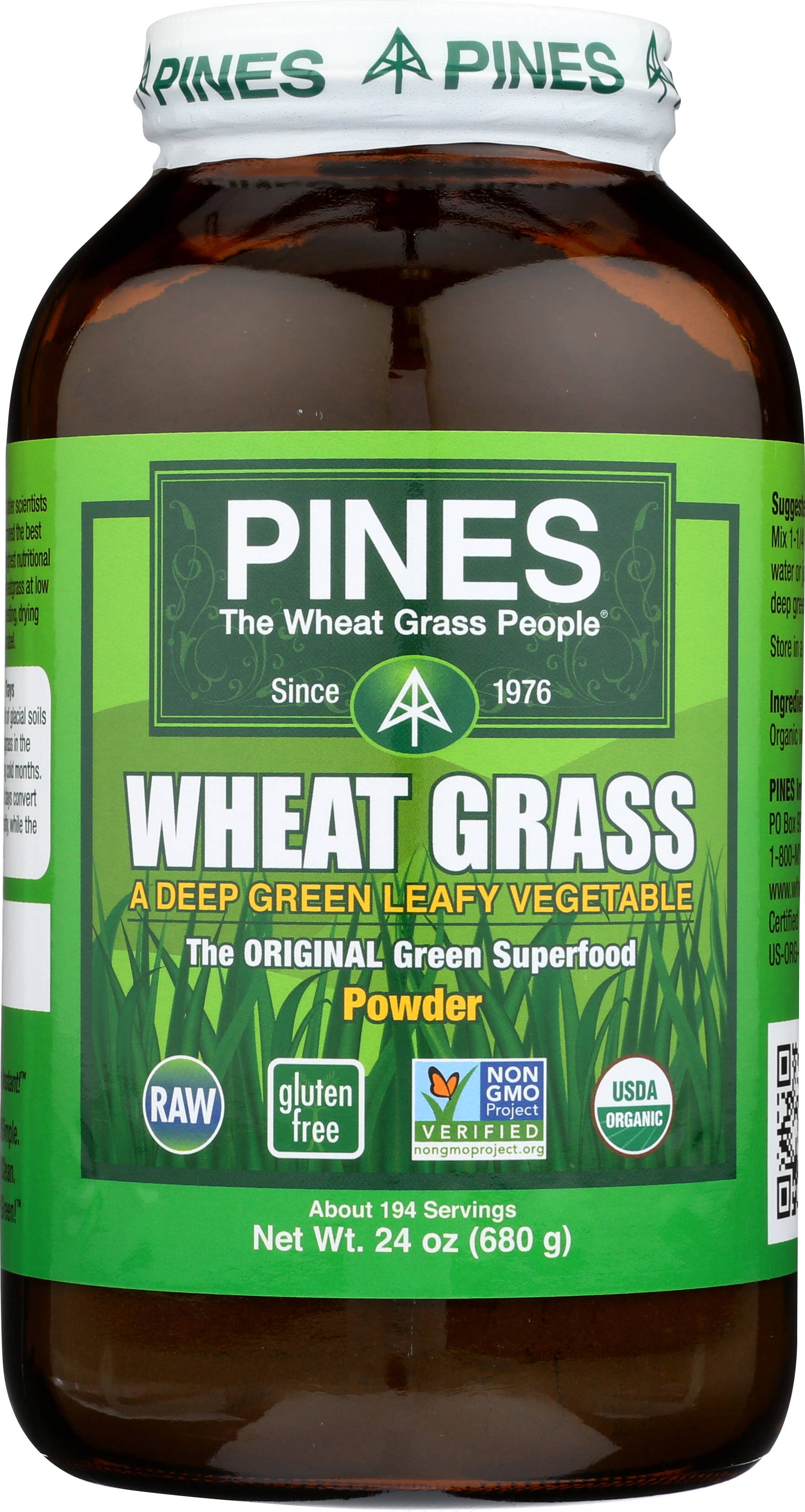 PINES introduced the original green superfood over 40 years ago. Our primary mission is to promote sustainable agriculture and healthy diets. We grow 100% Certified Organic foods from seed to store shelves. Our products are Kosher, gluten-free, vegan, raw, and Non-GMO Project verified. We provide consumers with economical and convenient high-quality vegetable nutrition that both the USDA & CDC say is missing from modern diets while still maintaining eco-friendly packaging and production methods. PINES is guided by three principles: Quality, Sustainability, and Expertise Quality: We have never and will never use plastic or paper packaging. That's because research clearly shows that green superfoods should be packaged in amber glass bottles with special metal caps so that the oxygen can be removed. We are the only green superfood producer to do that. Sustainability: PINES seeks to have very little negative impact on the planet. Where possible, Pines seeks to restore and protect land damaged by the shortsighted farming and development by others. Expertise: PINES was the first green superfood company in the health food market. After more than years, we are still the only grower of wheatgrass to follow scientific standards. PINES is was the first and is still the best convenient superfood on the market. Try some today!
