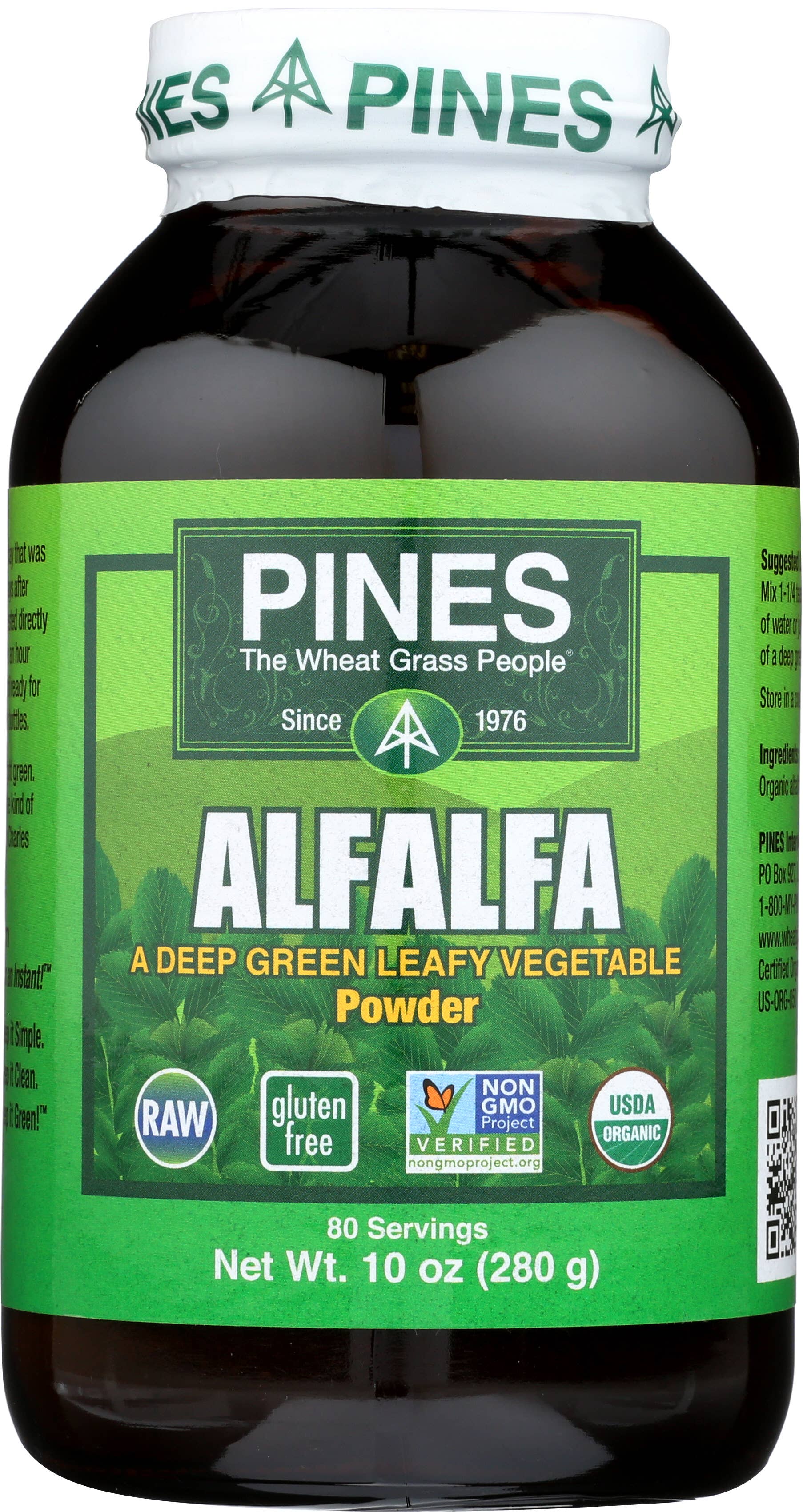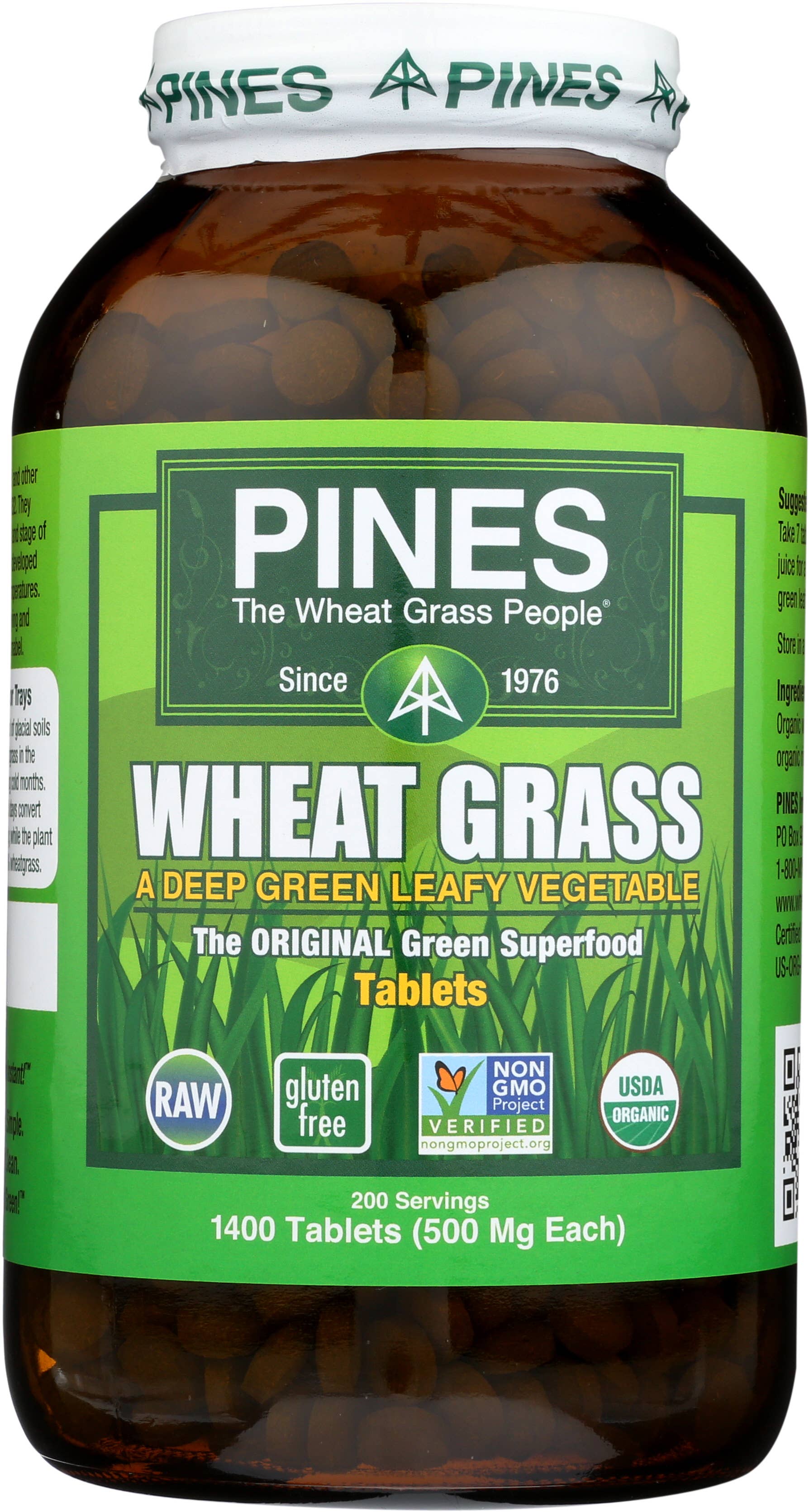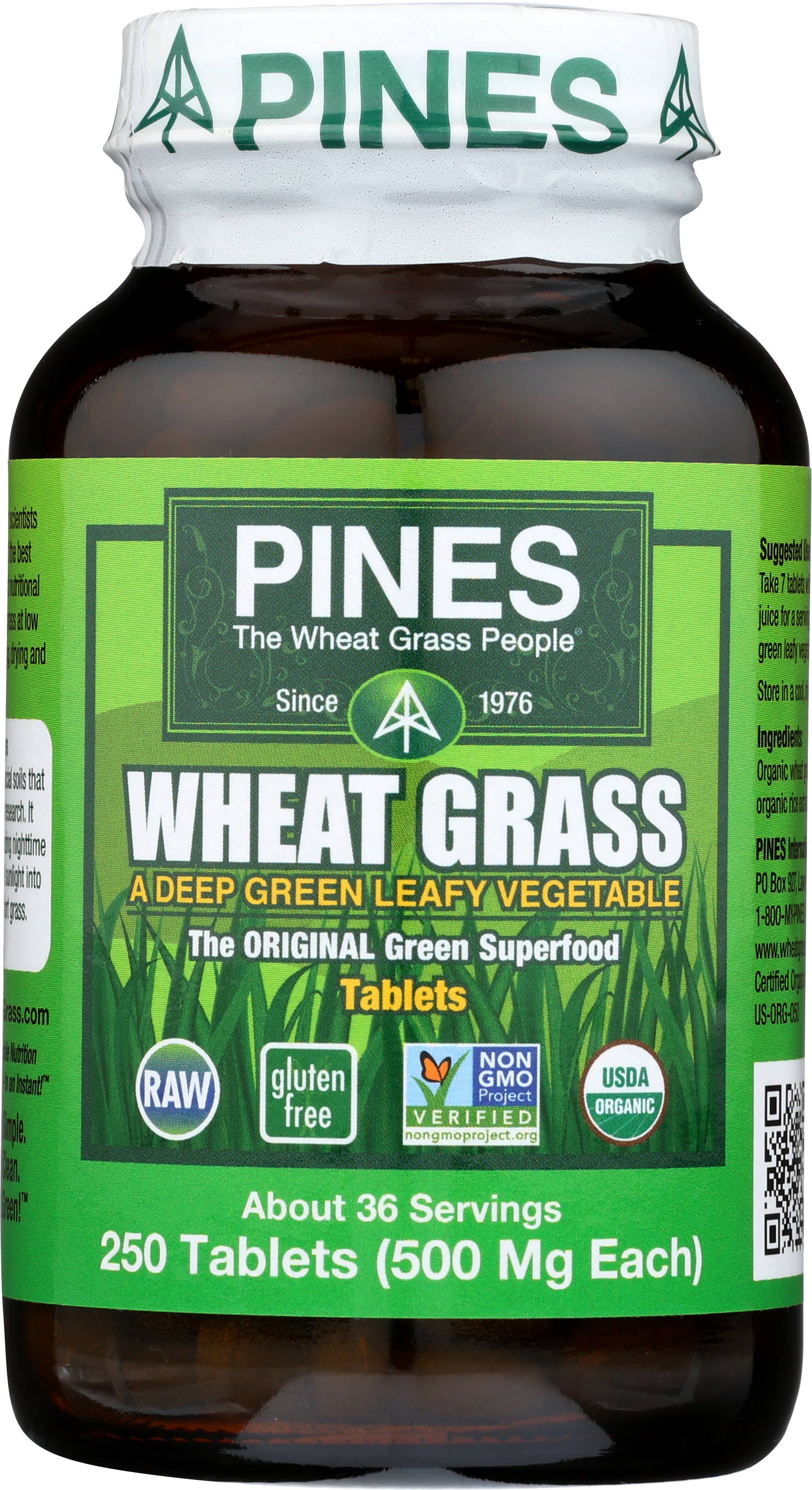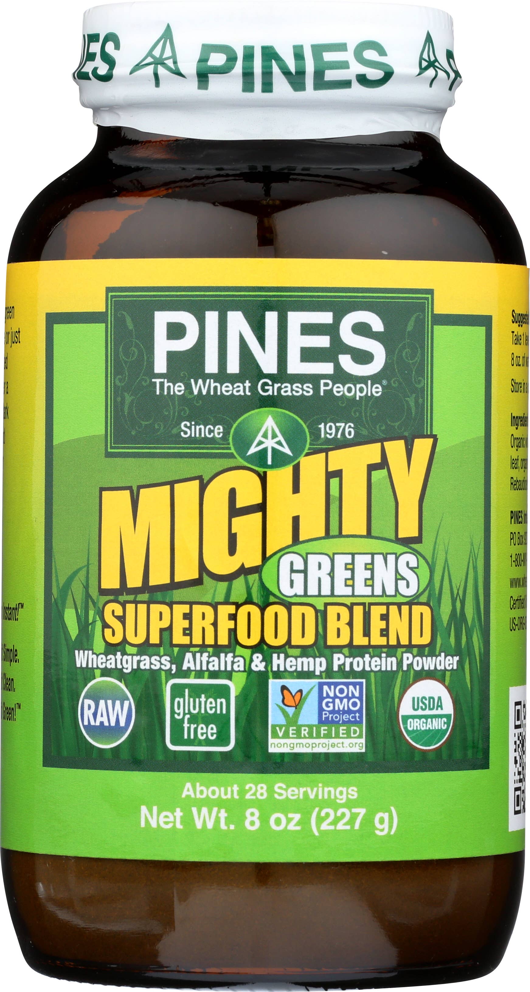 PINES introduced the original green superfood over 40 years ago. Our primary mission is to promote sustainable agriculture and healthy diets. We grow 100% Certified Organic foods from seed to store shelves. Our products are Kosher, gluten-free, vegan, raw, and Non-GMO Project verified. We provide consumers with economical and convenient high-quality vegetable nutrition that both the USDA & CDC say is missing from modern diets while still maintaining eco-friendly packaging and production methods. PINES is guided by three principles: Quality, Sustainability, and Expertise Quality: We have never and will never use plastic or paper packaging. That's because research clearly shows that green superfoods should be packaged in amber glass bottles with special metal caps so that the oxygen can be removed. We are the only green superfood producer to do that. Sustainability: PINES seeks to have very little negative impact on the planet. Where possible, Pines seeks to restore and protect land damaged by the shortsighted farming and development by others. Expertise: PINES was the first green superfood company in the health food market. After more than years, we are still the only grower of wheatgrass to follow scientific standards. PINES is was the first and is still the best convenient superfood on the market. Try some today!