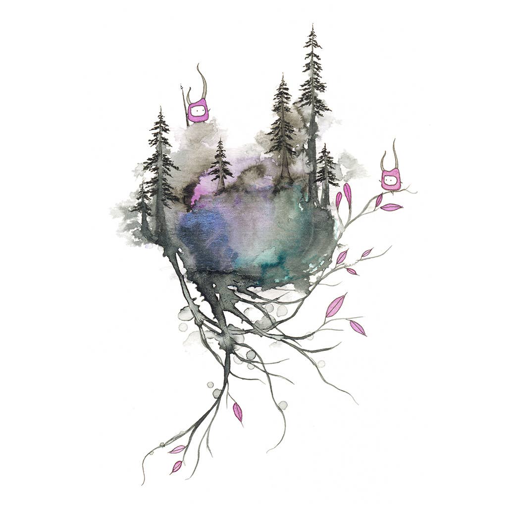 Melissa Moss, from Asheville, NC, has a background in color psychology and is well versed in the meanings of colors and their subtle shades and tones. Working with acrylic, pen and ink, and resin, Melissa combines colors in an arresting way, creating a tinted world that is very much her own invention. Melissa’s paintings of delicate trees and otherworldly flowers may depict adorable creatures in peril or pretty pink flowers surrounding a forlorn tree. Tiny details are not always evident at first glance. Often fantastical, this is the subterranean landscape that lies beneath a child’s fairy tale or a Saturday morning cartoon. Her “seedlings” collection was inspired by the tenacity of nature and how, even in the worst of conditions, a tree or tiny flower will sprout up. Feeling sad and frustrated about the news in this country and around the world, Melissa started working on these to give her an escape. They are hopeful and tenacious “seedlings” in search of a better world. Melissa’s work has exhibited at galleries in Hong Kong, New York, Los Angeles, Chicago, San Francisco, Pittsburgh, Philadelphia, Indianapolis, Savannah and Asheville.