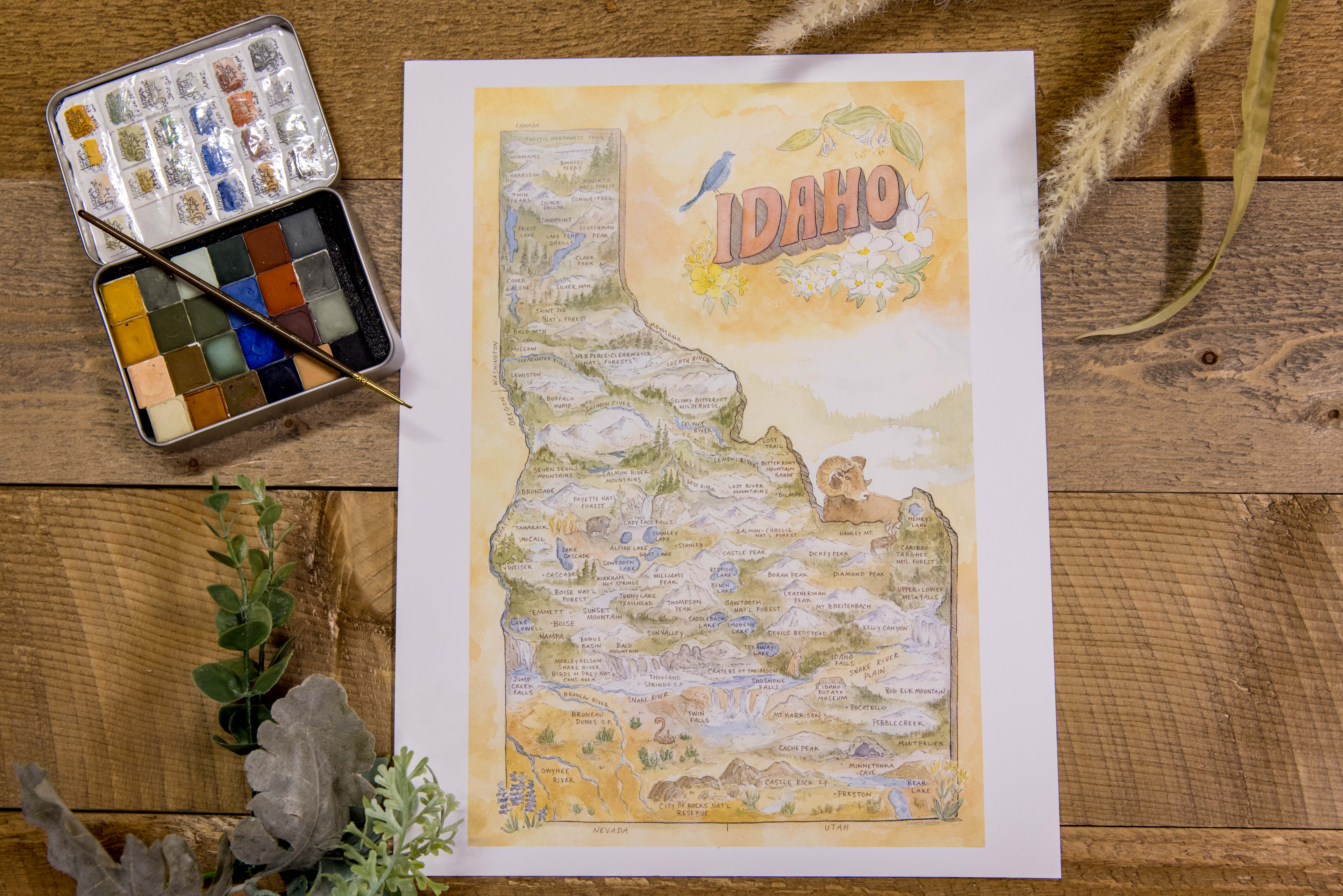 Watercolor Maps & Hand Drawings of America's States, National Parks, Public Lands and National Scenic Trails POSTCARDS - GREETING CARDS - ART PRINTS Are you curious what the most popular outdoor landmarks are in each State? We got you covered! Our watercolor maps include various fun outdoor locations to visit on your next trip! Not to mention, We've highlighted each states waterways, trees, wildlife, marine life, mountains, state bird and flower. Our products are the perfect addition for Souvenir & Gift. Suitable for locals, visitors, Vacation Rentals, Shops, Education, Commercial and so much more! Made & Printed in USA. Sustainable Materials. Women Owned. Based out of Bend, Oregon Our products are printed on high quality paper & made with premium ink.