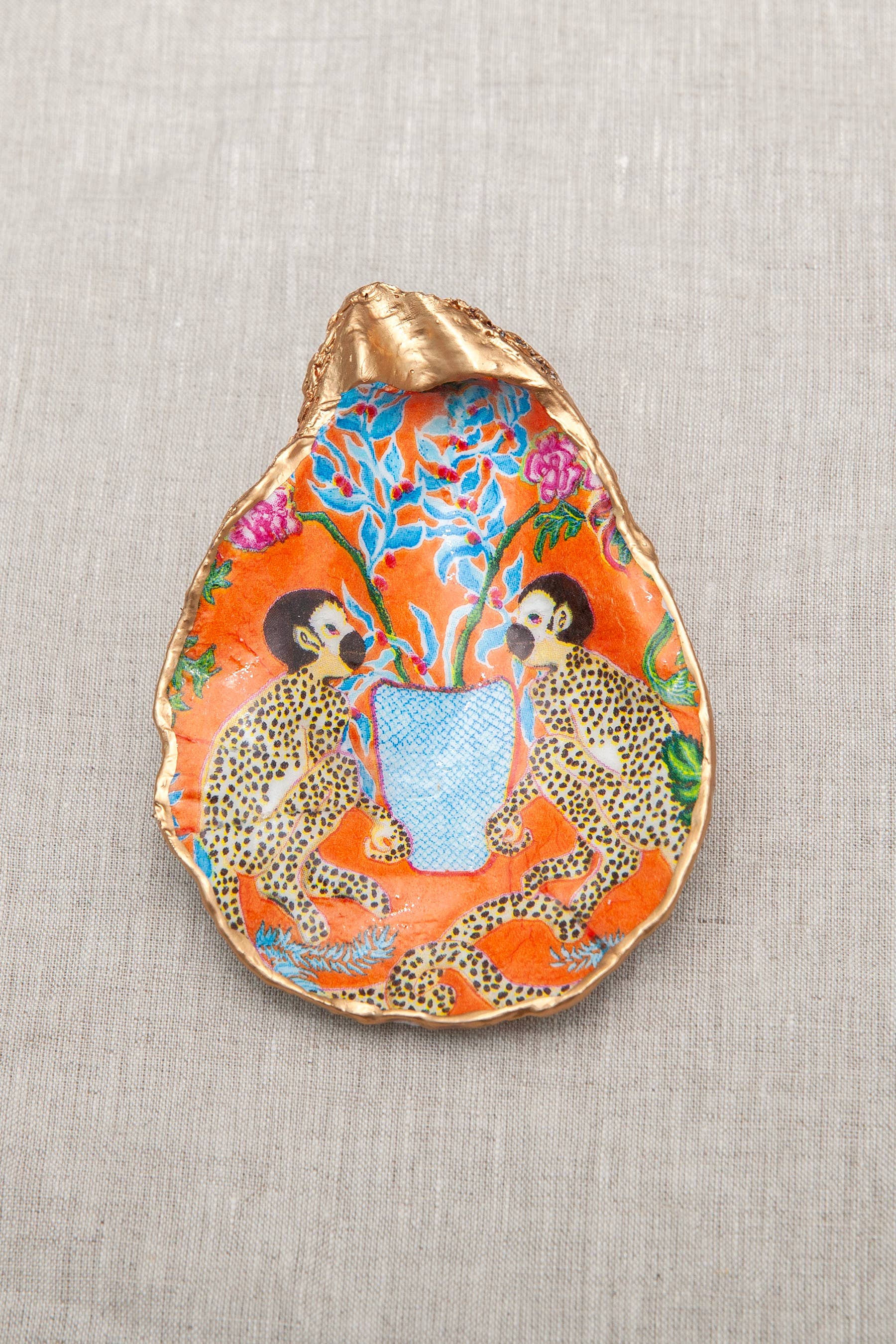 About Blair’s Oyster Shells Each decoupaged oyster shell is a unique piece of art made from a hand selected oyster shell that came from the Rappahannock River. Every shell is hand made in the USA using a 22 step process to transform a humble oyster into a beautiful delight with bright colors and a glass-like finish.
