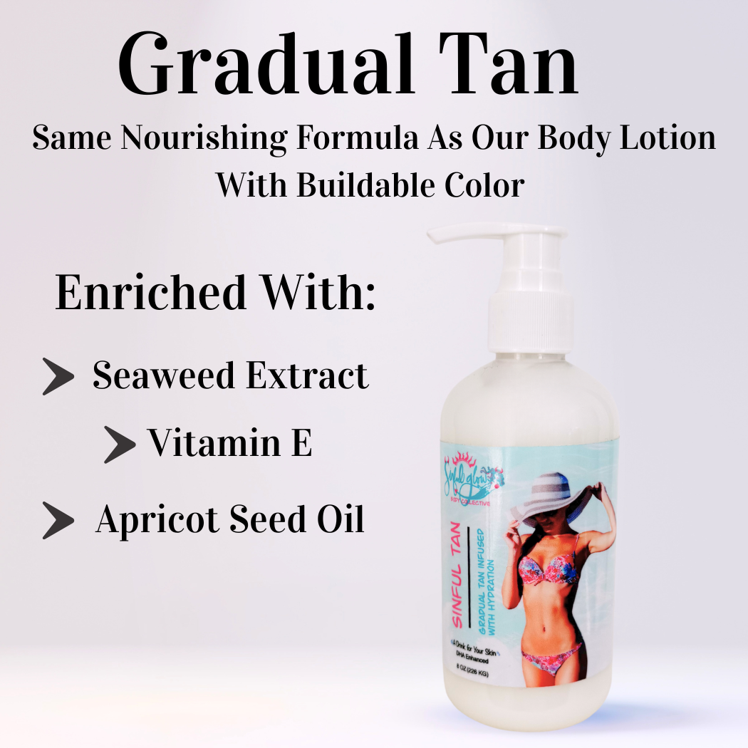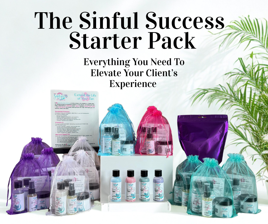 At Sinful Glow Body Collective, glowing, healthy skin isn’t just the goal—it’s the standard. Founded by licensed esthetician and master spray tan artist Dana Craft, our journey began inside a custom tanning studio. It quickly evolved into something bigger: a full-body skincare line designed to extend the life of your spray tan while deeply nourishing and hydrating the skin. Crafted with powerhouse ingredients like Apricot Seed Oil, Vitamin E, and Seaweed Extract, our products support long-lasting color, smooth texture, and a luminous glow—no matter your skin type. Whether you’re a spray tan client, self-tanner, or pro spray tan artist, this is your glow-to solution for Spray Tan Aftercare and daily skin wellness.