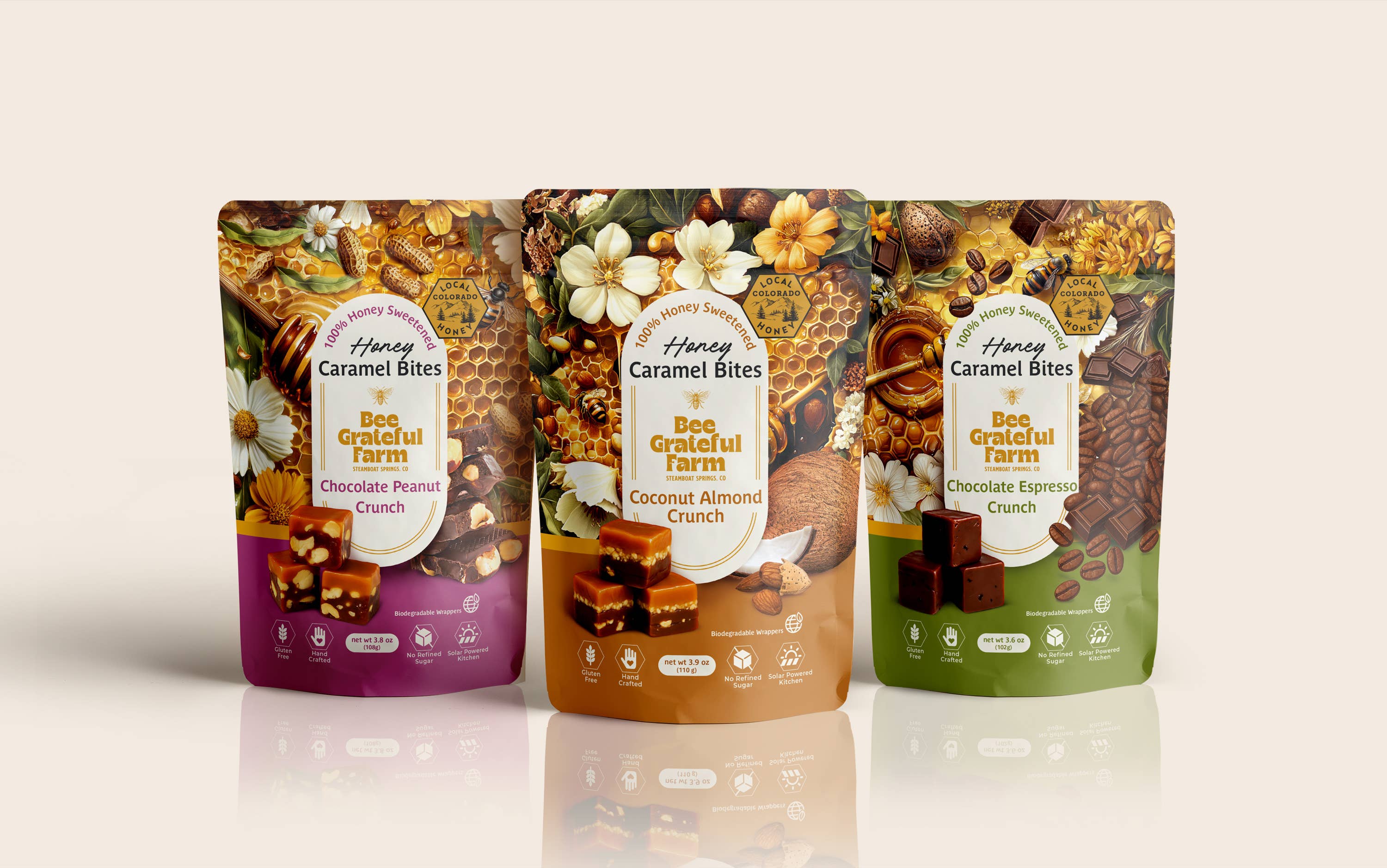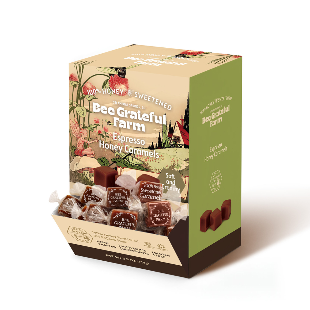 SUMMER SHIPPING SURCHARGE APPLY TO SOME STATES outside of Colorado. See below. Bee Grateful Farm is a Family run 100% Natural farm located at 7200 Ft right outside of Steamboat Springs. We wanted to create wholesome healthy candies that could be enjoyed by the entire family with no syrups, processed sugar or junk. We combined our love for bees and honey to create the best 100% honey caramels you have ever tasted. Made from scratch using honey from local beekeepers,organic cream and butter from grass fed cows and salt from the ancient seas of Utah. Lavender petals, cacao , organic ginger root and fair trade espresso beans are used to flavor our mouth watering treats. Because there is no sugar, these yummy caramels will never stick to your teeth. Our wrappers 100% biodegradable and our kitchen is solar powered. PLEASE NOTE: Our caramels do not like traveling in the summer and need to be shipped in a bio-degradable coolers anywhere outside of Colorado during the hot summer months. The coolers stay cold for 2 days, so the following states will also have to pay 2 day air shipping: FL, GA, Al, LA,MS, AR,TN,SC, KY, VA, WV, IL,IN,OH, PA, NY, NJ, DE, MD, CT, RI, MA,NH, VT, ME, MI, WI, IL, MN, ND, CA,NV, OR, WA, AK, HI, ID, TX (Parts of state where ground normally is 3 day from CO). If you order prior to the temps getting hot, we will make all attempts to ship ground where possible, saving the 2 day air charge. . Please message us for more information.