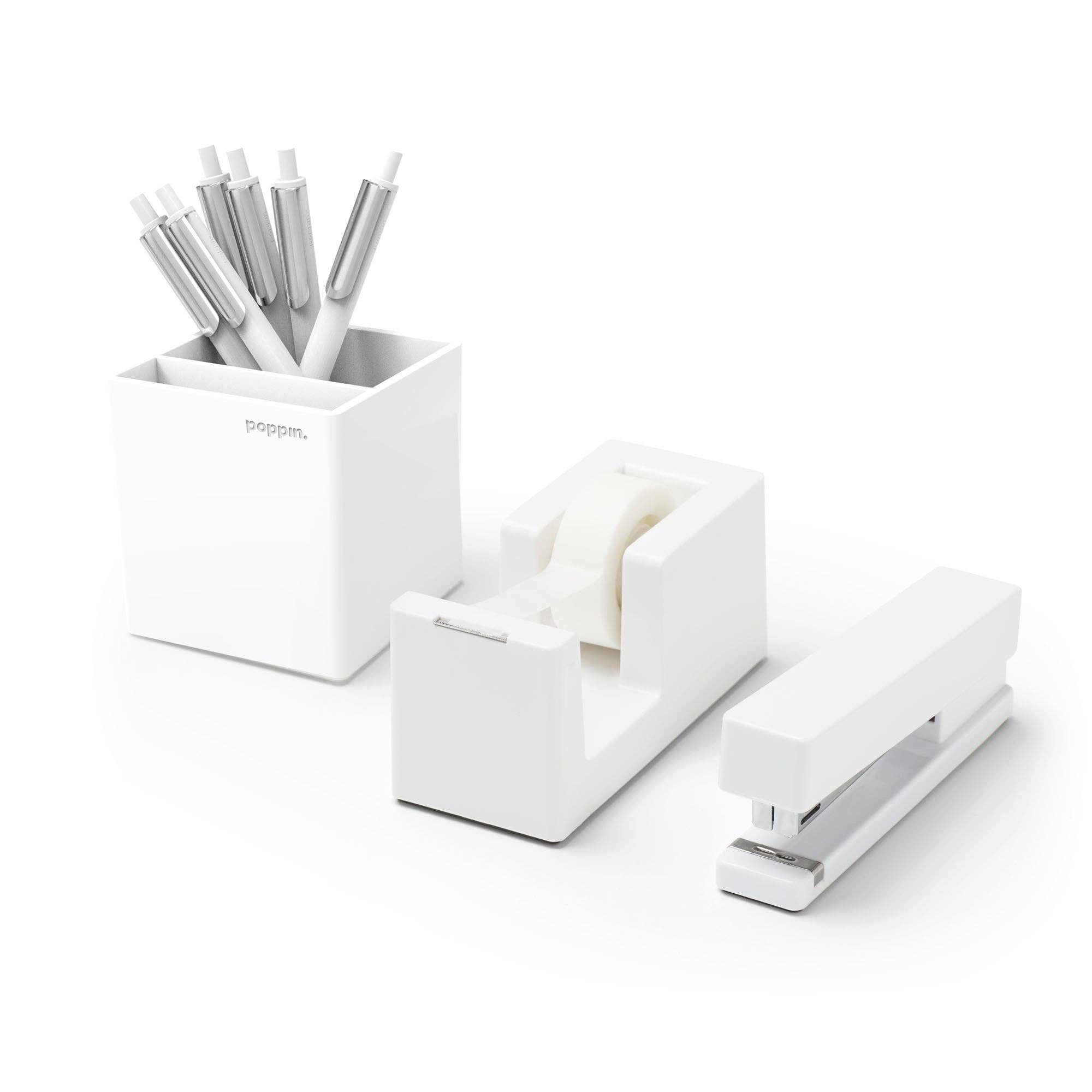 Poppin started in 2009 in New York City, when our founders set out on a mission to redesign the standard boring black office stapler into something fun and inspiring. They streamlined the design of the stapler, giving it clean and modern edges, and released it in a rainbow of colors to bring excitement to any desk. From there, they thought - what other ordinary office supplies could they redesign into something extraordinary? And with that, Poppin was born. Poppin's mission is to inspire everyone, everywhere to work happy. We do this by taking ordinary office supplies and designing them into something unexpected and inspiring. We make all of our office supplies in a range of colors, because color breathes life into workspaces. The Poppin family of products is modular and designed to mix, match, stack, and fit perfectly together so you can make your desk uniquely yours. We offer great design at a great price, because we believe beautiful design and great quality should be accessible, so we can inspire more people to work happy. Our bestsellers are our pens and colorful notebooks, but we also offer a wide range of desktop trays and holders, staplers and tape dispensers, uniquely designed scissors, and other colorful desk supplies.