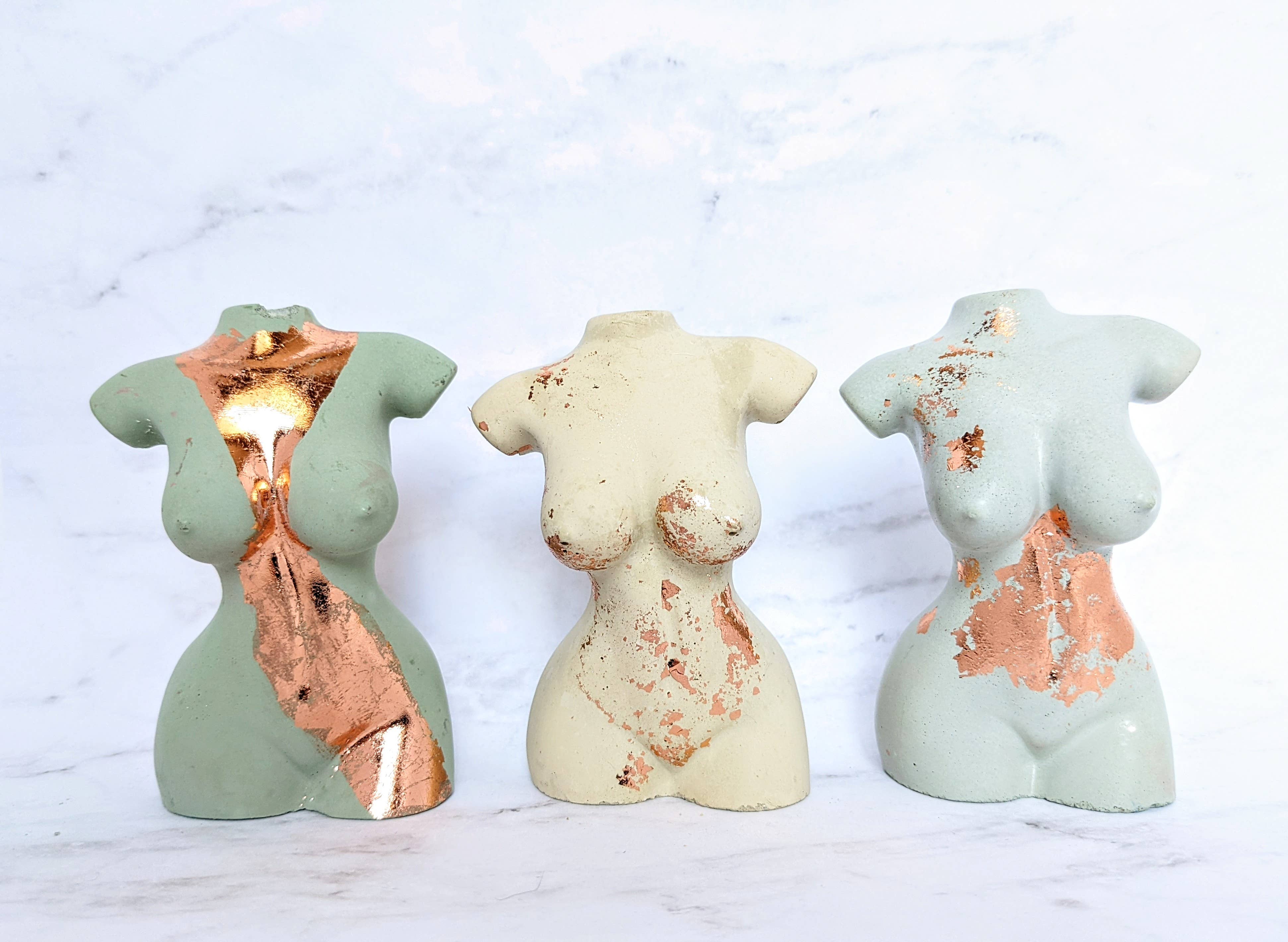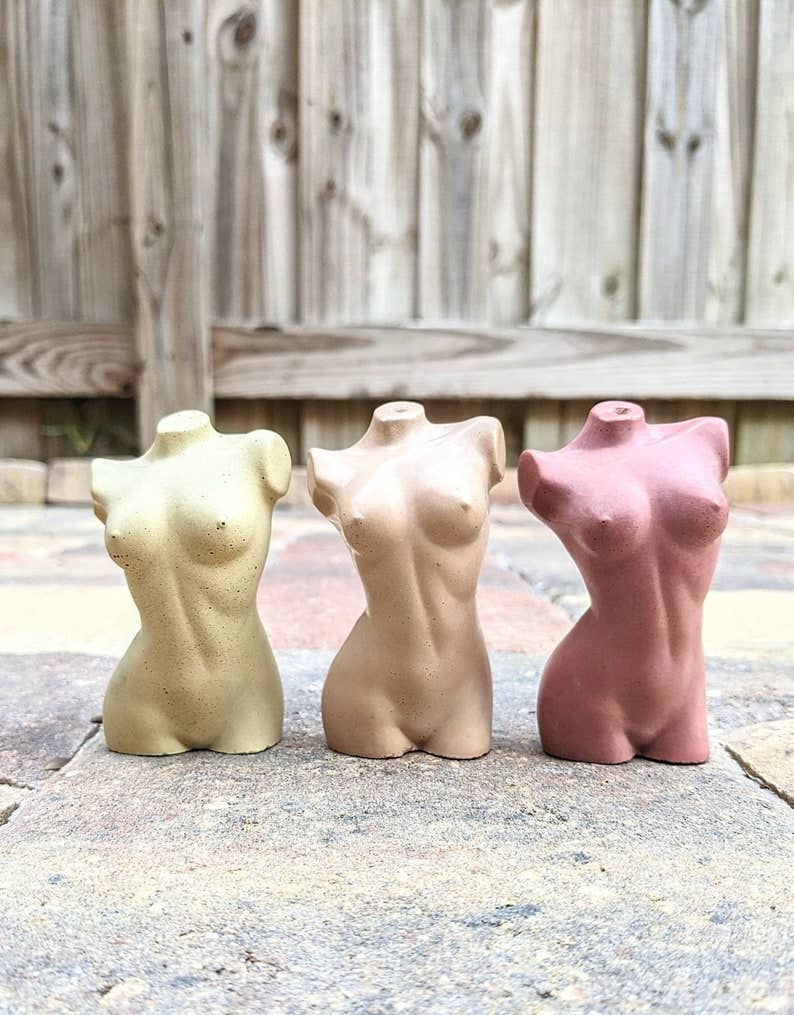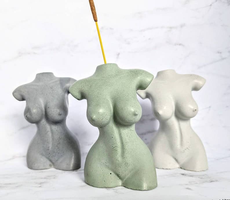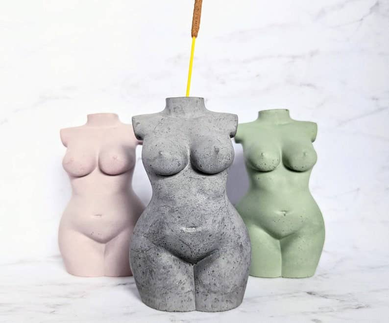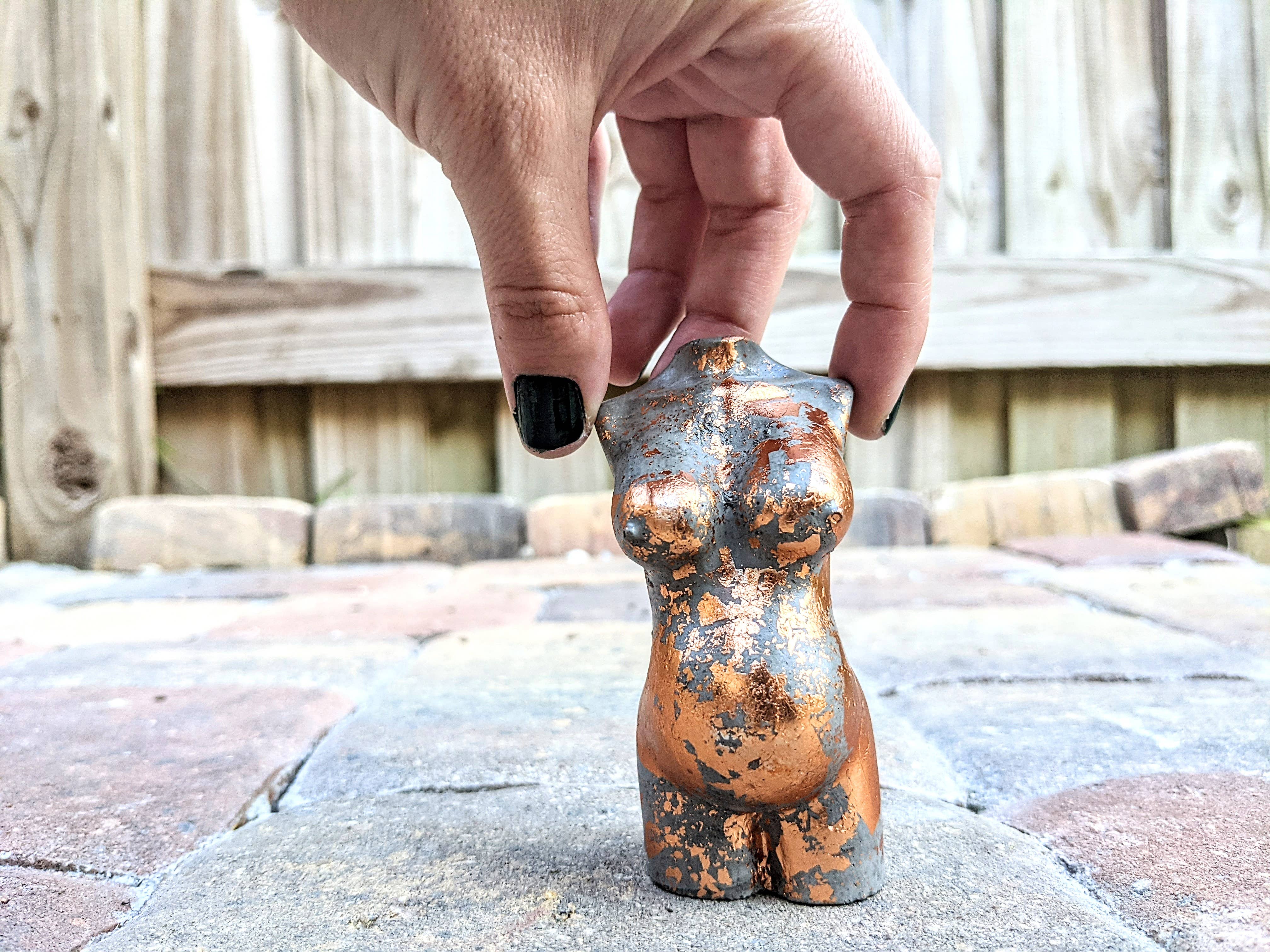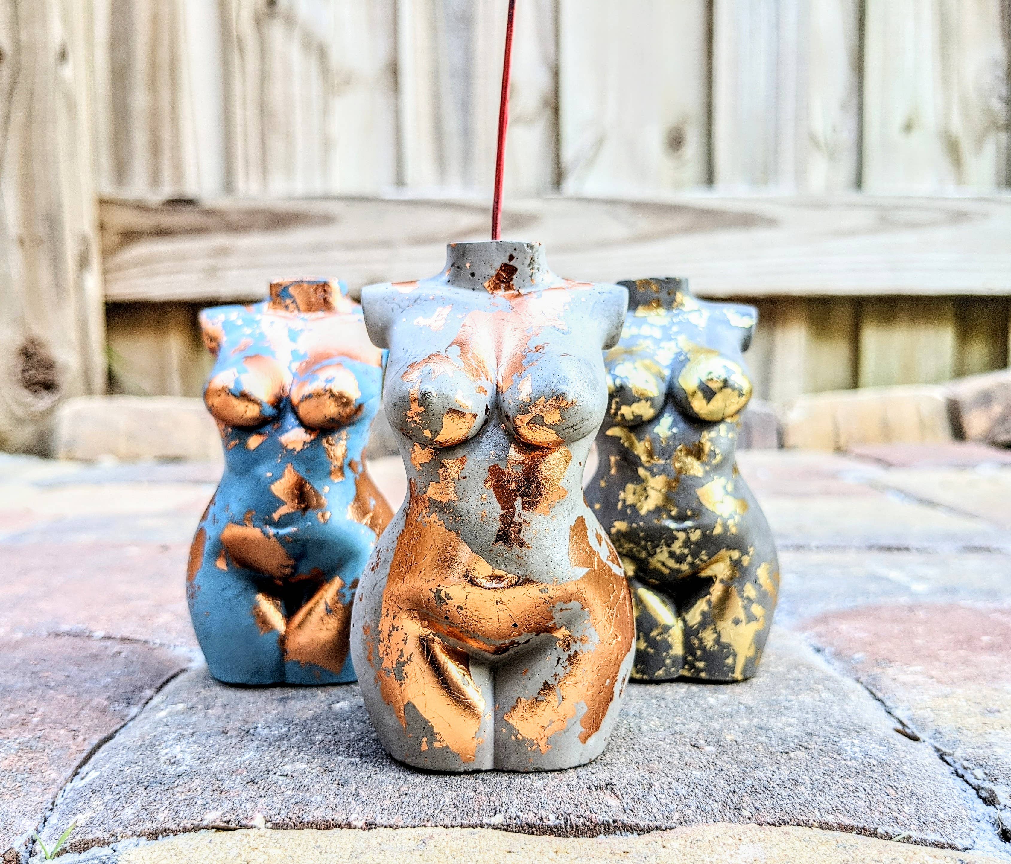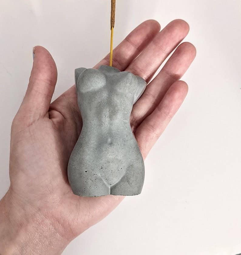 My name is Kim and I am the sole owner and creator at Femme in Flames LLC. I strive to make the best products I can and am always available to help with an order if needed. Before the world shifted in 2020, I was a full time musician. I street performed at a nightly sunset festival on Clearwater Beach year round and was beginning to secure monthly bar & restaurants gigs. I mostly sang Fleetwood Mac covers and Disney princess songs (the perfect combination, I know!), and I barely ever wore shoes, which was one of my favorite parts about working outside. When everything shut down I was a little unsure what to do next, as most of us were, and I spent my free time attempting to decorate cakes and make candles that looked like cups of coffee. It was when the cargo ships got stuck in the canal and glass candle containers became impossible to find at a reasonable price that I went to the store and picked up a bag of concrete. The rest just kind of fell into place! My goddess incense holders are geared towards being body positive and inclusive. They're my favorite items available in my shop and I plan to expand by the end of 2022 to incorporate more body types. We are all unique and beautiful individuals and I want these small statues to be a reminder of that every day.