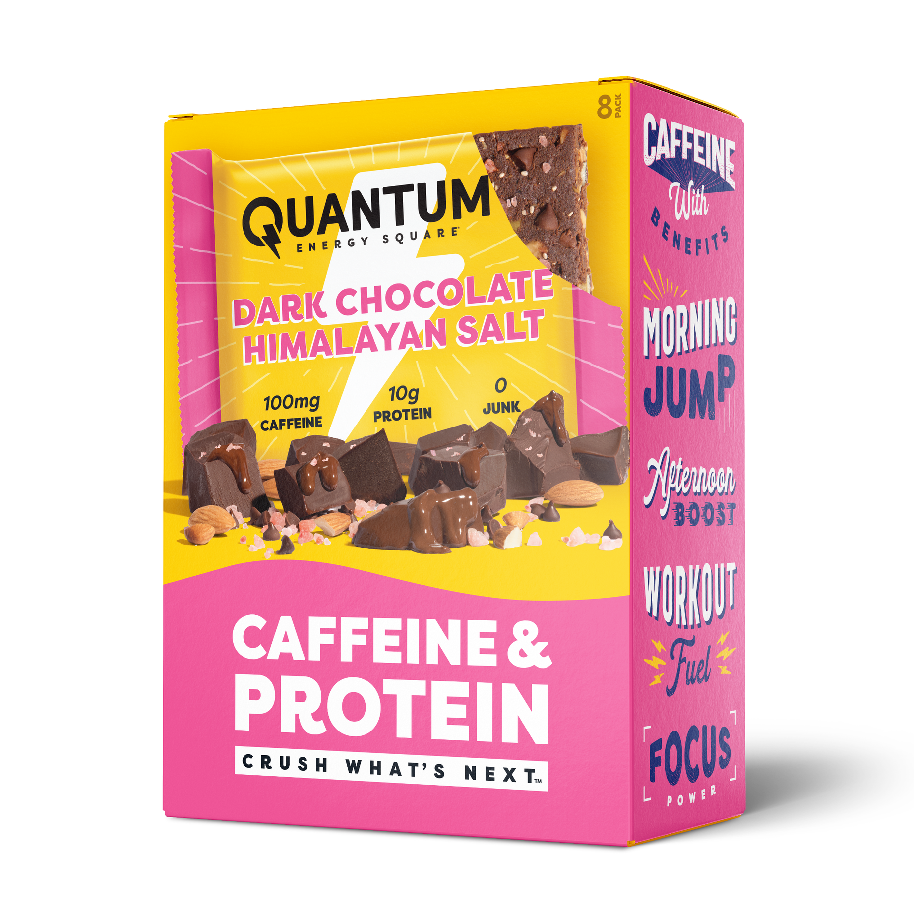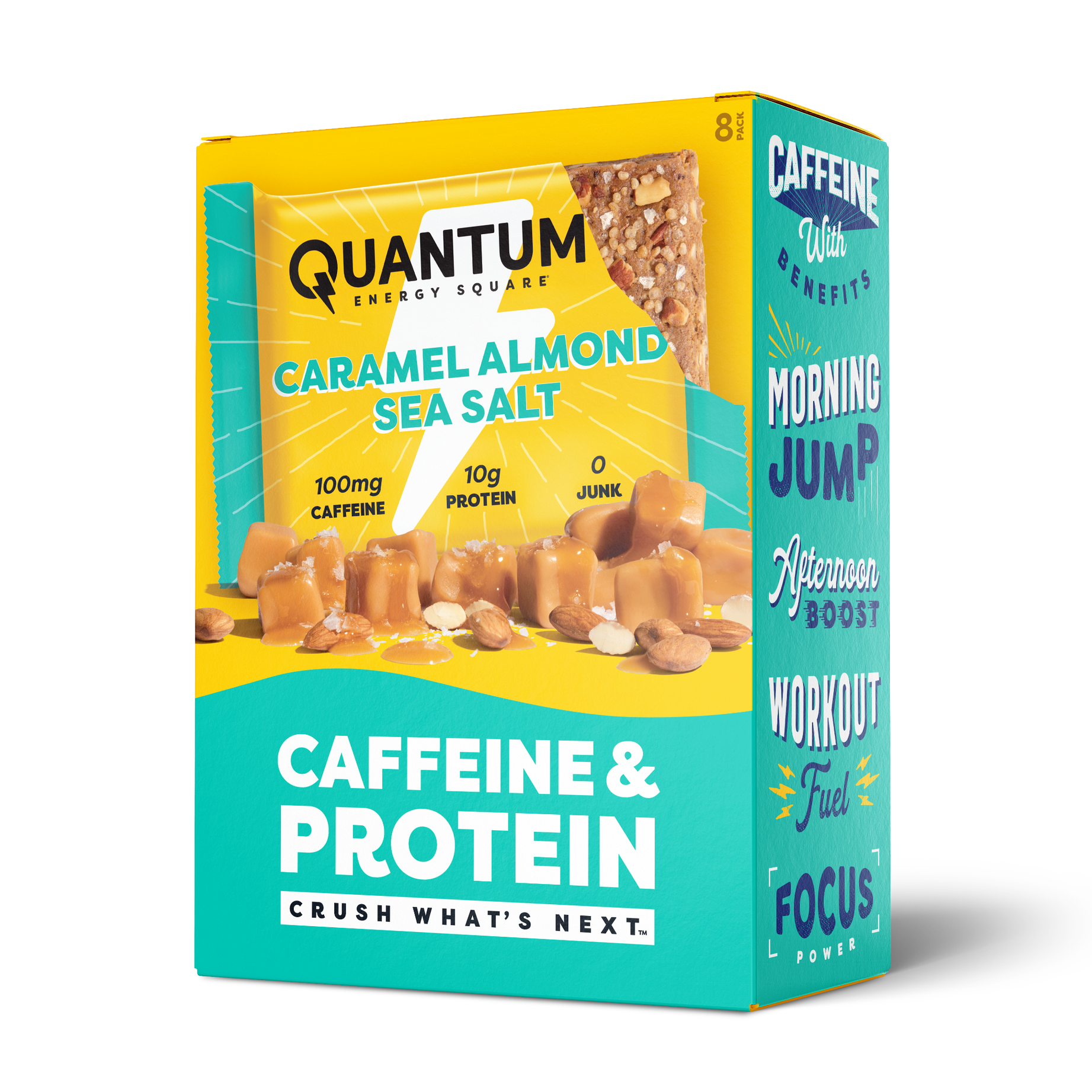 Meet the energy bar with caffeine & protein! Crush the Crash with 100mg of natural caffeine (equal to an 8oz coffee) and 10g of plant protein. Get the lift you love from an energy drink without the crash you hate. Perfect for exercising, mid-day snacking, work, school and travel. Certified Plant-Based, Gluten Free, Non-GMO Project Verified. No Dairy, Soy, Artificial Ingredients or Sugar Alcohols.