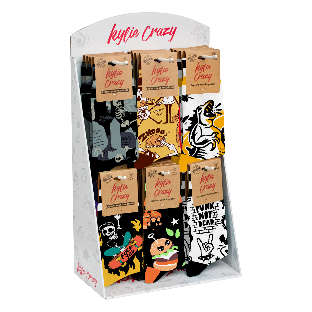 We are KYLIE CRAZY, an entrepreneurial and dynamic company, dedicated for 20 years to the creation and manufacture of different textile fashion accessories. With our experience and knowledge that online commerce represents the future, we decided to incorporate this fun project of Socks and other accessories that we propose here. Creativity, Design, Imagination and Quality will envelop your feet in a nice madness of color and dynamism. KYLIE CRAZY ALWAYS CREATING FOR YOU AND YOURS