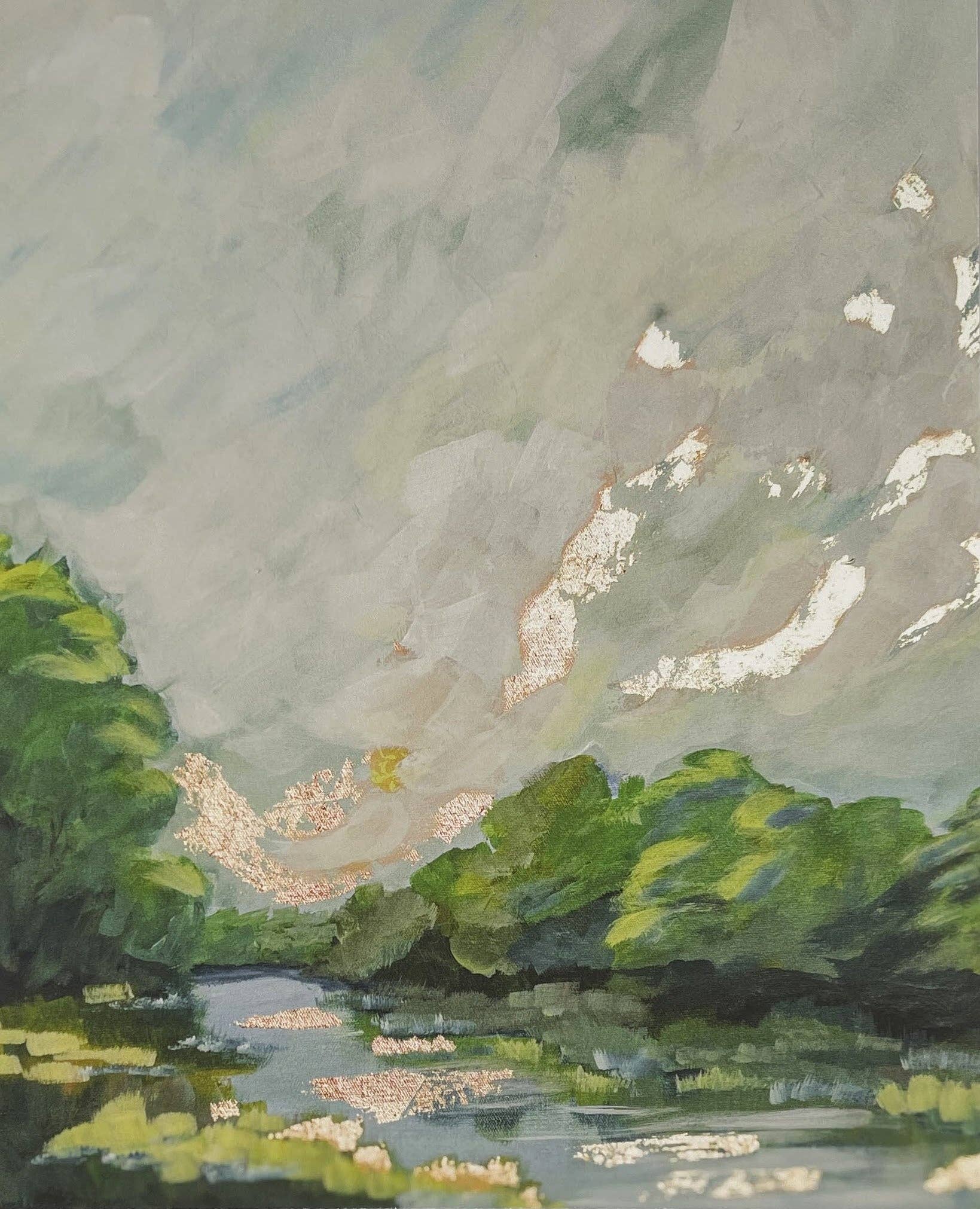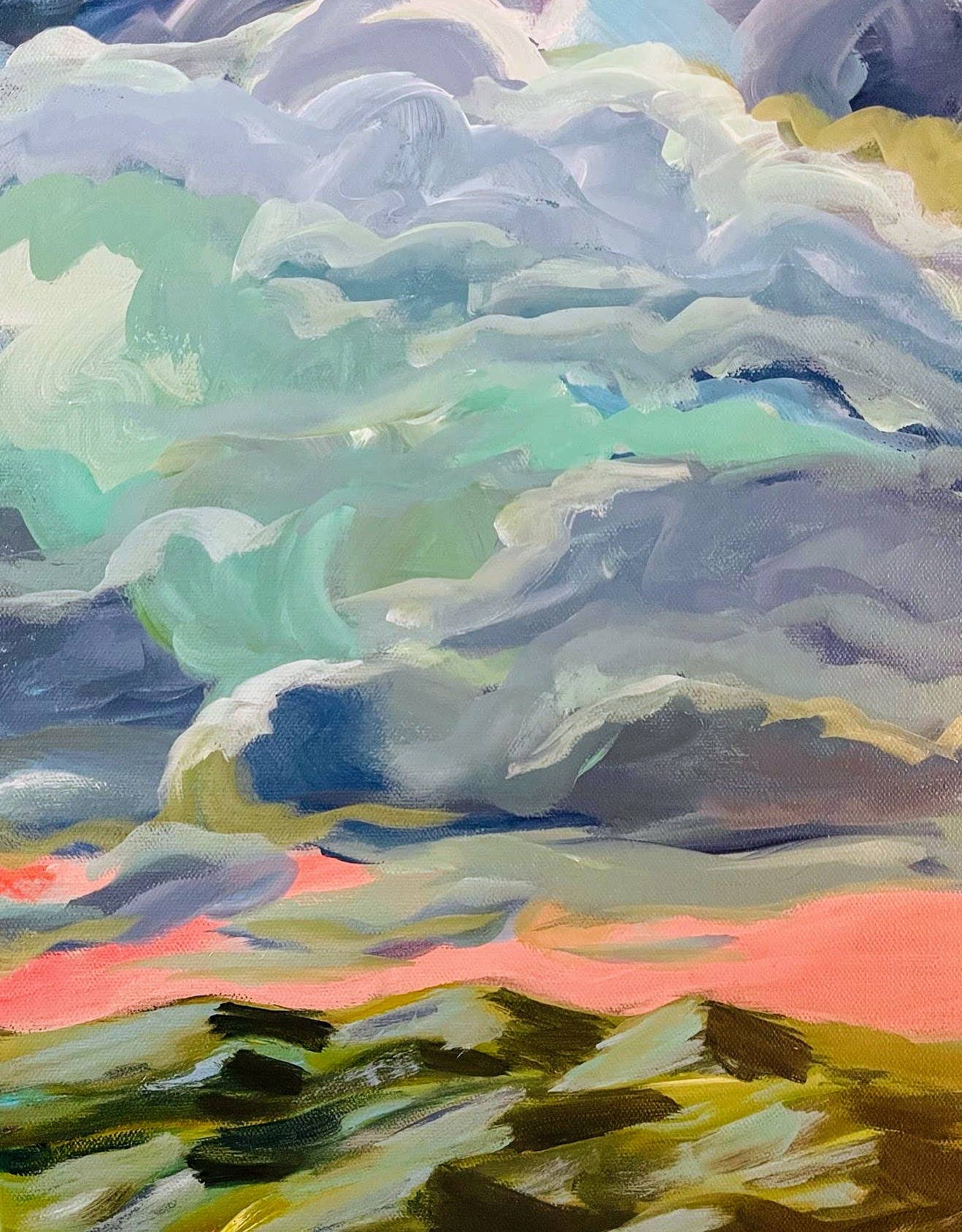 Sally J Goodrich uses acrylic paint to create colorful, sometimes, serene, sometimes lively landscapes and florals. Inspired by the beautiful blue ridge mountains of the Roanoke Valley and many summers spent in the Black Mountains of Asheville, NC, her landscapes are lush, vibrant and friendly. She loves to represent the beauty and every changing colors of even the most plain outstretched field. Her florals consist of familiar flowers usually in ginger jars, painted with blue chinoiserie figures. She takes ample liberties with color and tries to create her best impressionist/fauve or fauve/impressionist style of work. Hydrangeas are her favorite but all native flowers (and a few imagined) can make an appearance in these lush loose arrangements. Between the skies, the mountains, the plant life and the fields she is never at a loss for inspiration.