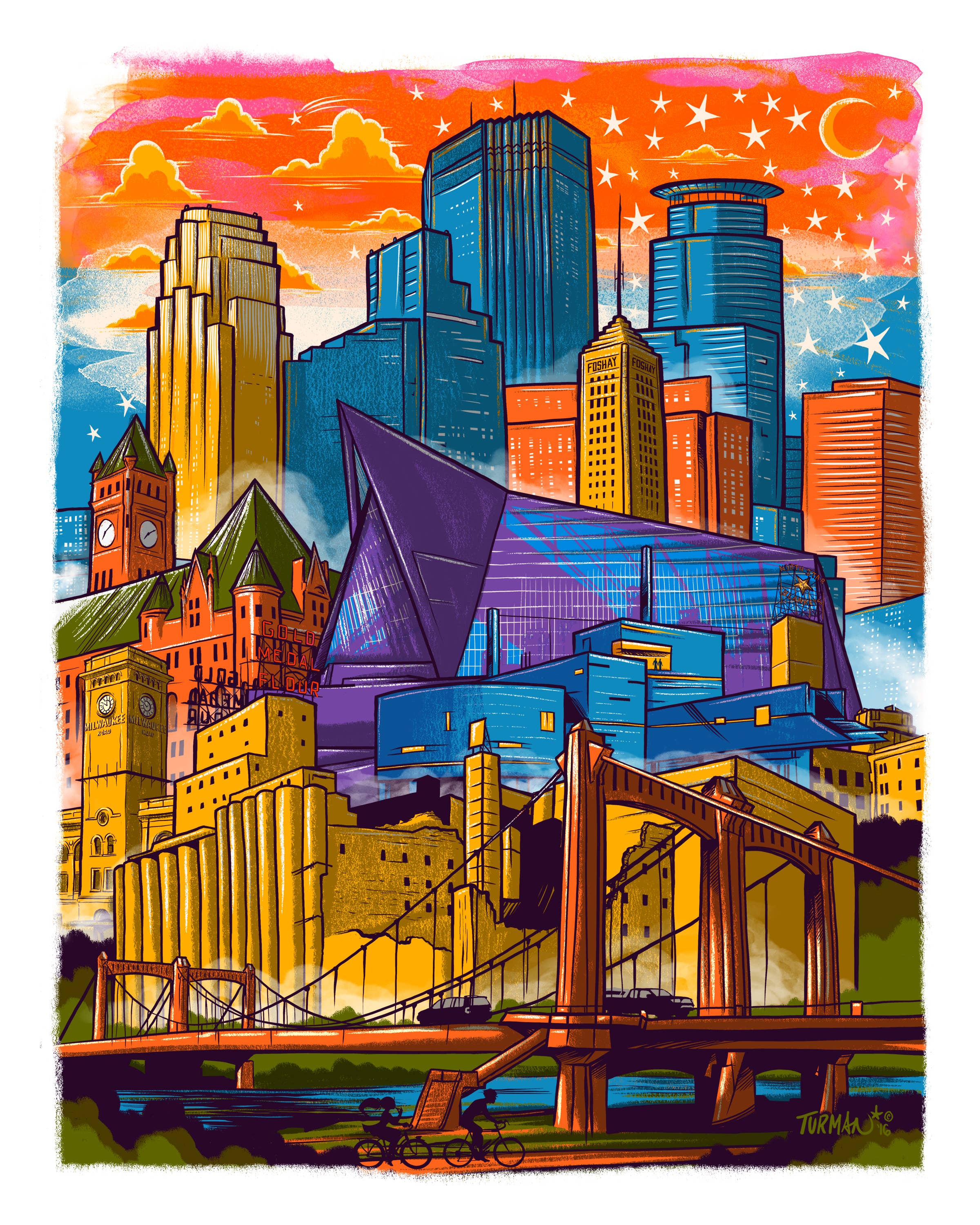 ADAM TURMAN is an artist, muralist, and screen printer, from Minneapolis, MN. His bold style offers colorful takes on beloved landmarks, the great outdoors, and riffs on our everyday. Adam’s murals can be found throughout the Midwest, and his screen prints in private collections worldwide. He works with major brands, independent businesses, and private collectors to make art part of our every day. Adam grew up in the Twin Cities and got his start as an artist by making gig posters for bands coming through popular Twin Cities venues. He drew influence from the bold, graphic style of 80s art and comics. Adam started his professional studio practice in 2003, and since then has become one of Minnesota’s most popular artists. Approaching projects from a graphic design perspective, Adam connects with art lovers through his collection of colorful art screen prints and creates commissioned pieces in the form of illustrations, murals, paintings and other custom projects. Clients use his work to advertise events, connect with local audiences, and celebrate their organizations. He has worked with businesses including Indian Motorcycles, Founders Brewing, Beam Suntory, SPAM/Hormel, Minnesota State Fair and the Children’s Hospitals of Minnesota, just to name a few.