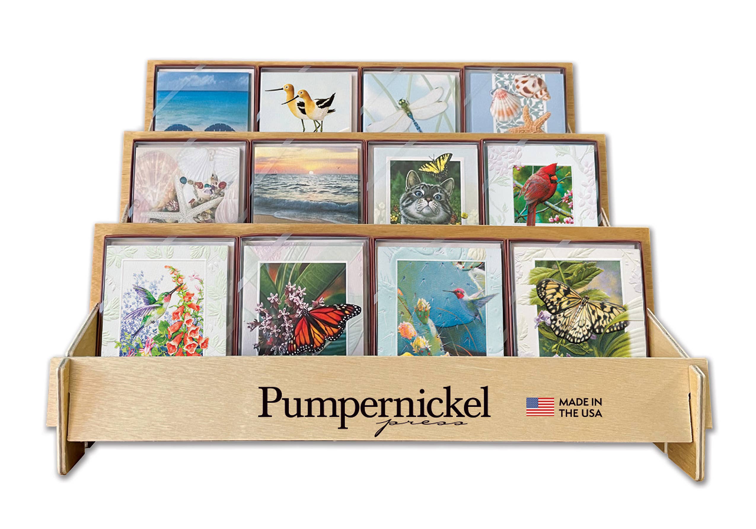Welcome to Pumpernickel Press! For over 25 years, we have been producing high-quality American-made greeting cards designed to delight both the giver and recipient. Our specialty is richly detailed sculptural embossing, unmatched in the industry, and brilliant color printing on uncoated textured paper. This combination brings every card to life and is the key to their success. We use only premium uncoated eco-friendly paper, containing 30% post-consumer waste and 70% fresh paper from sustainably managed forests.