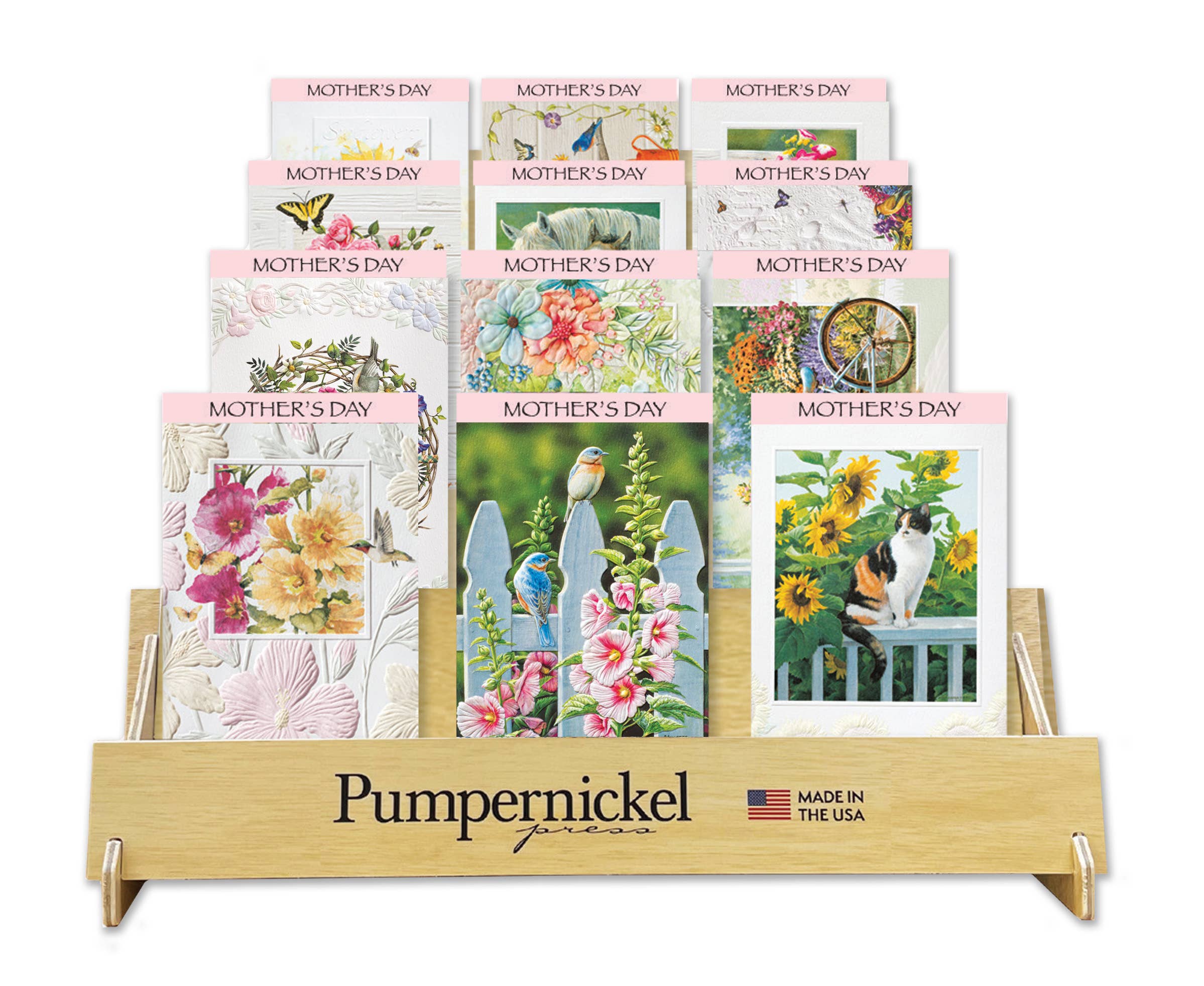 Welcome to Pumpernickel Press! For over 25 years, we have been producing high-quality American-made greeting cards designed to delight both the giver and recipient. Our specialty is richly detailed sculptural embossing, unmatched in the industry, and brilliant color printing on uncoated textured paper. This combination brings every card to life and is the key to their success. We use only premium uncoated eco-friendly paper, containing 30% post-consumer waste and 70% fresh paper from sustainably managed forests.