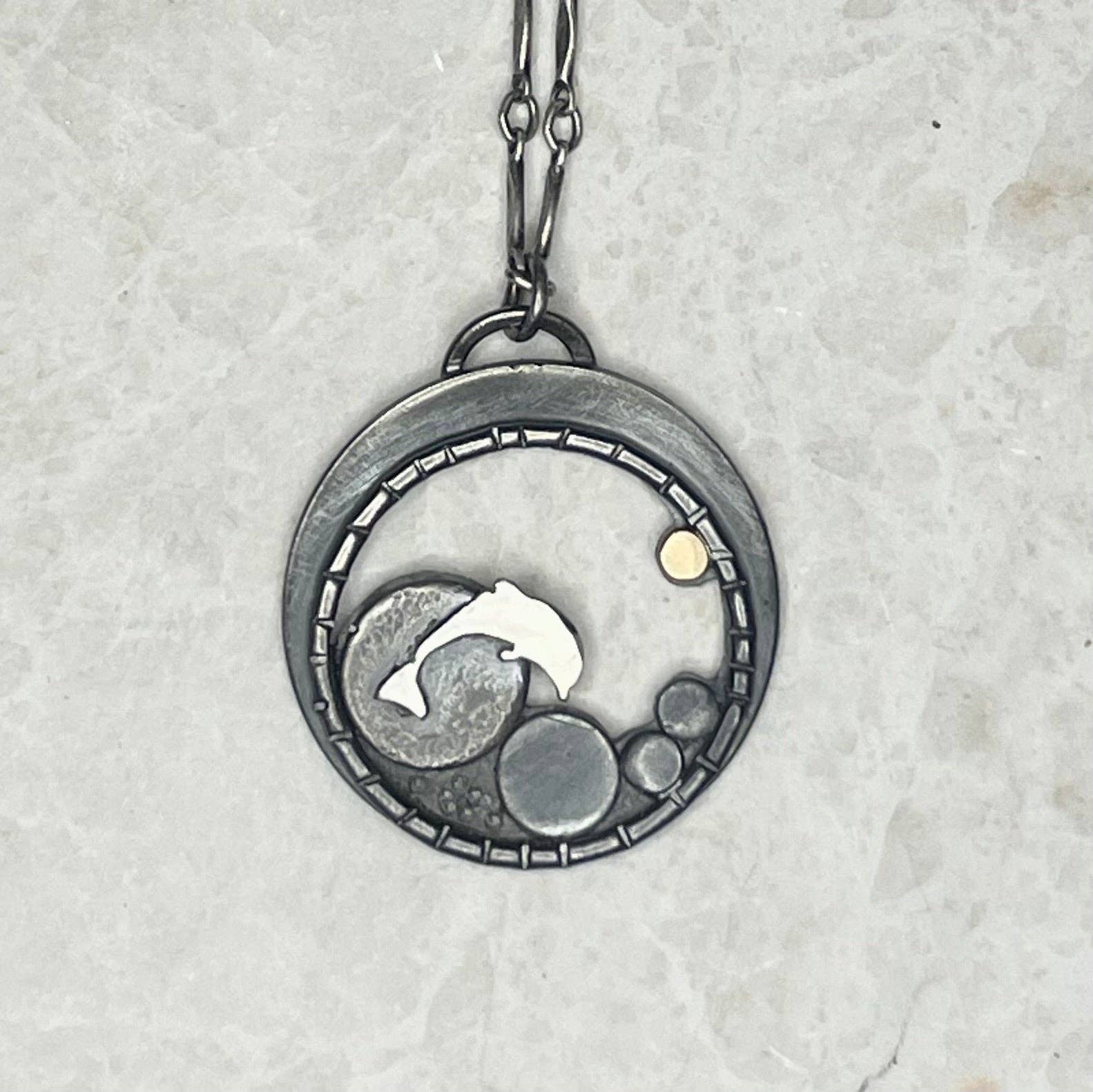 I grew up under the watch of large abstract canvases painted in ethereal, alluring color combinations like aubergine and golden flax, sienna and cerulean. The smell of oil paint and the tacky feel of the a drying palette piqued my senses. These are the nostalgic touch points of my childhood. My father was a fine artist and our cedar-paneled basement was where he spun his art. Burlap paint-stained cloths thrown over card tables, a dark-wood easel, and makeshift repurposed finds furnished this space that I now recall so fondly. It took many years – 30-some – for the creativity he passed on to me, to manifest in what is now my alter ego: Alison Blair Studio Metal Works. My father’s mantra: “Simplicity is the key to beauty” guides my hand as I etch, saw, solder, and form metal into unique and lovely jewelry designs and accessories. Mountain necklaces, whimsical dog-themed accessories, geometric earrings, and sometimes slightly-political statement pieces are just a sampling of what you’ll find when you visit my booth – a space that recalls my father’s studio of my childhood, with beetle-kill tables and stained wood boxes and handmade displays. Small, delicate designs fashioned in sterling silver or 14KT gold, are created to capture a moment, a place, or a feeling – one that will emotionally connect with its wearer. Alison Blair Studio reflects what is unique to its owner. Beautiful art, like beautiful people, doesn’t have to scream out for attention, it just is. Simply.