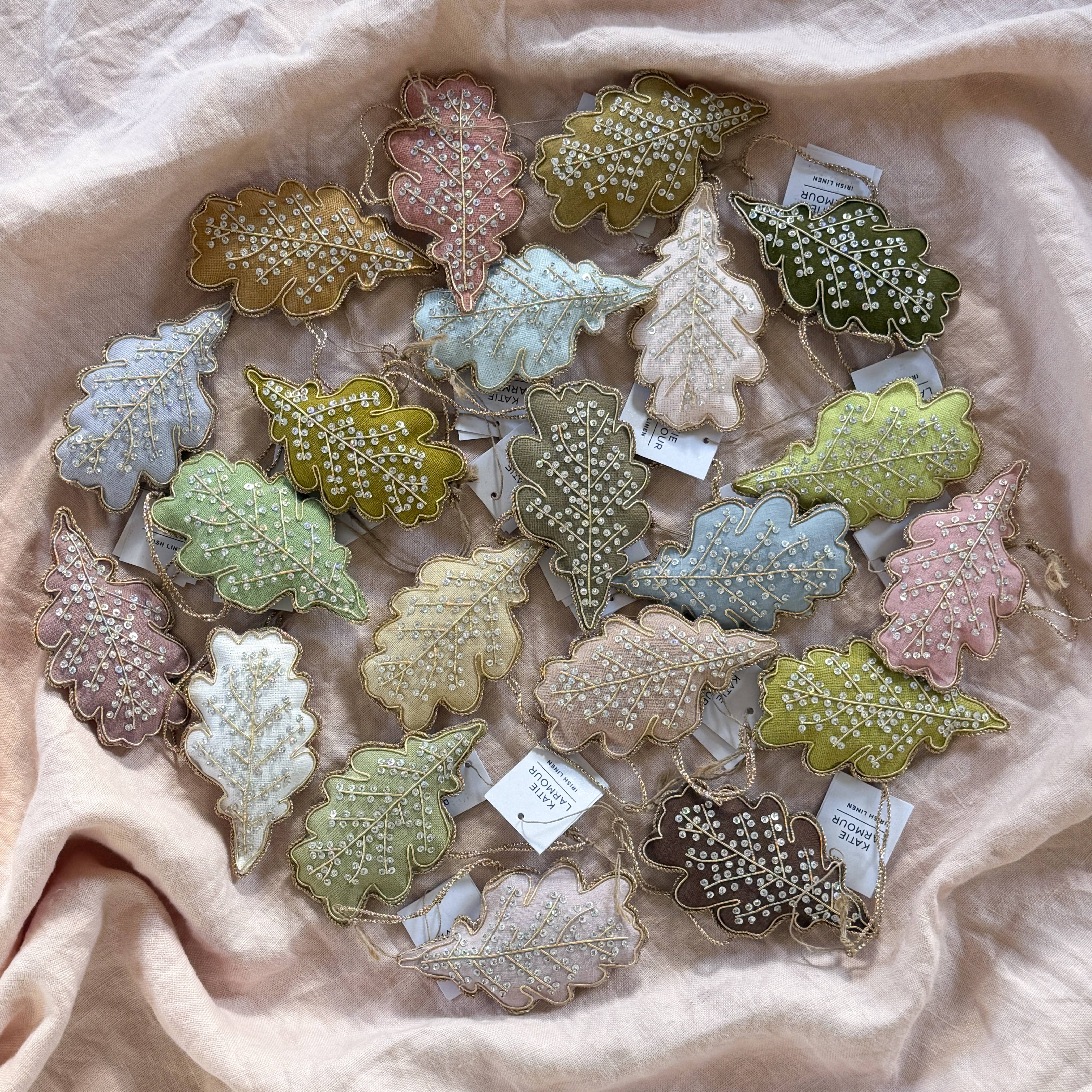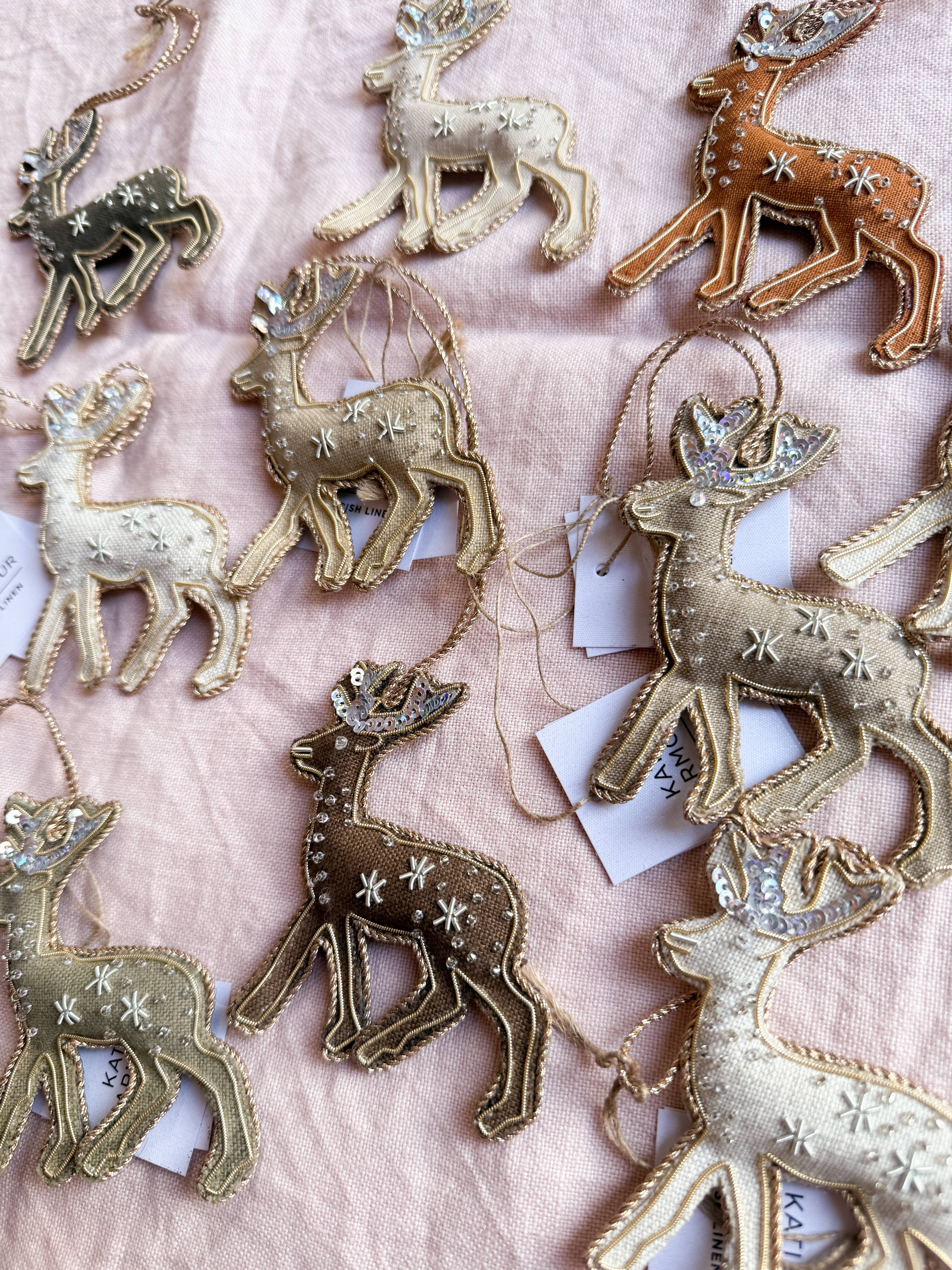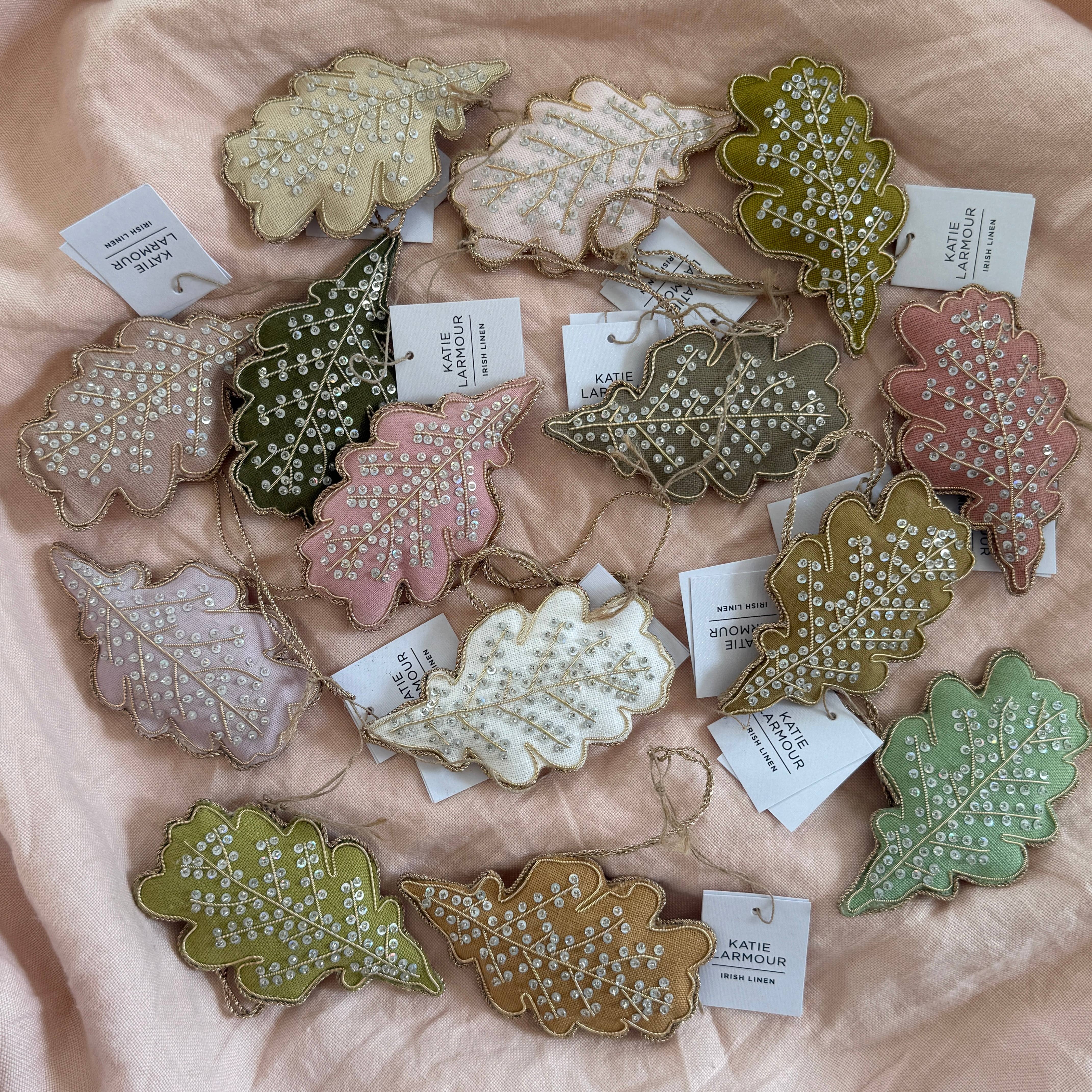 Katie Larmour, designer and founder: Irish linen has always been around me, from my childhood in Ireland right through to the present day, from unknowingly sitting on an old spinning stool as a child in my grandmother’s house to eating off her intricately patterned damask tablecloth.Growing up I could see a host of huge linen mills and factory chimneys across the city skyline. Today our studio is based in Belfast and we ship our luxury Irish Linen all over the world. Made from the flax plant, Irish Linen is also an eco-friendly, sustainable alternative to fabrics that use fertilisers and pesticides, it needs little water and the whole plant is used making it a waste free crop - basically grown as a weed it is transformed into utterly beautiful premium cloth. These unique festive ornaments and souvenirs are made in a mixture of countries, and that’s what makes them unique. As our brand has grown we have outsourced some of our making. For clarification these little beauties are a combination of the following: Irish fabric (a mixture of recycled off cuts from our cushion making, local mill deadstock, vintage finds and repurposed antique tablecloths and napkins found in local auction houses), some organic batches, designed in Northern Ireland by artist Katie Larmour (original and copyrighted), hand embroidered in India using a traditional zari technique by a small team of selected artisan makers who we work closely with, then finished and packaged in Ireland. Ethically made.